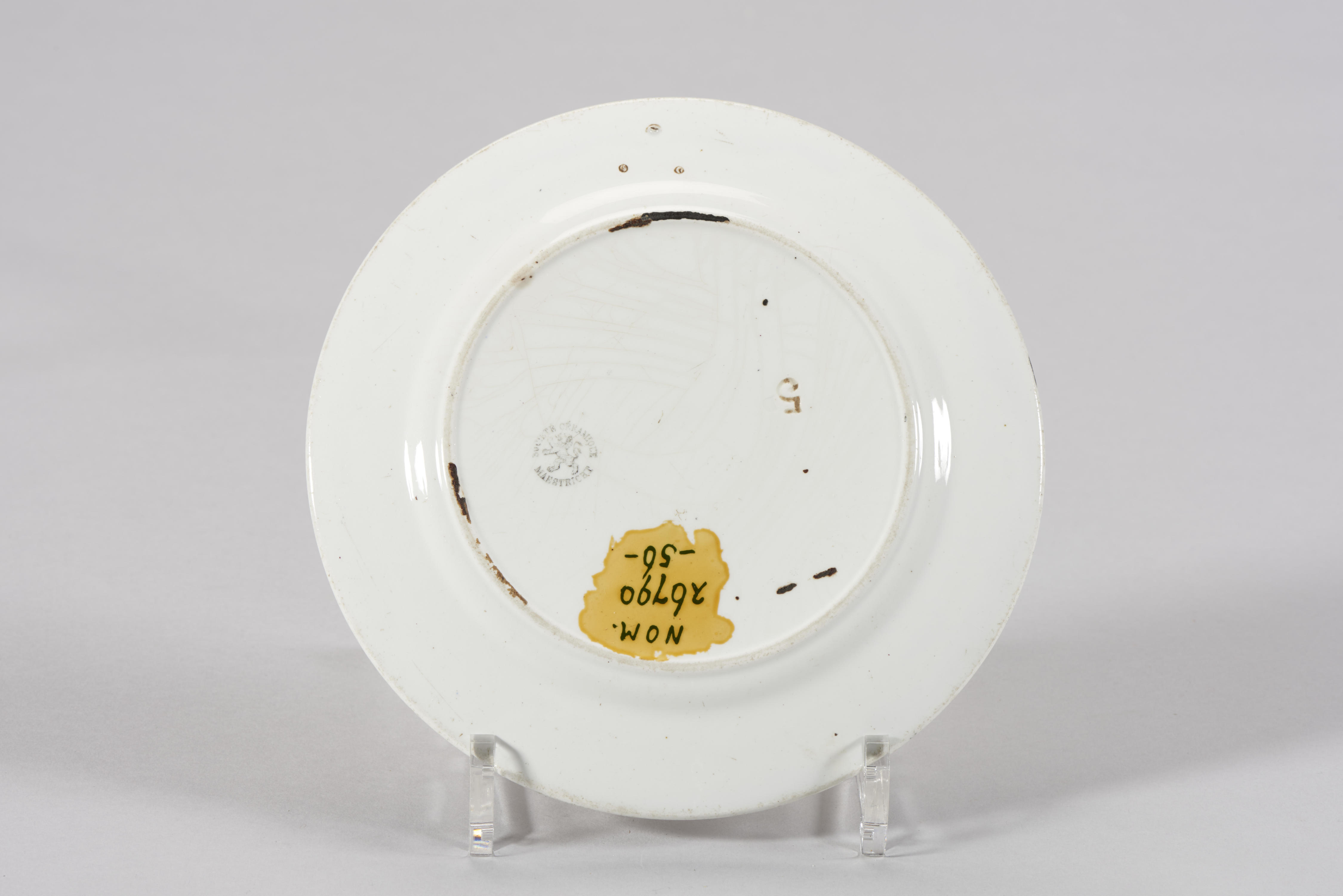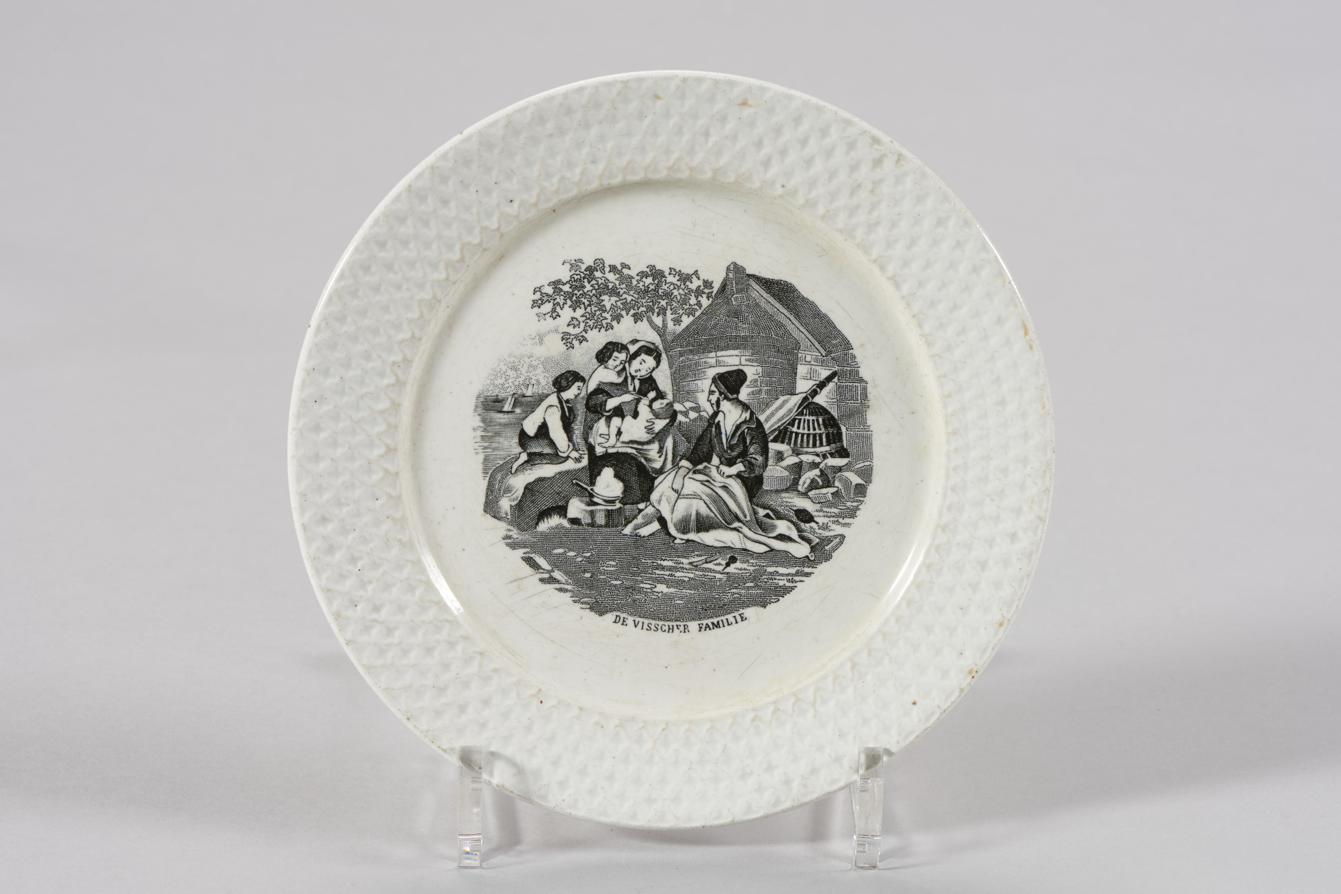 Bord met de voorstelling van een vrouw, man en drie kinderen. Het onderschrift luidt: 'De Visscher Familie'.