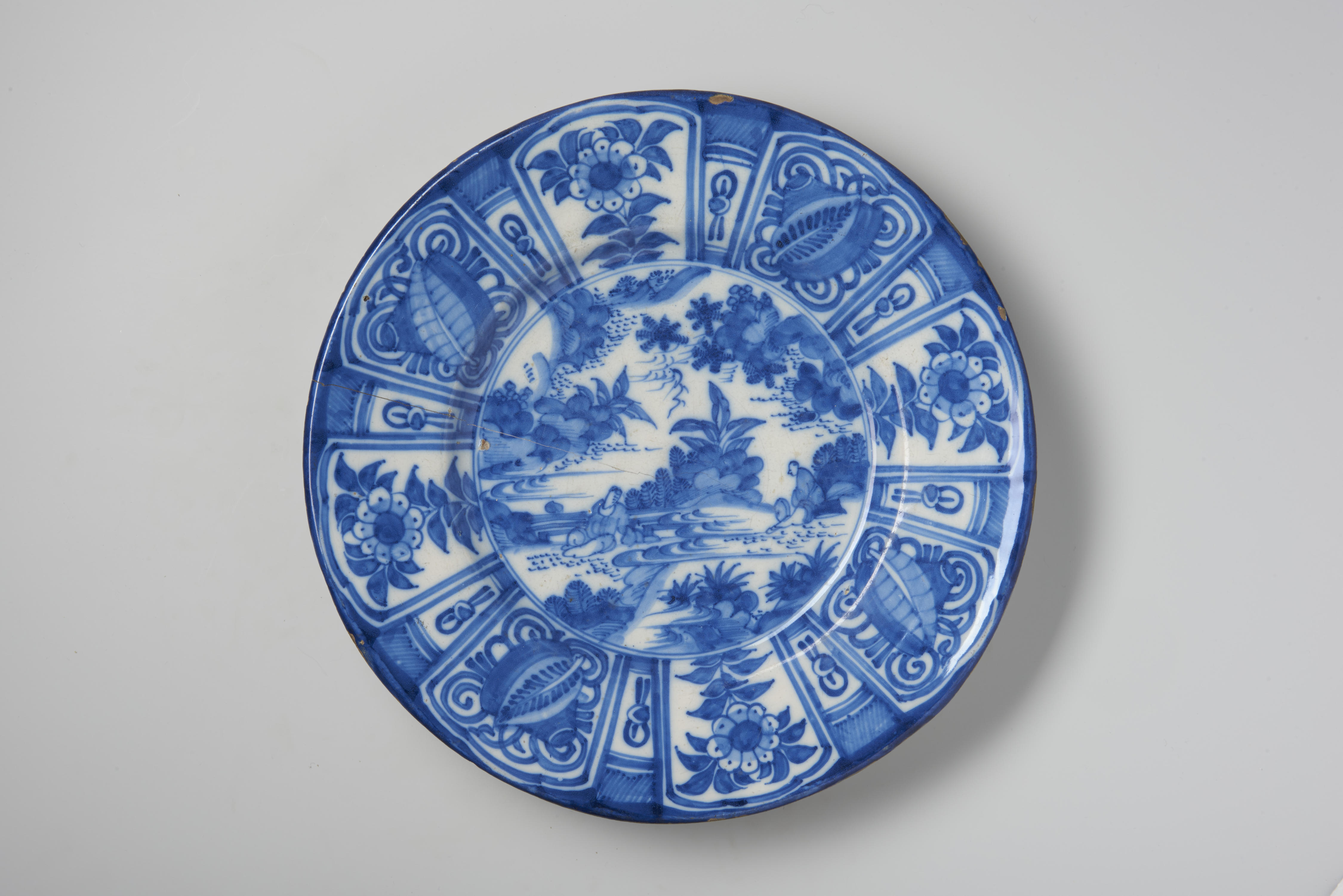 Schotel met een randversiering van gecompartimenteerde ornamenten geïnspireerd door voorbeelden op kraakporselein. Op het middenvlak staan twee personen in een met planten en waterpartijen gestoffeerd landschap afgebeeld.