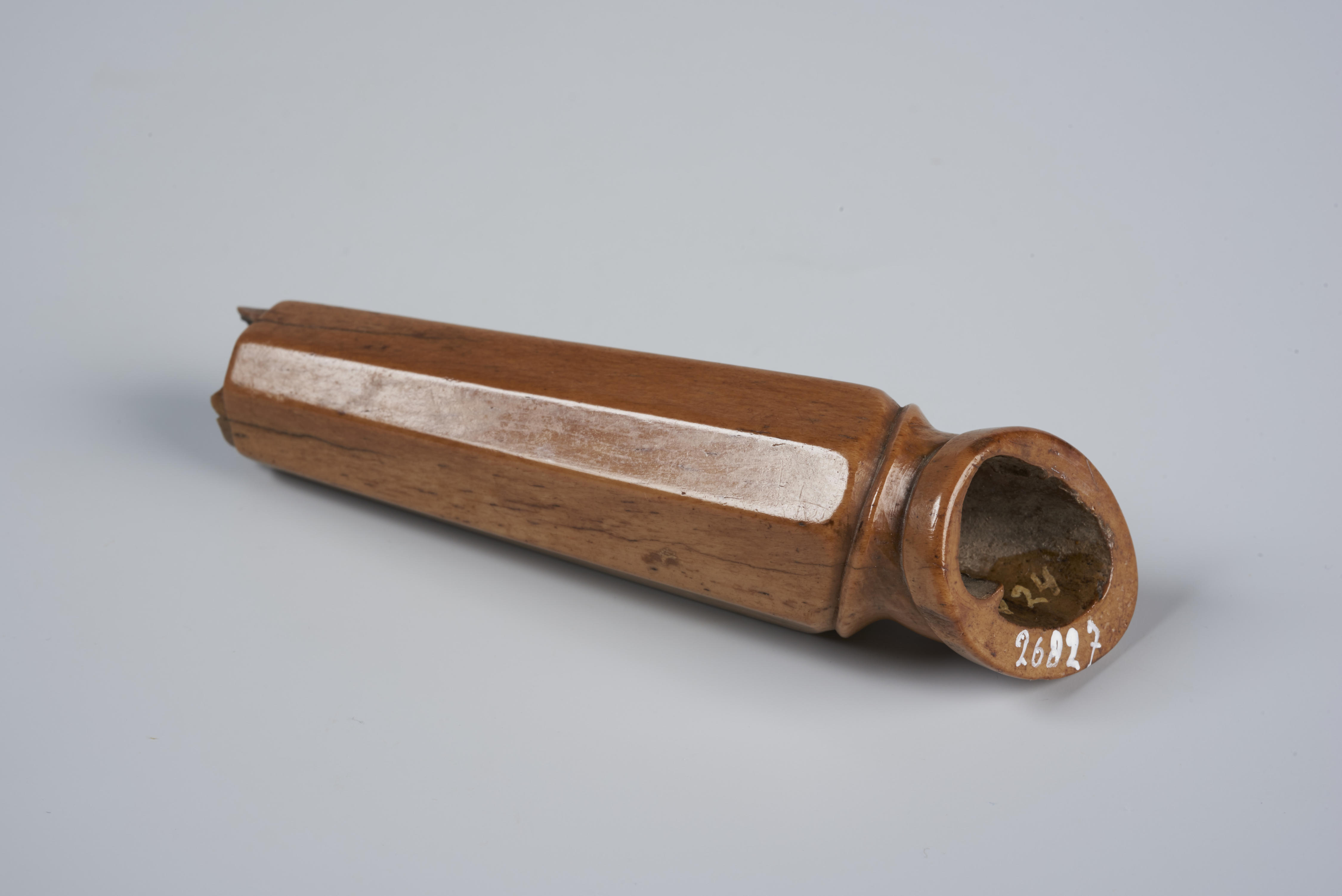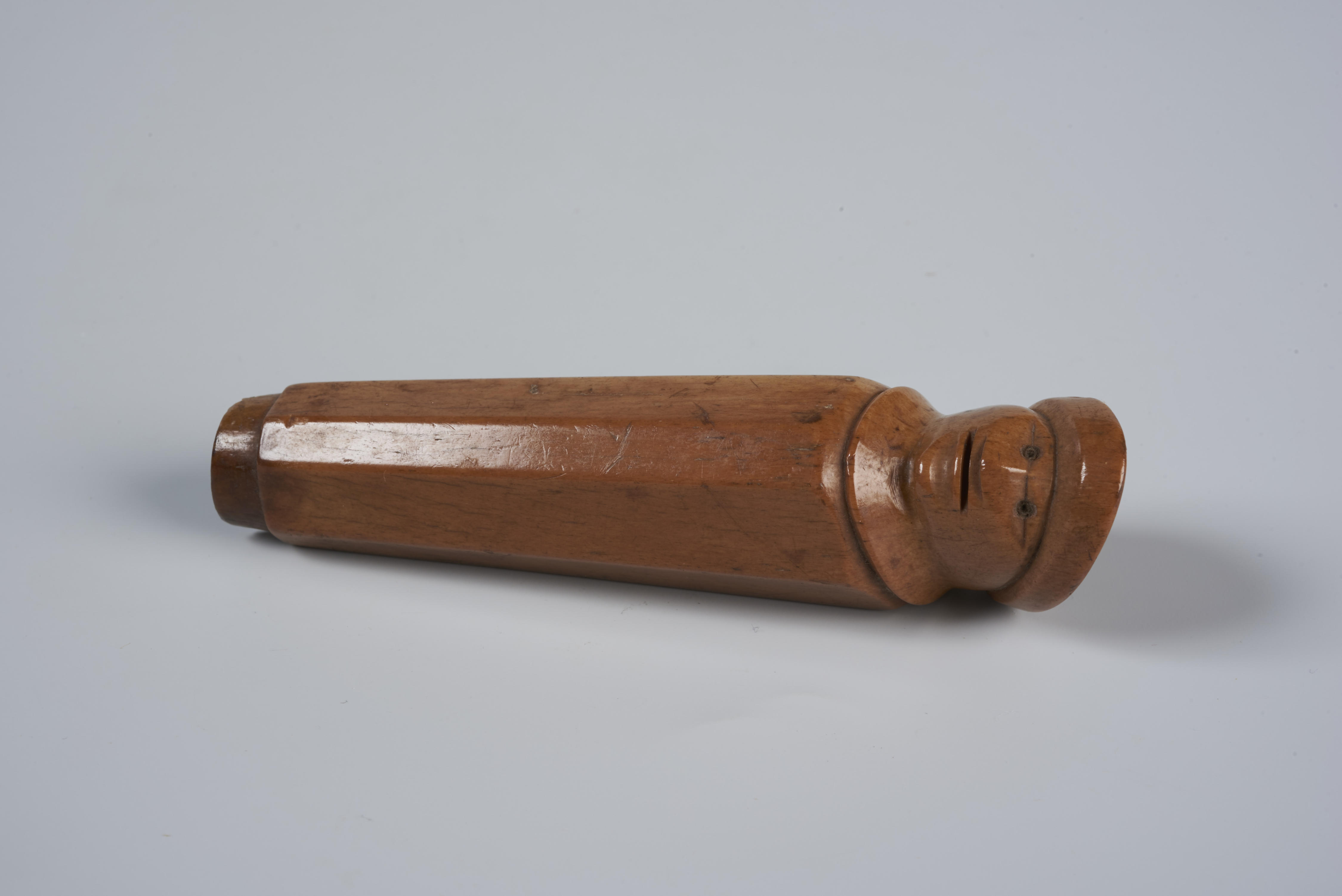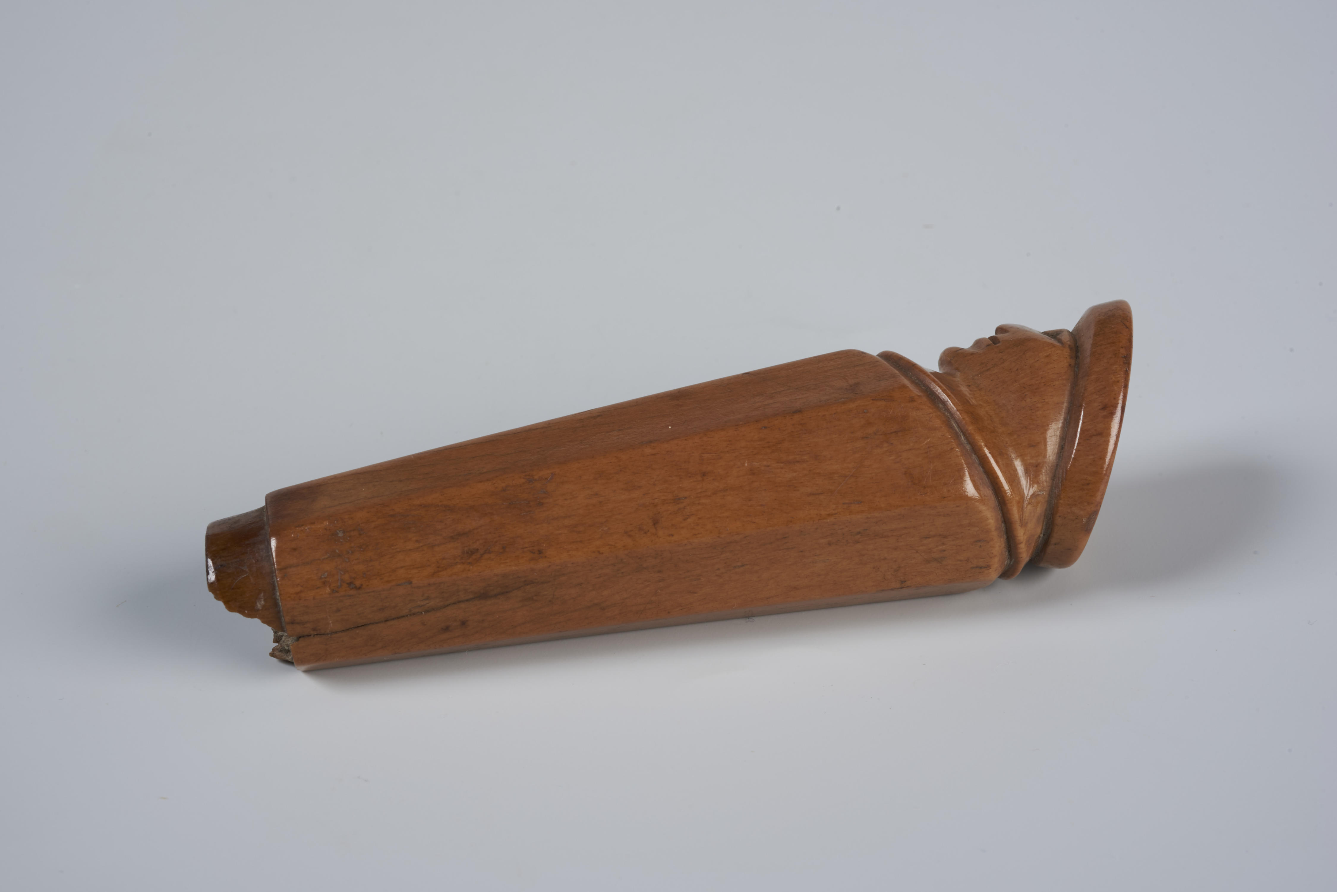 Hoornen mesheft in de vorm van een borstbeeld van een man met een muts.