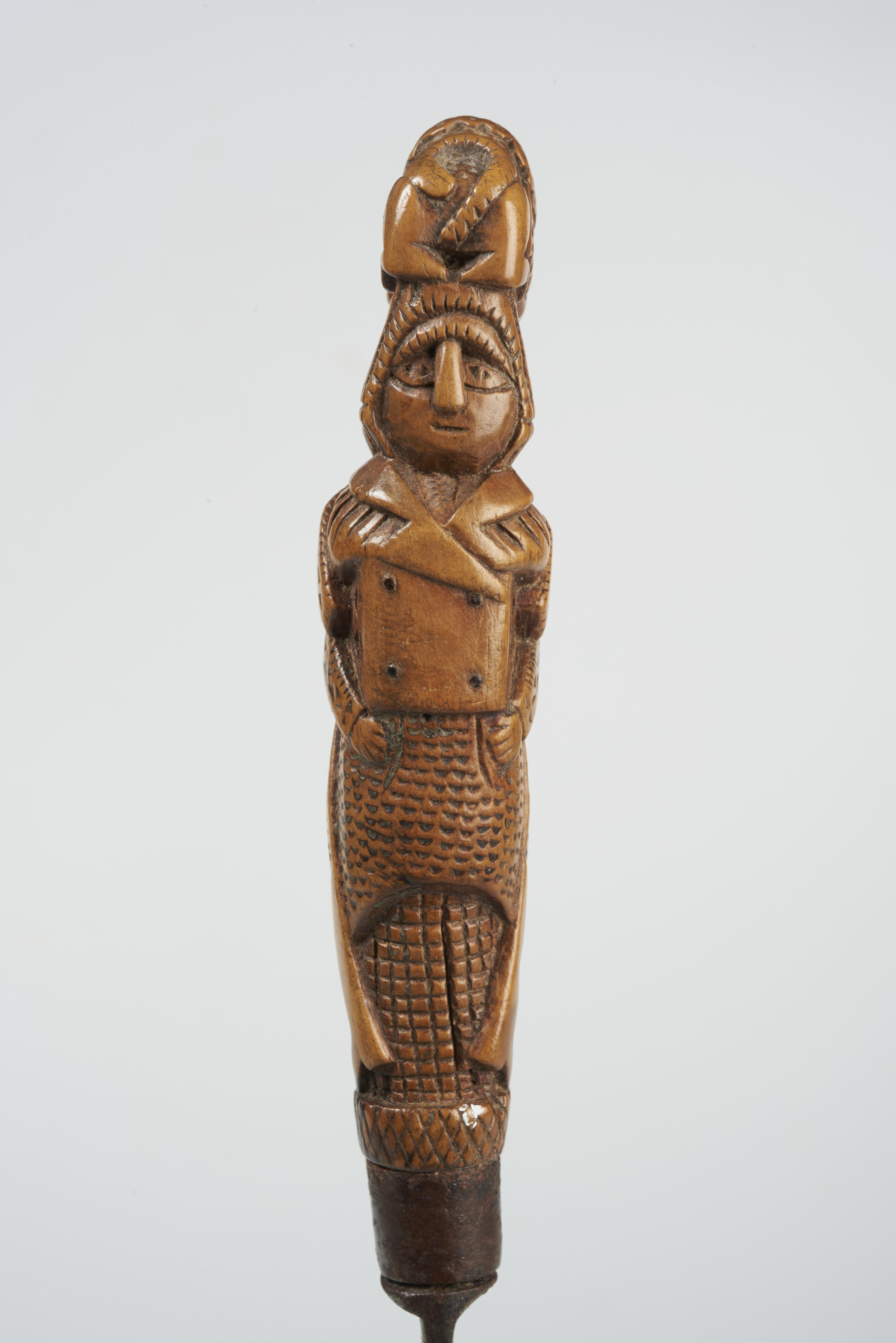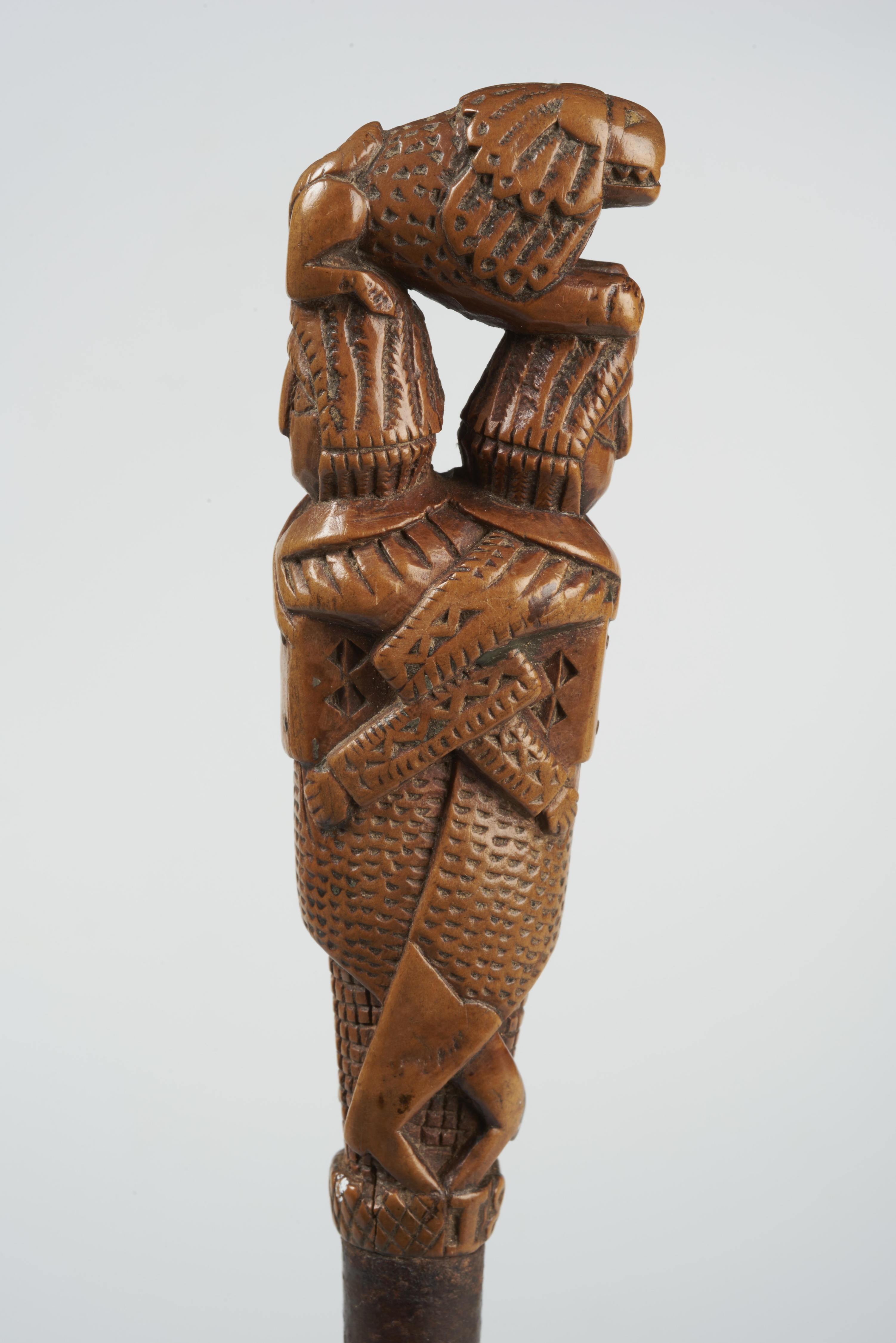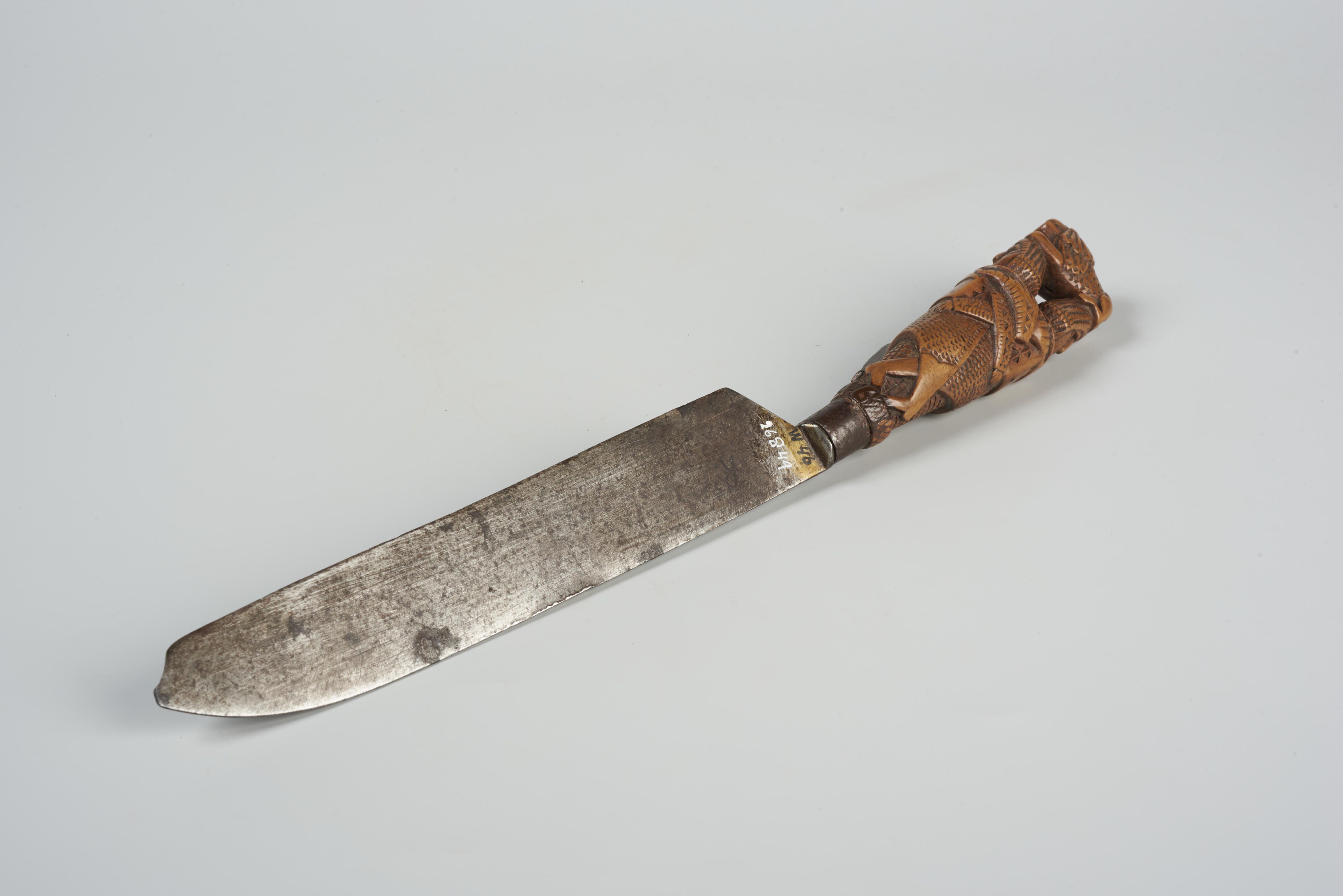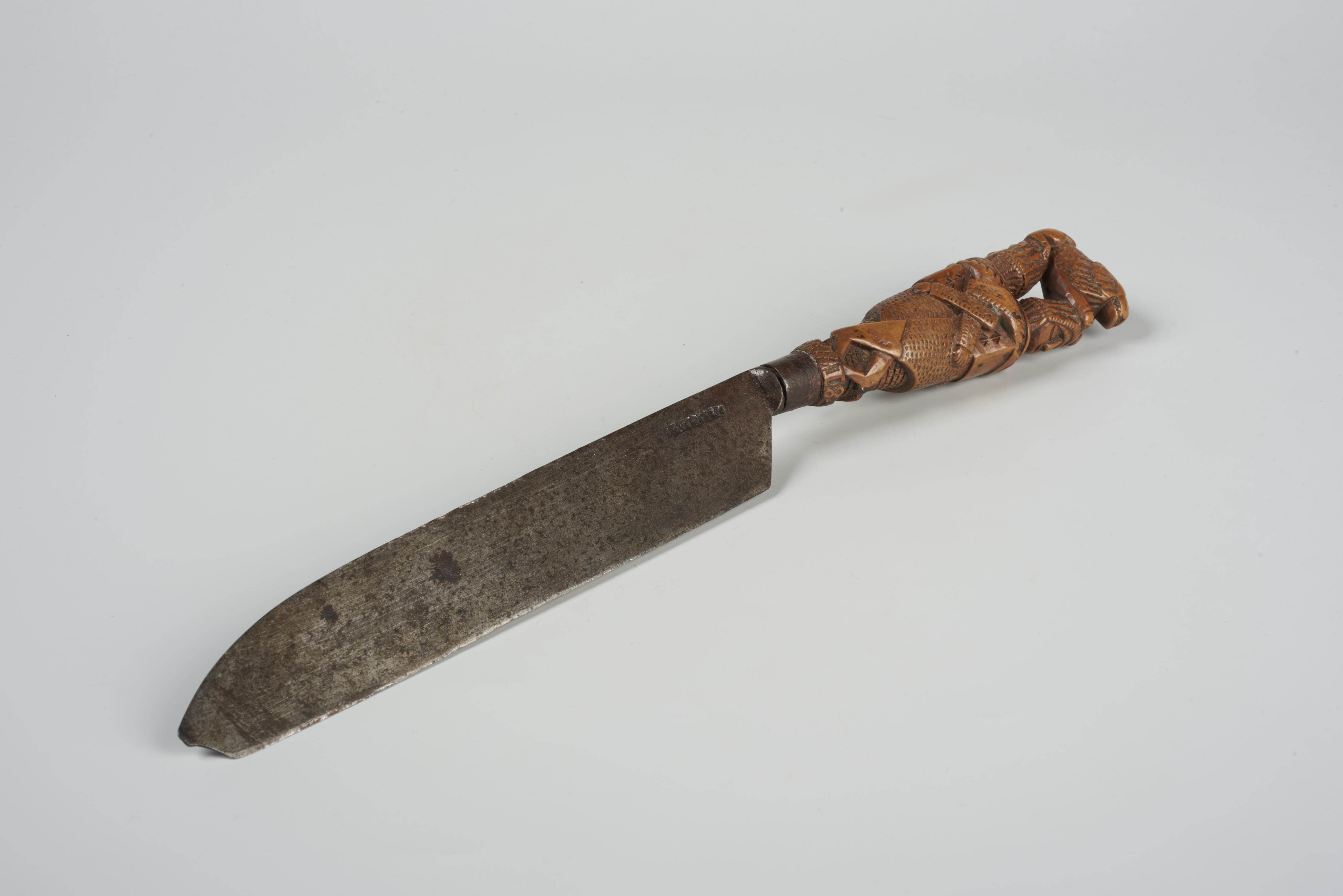 Mes met houten mesheft in de vorm van twee ruggelings arm in arm gehaakte mannen. Op hun hoofden rust een liggende leeuw. Aan de onderrand van het heft staat het jaartal 1846.