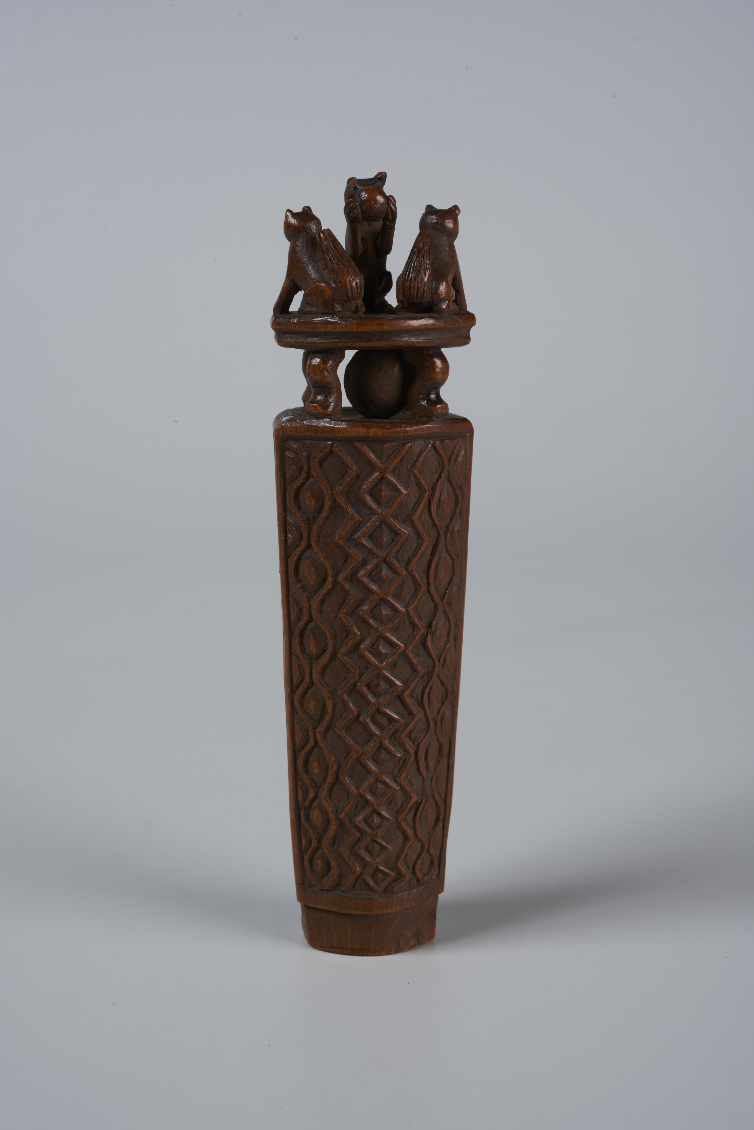 Houten heft met een bekroning in de vorm van drie eekhoorns op een tafel. De poten van de tafel vormen een kooi waarin een bolletje zit. Het heft is verder versierd met kerfsnijwerk en is afkomstig uit Arnhem.