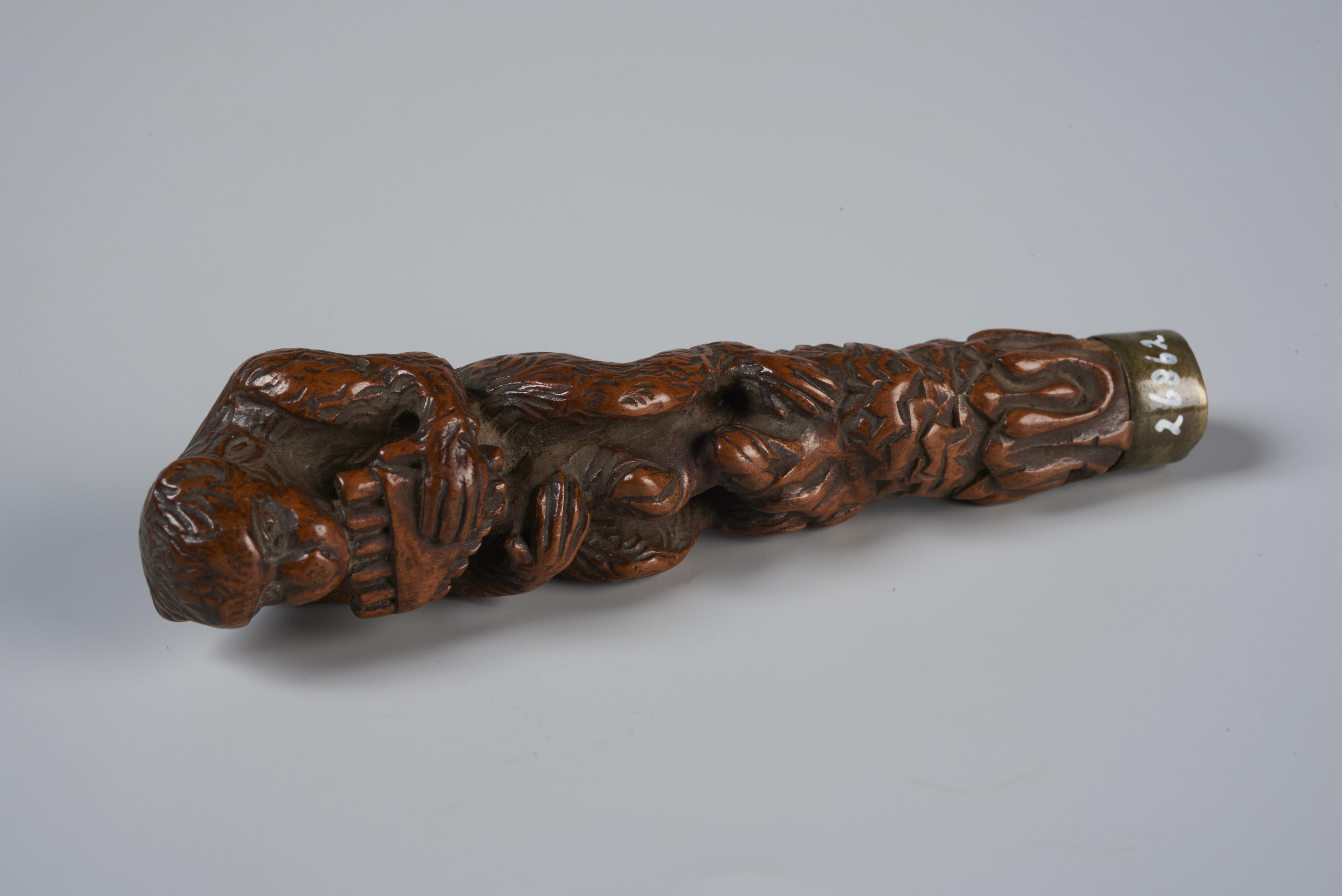 Mesheft in de vorm van een aap die op een boomstam zit en op een panfluit speelt.
