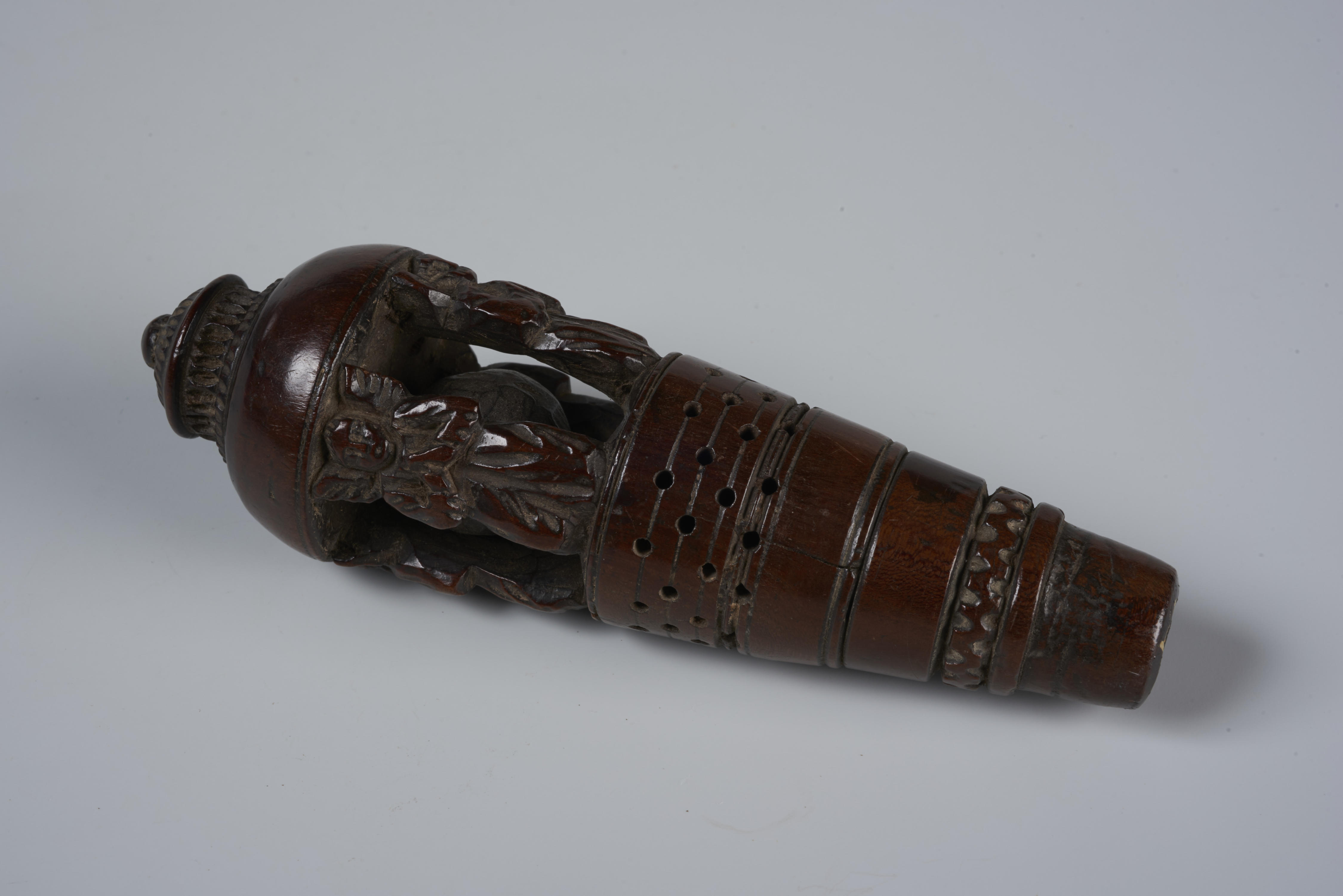Houten heft. Boven een busje met gaatjes dat afschroefbaar is, staat een kooi waarvan de stijlen aanbiddende engelen zijn. In de kooi zit een bolletje. De bekroning van het heft is een korfornament. Het heft is gevonden in Utrecht.
