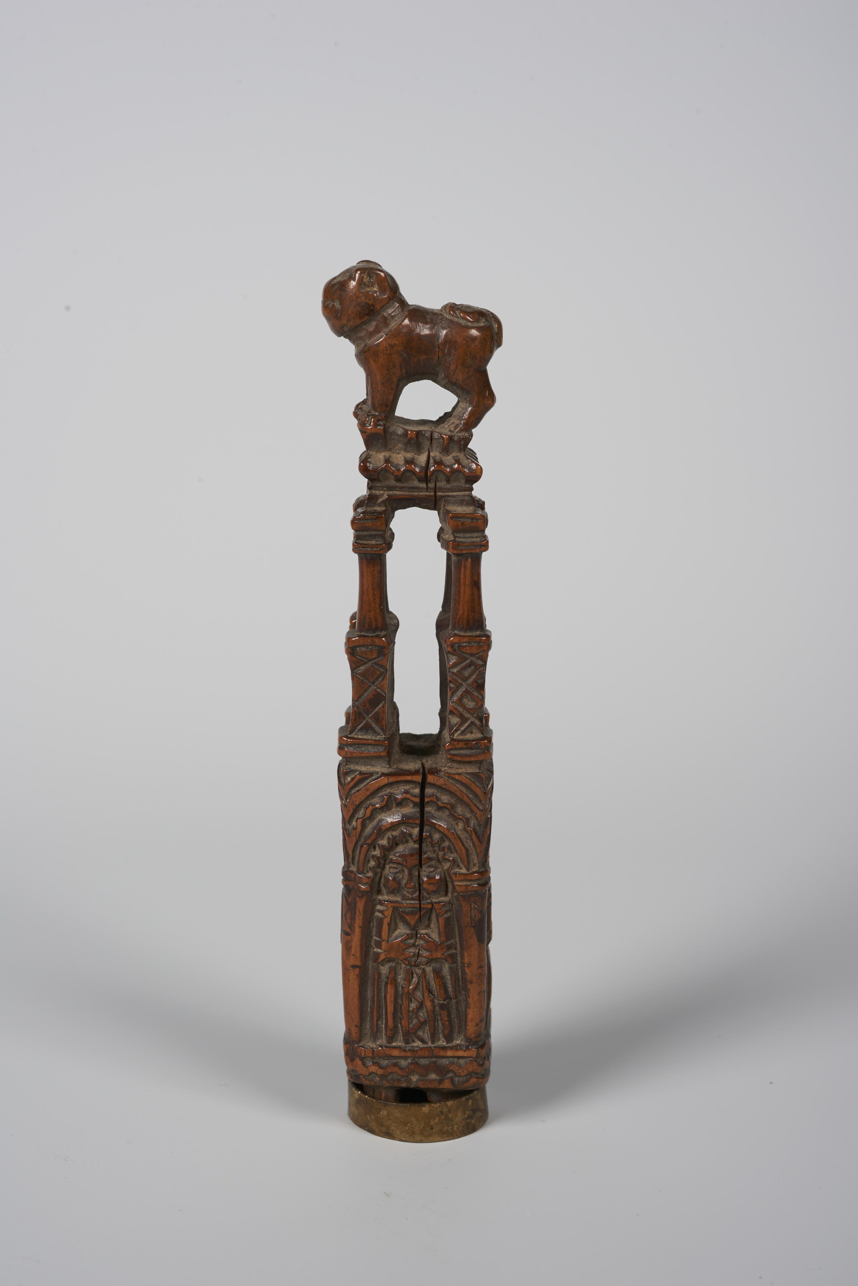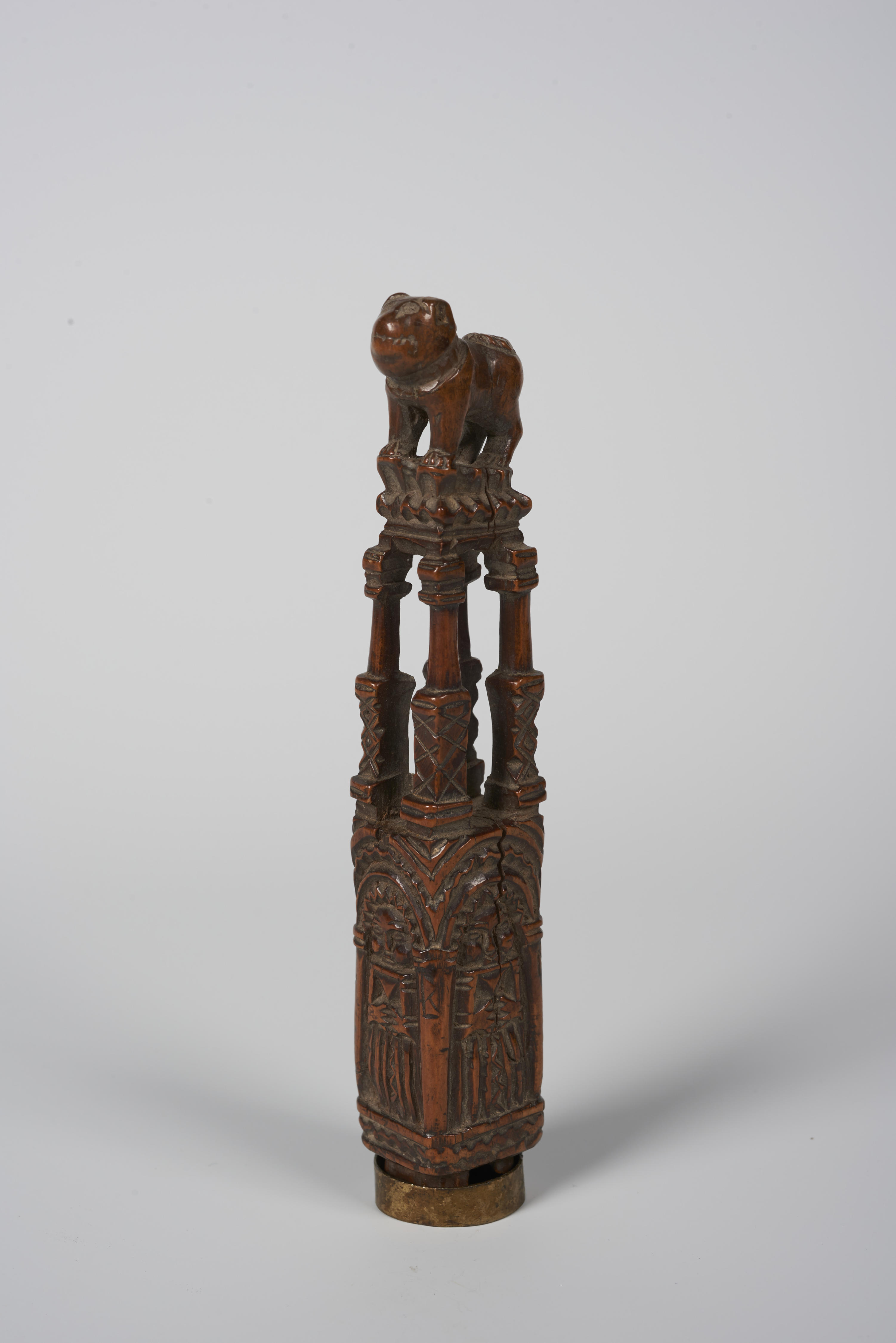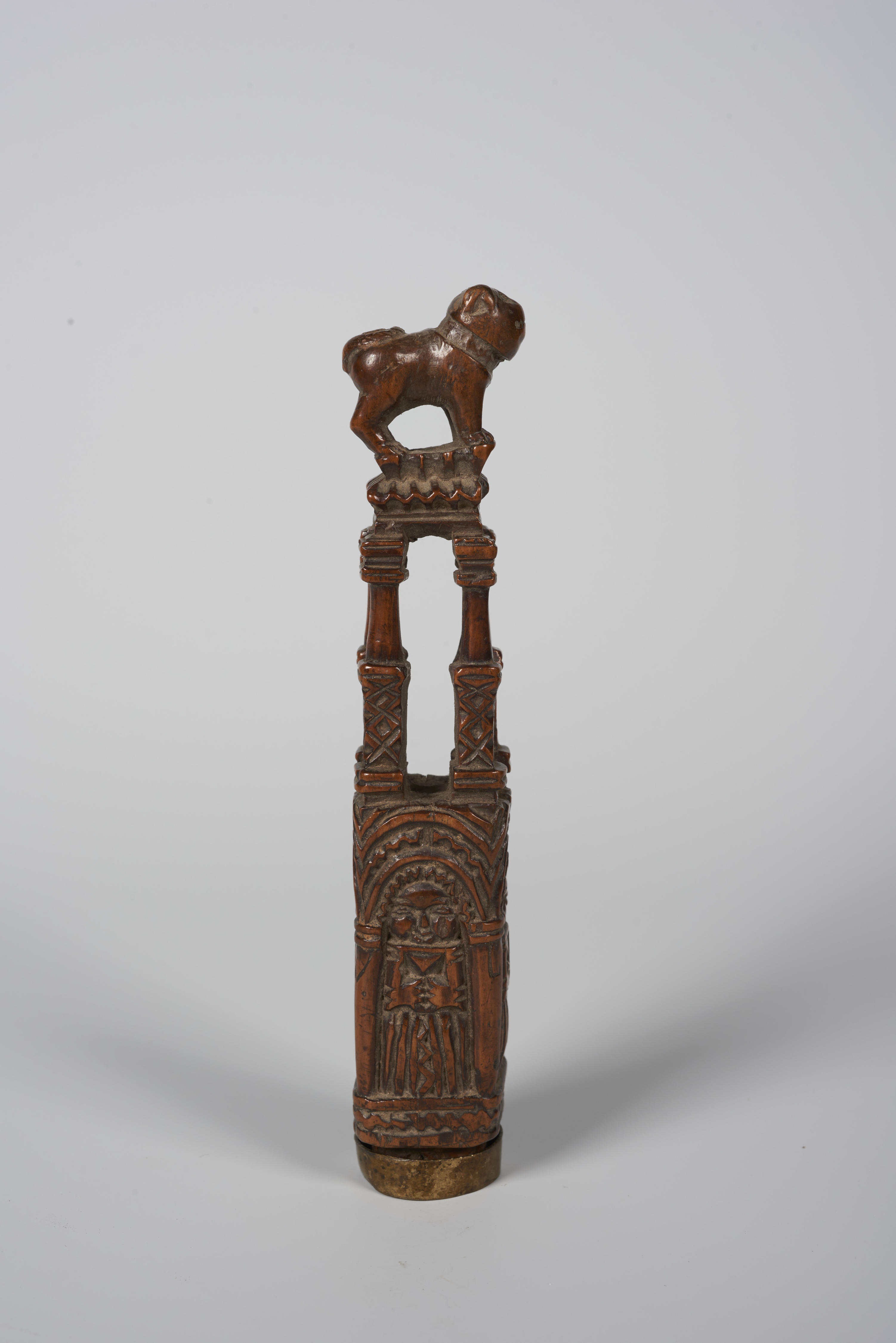 Palmhouten mesheft, aan de onderzijde versierd met vier vrouwenfiguren onder rondbogen. Daarboven zijn vier zuiltjes gesneden. Het heft is bekroond met een hond. Het is afkomstig uit Limburg.