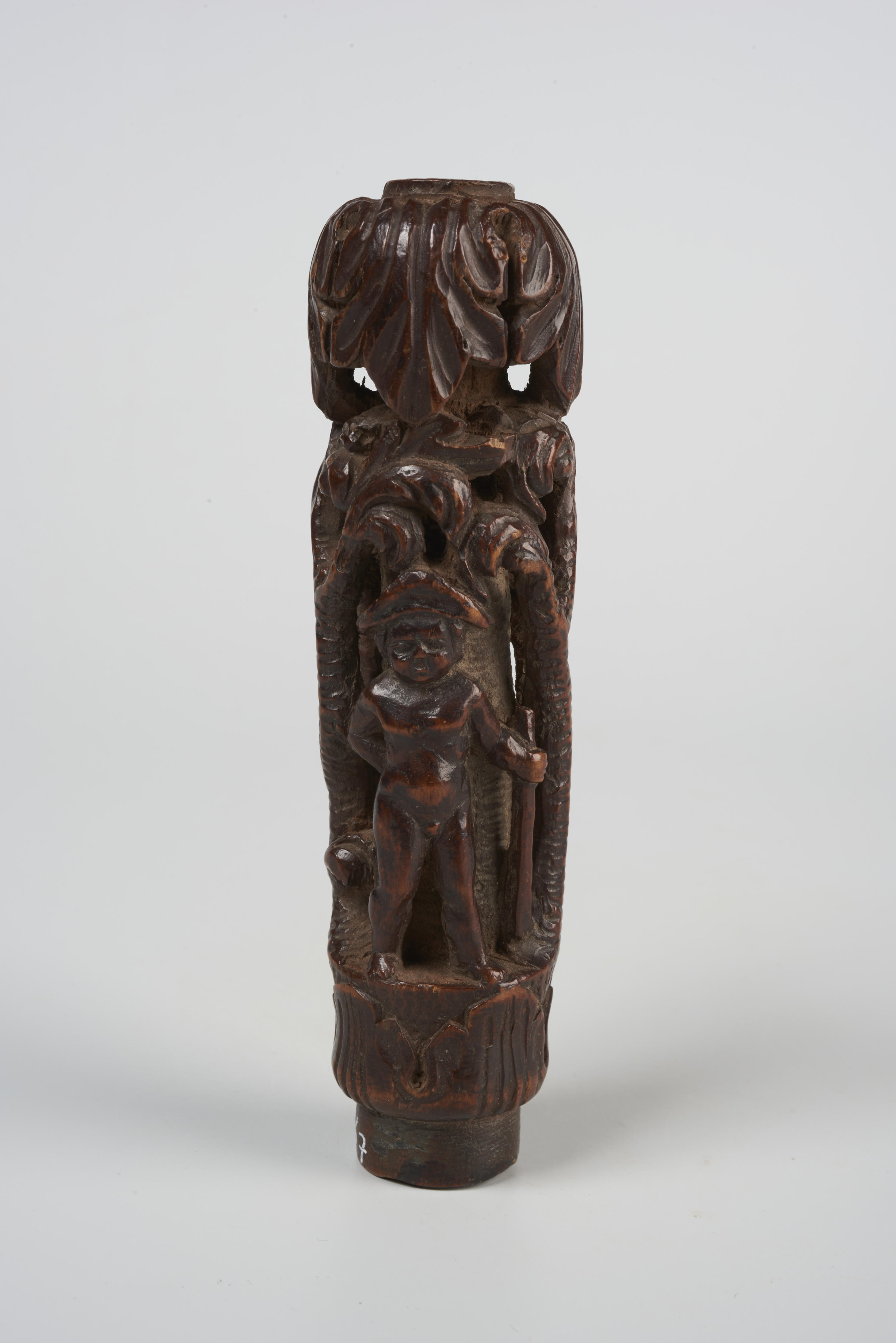 Houten mesheft met de voorstelling van twee putti. Aan de onder- en bovenzijde van het heft is acantusvormige versiering aangebracht. Het heft is gevonden in Utrecht.