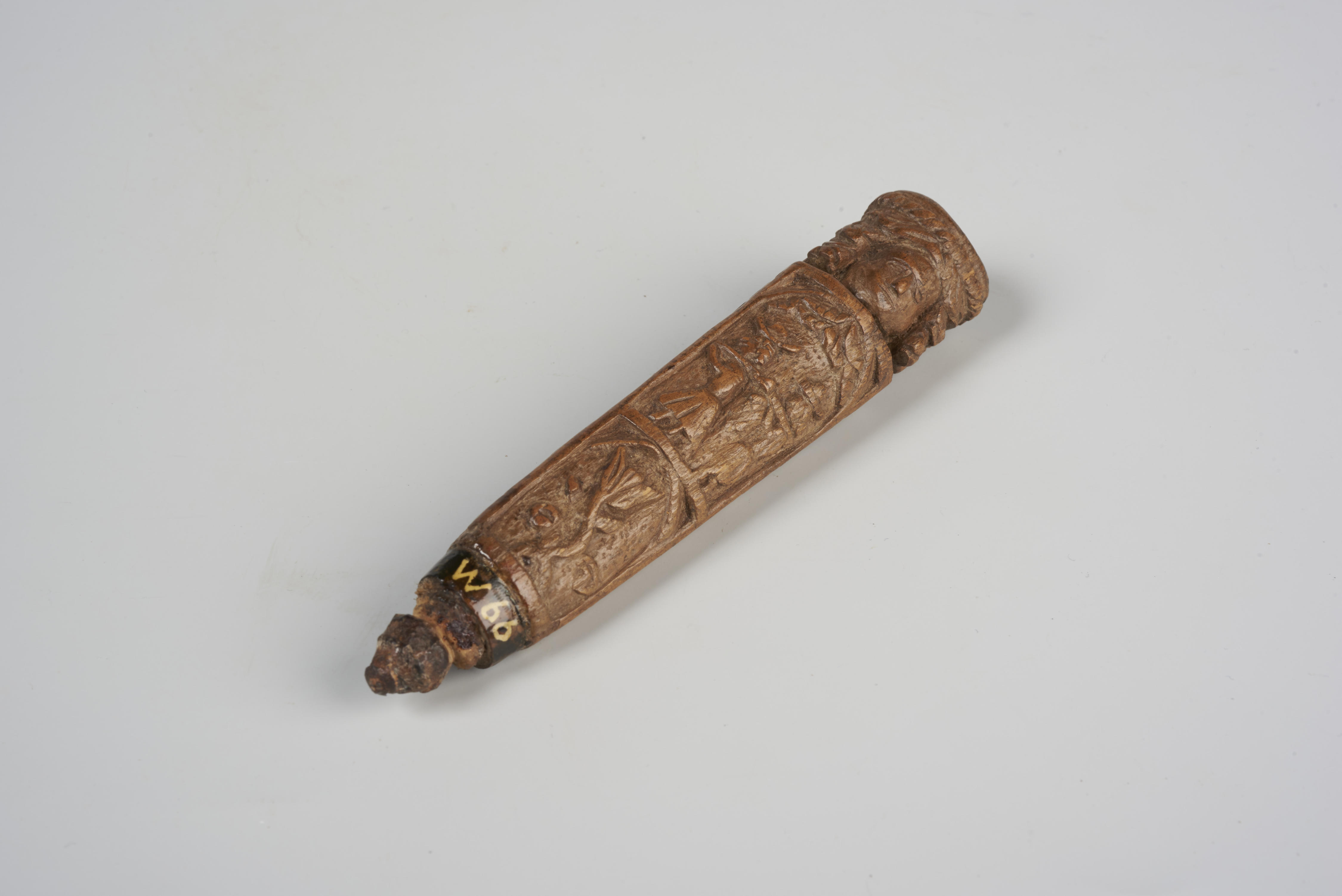 Houten mesheft met voorstellingen van de Verspieders, Elia door de raven gevoed en bloemen. Bovenaan is aan elke zijde een masker afgebeeld.
