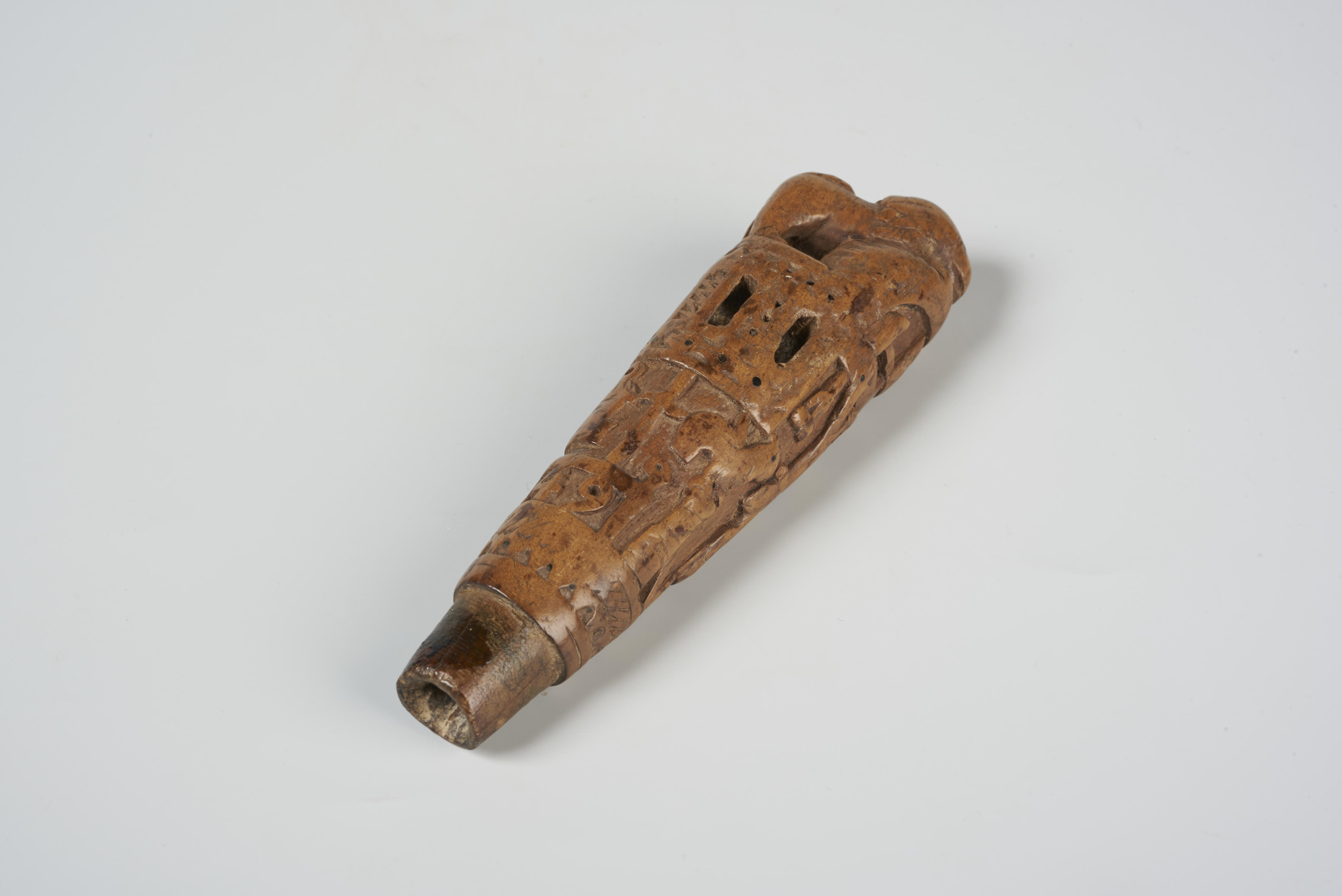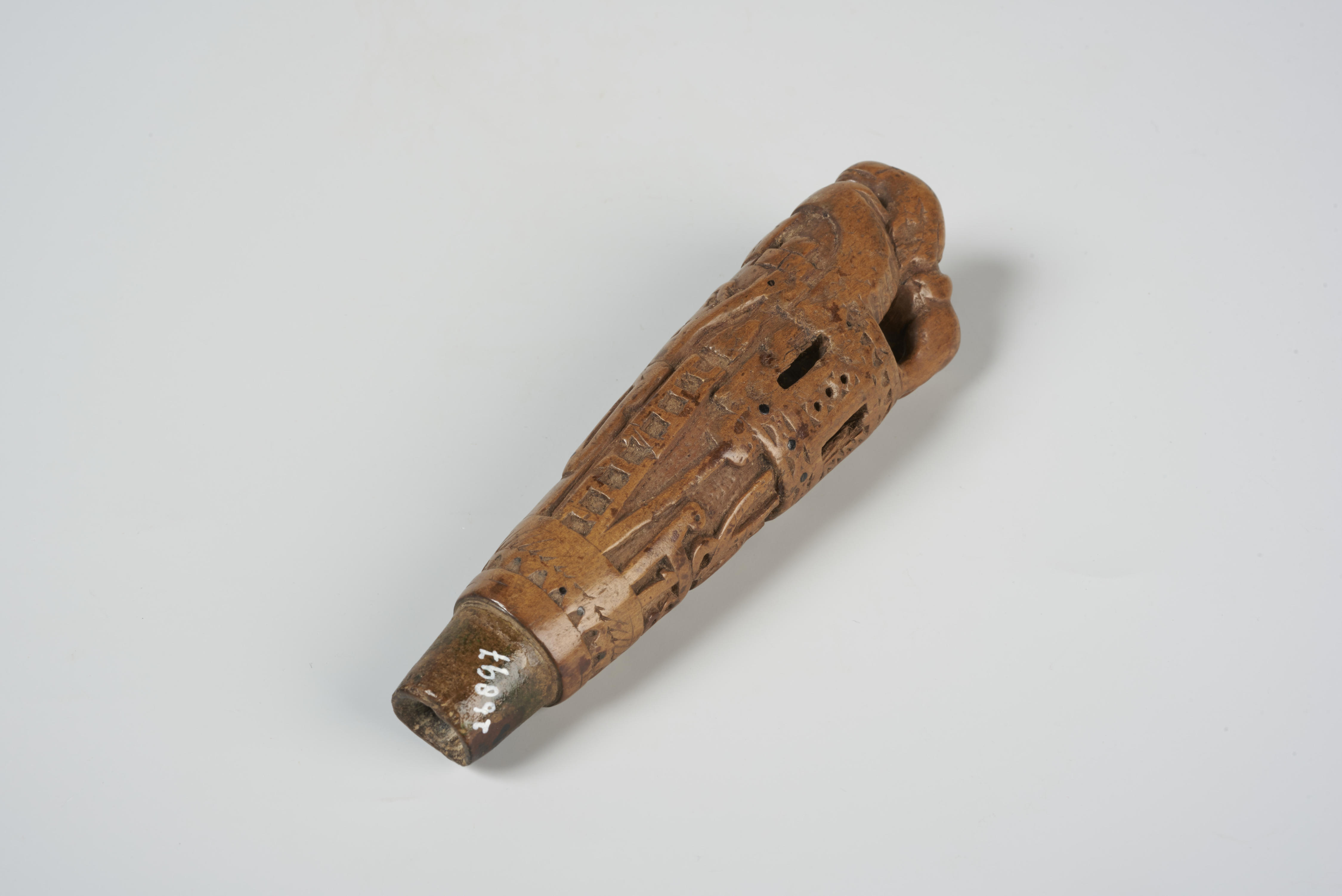 Houten mesheft met de voorstelling van Christus aan het kruis, omgeven door de lijdenssymbolen en het jaartal 1849. Het geheel is bekroond met een leeuw.