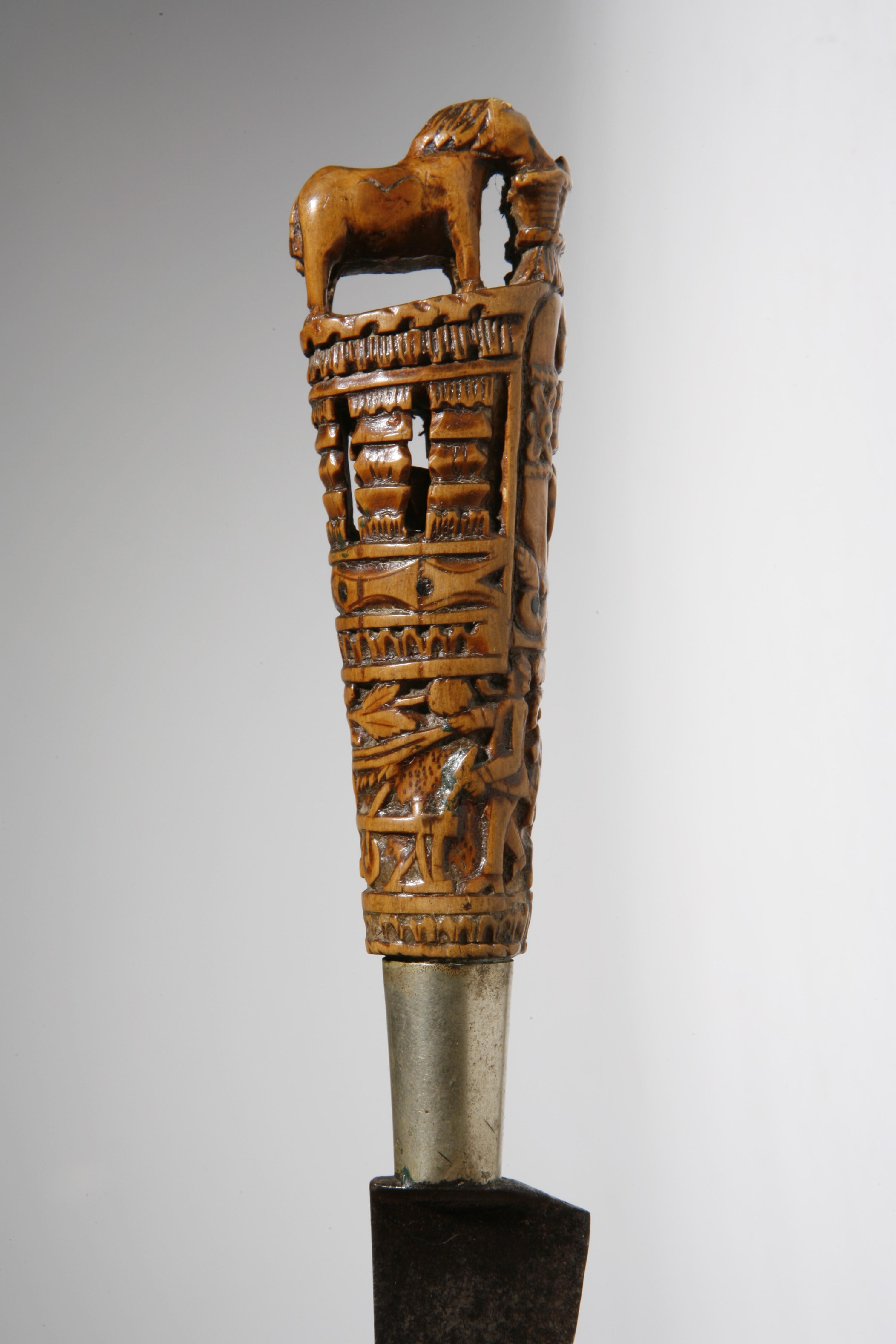 Mes met besneden houten mesheft, afkomstig uit Zeeland. Het mesheft is besneden met een ploegende boer en spijlen met een houten balletje ertussen en bekroond met twee paarden die uit de 'bagge' eten.