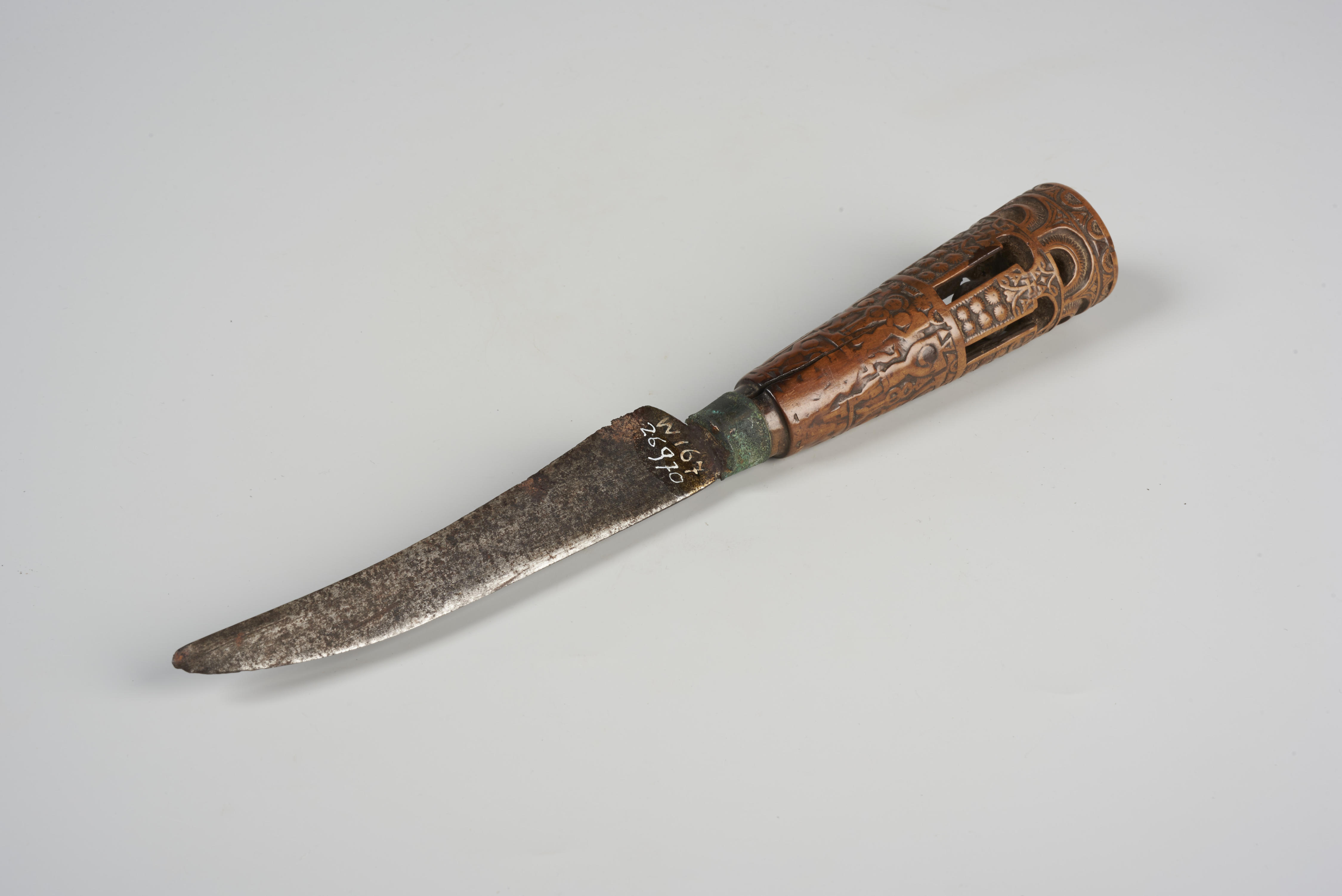 Mes met houten heft, versierd met de voorstellingen van het lijden van Jezus, de geseling, het kruis en de verheerlijking. Hierboven zijn twee kooien te zien. In de onderste kooi zit een bolletje. Op het bovenvlak staan de letters 'HVB'.
