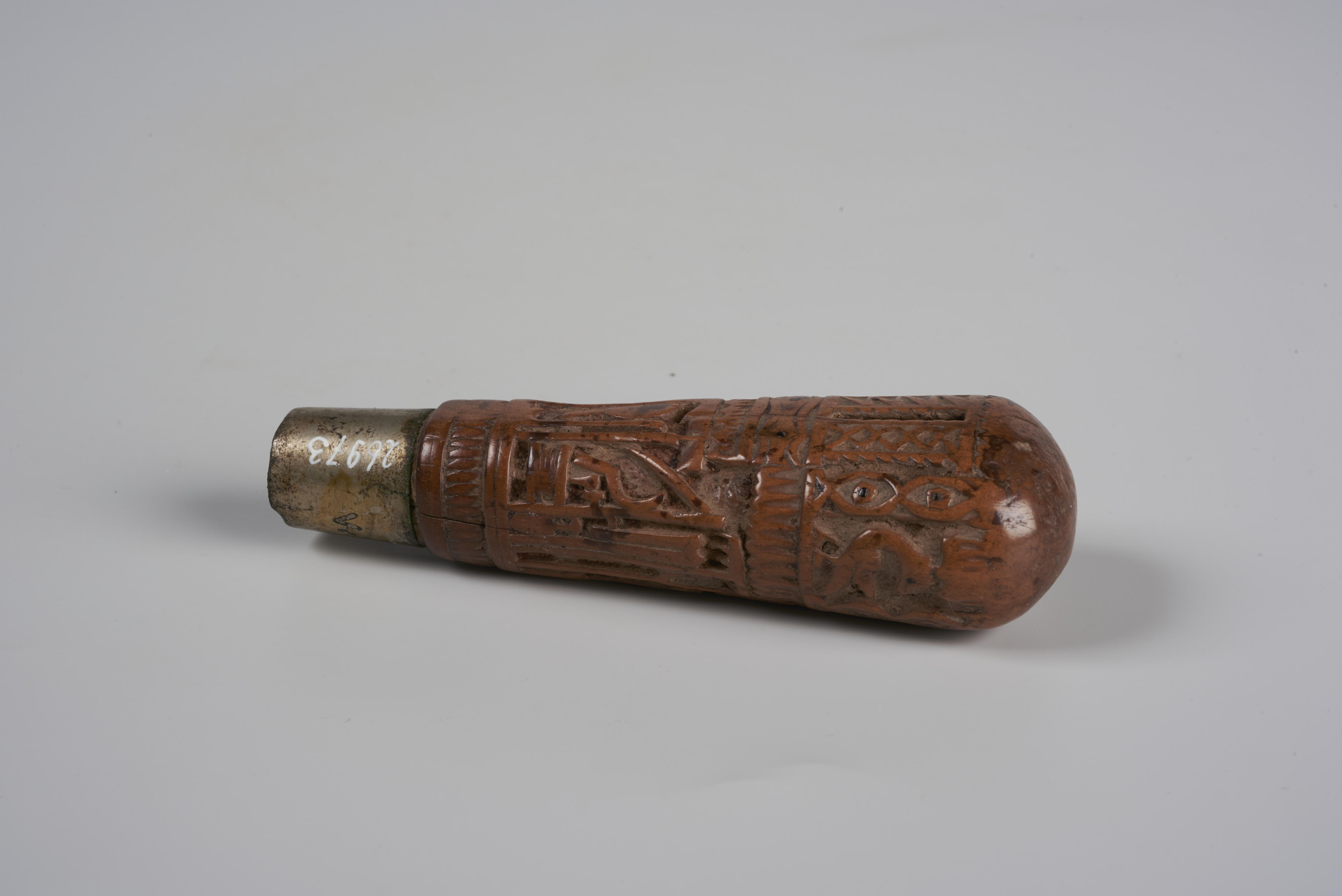 Palmhouten mesheft, versierd met voorstellingen van landbouwgereedschappen, een vogel en een kooi met daarin een bol.
