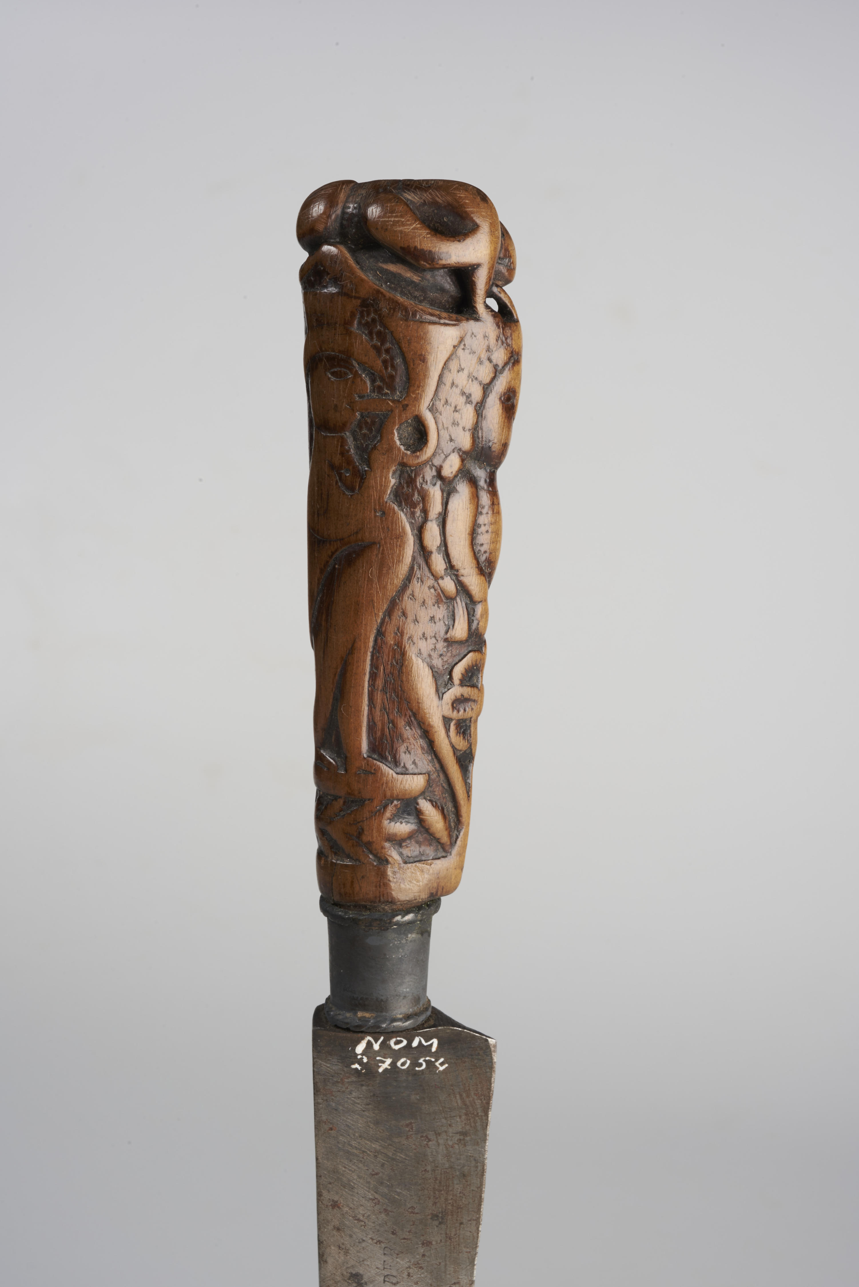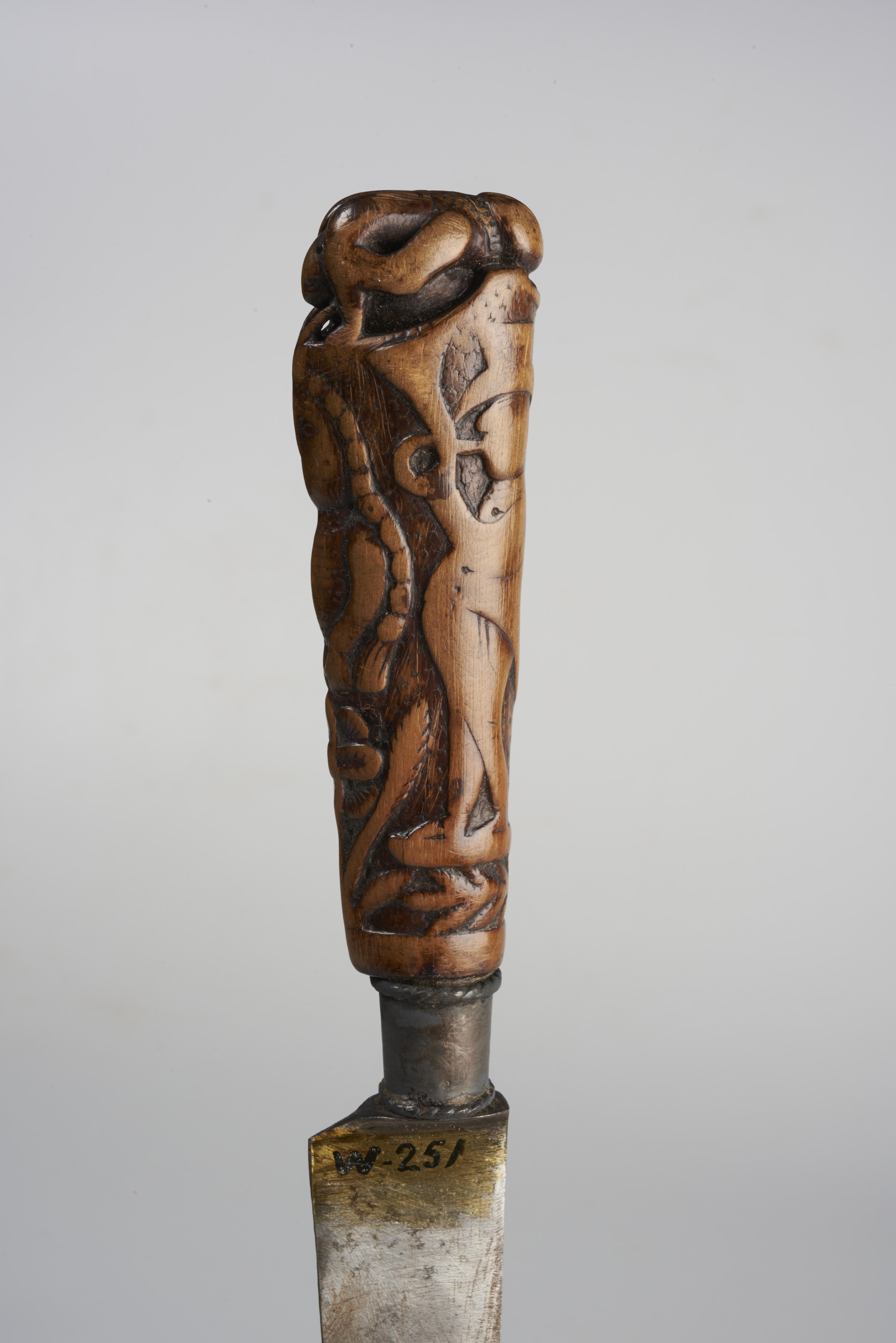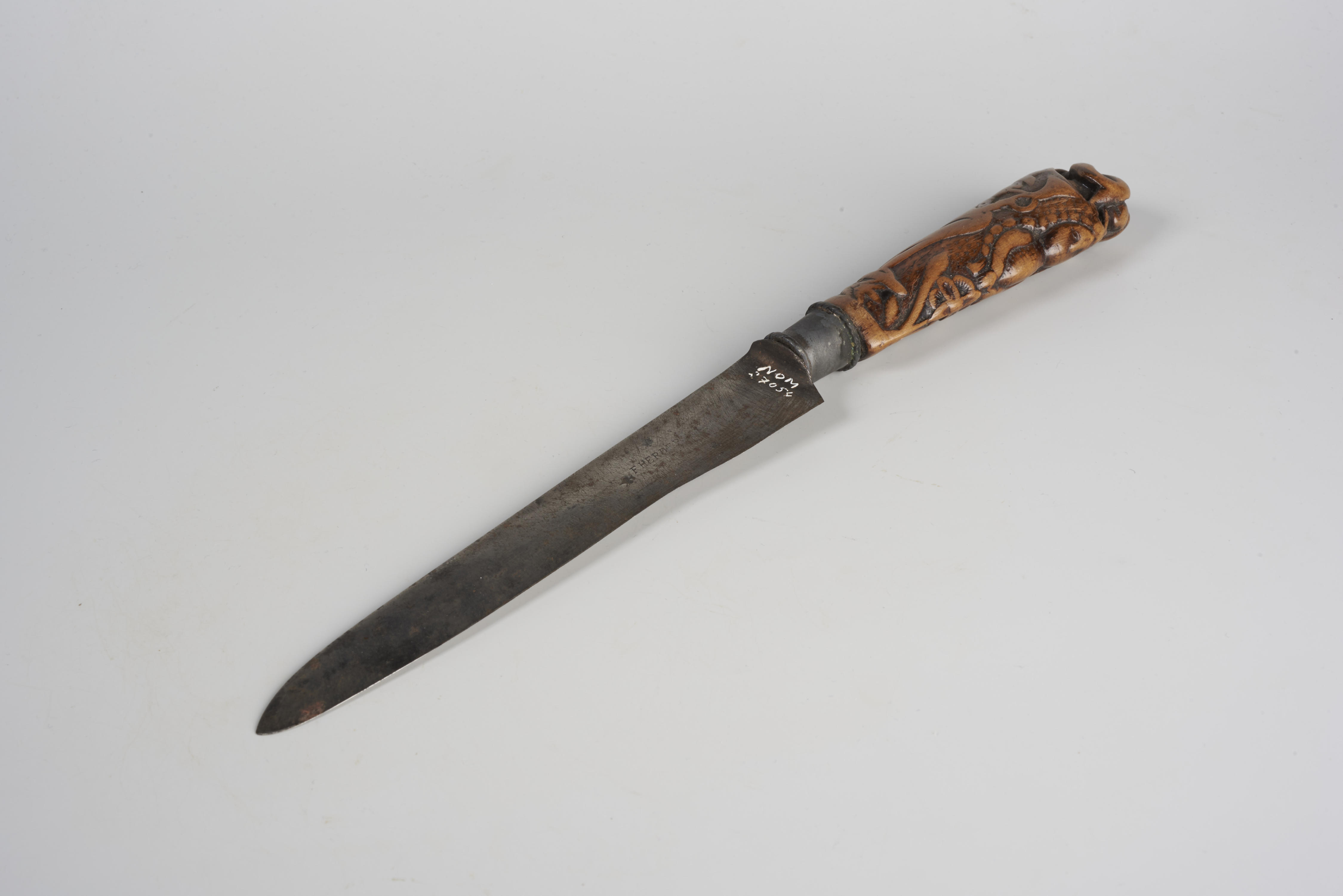 Mes met houten mesheft. Het heft wordt bekroond door een achteroverliggende man. Tussen zijn benen komt een dier gekropen. De schacht van het heft is symmetrisch versierd met twee trompetblazers met hoge hoed en slipjas. Tussen hen in is een meisje met lange vlechten afgebeeld. Voor haar op de grond is een plant met een ...