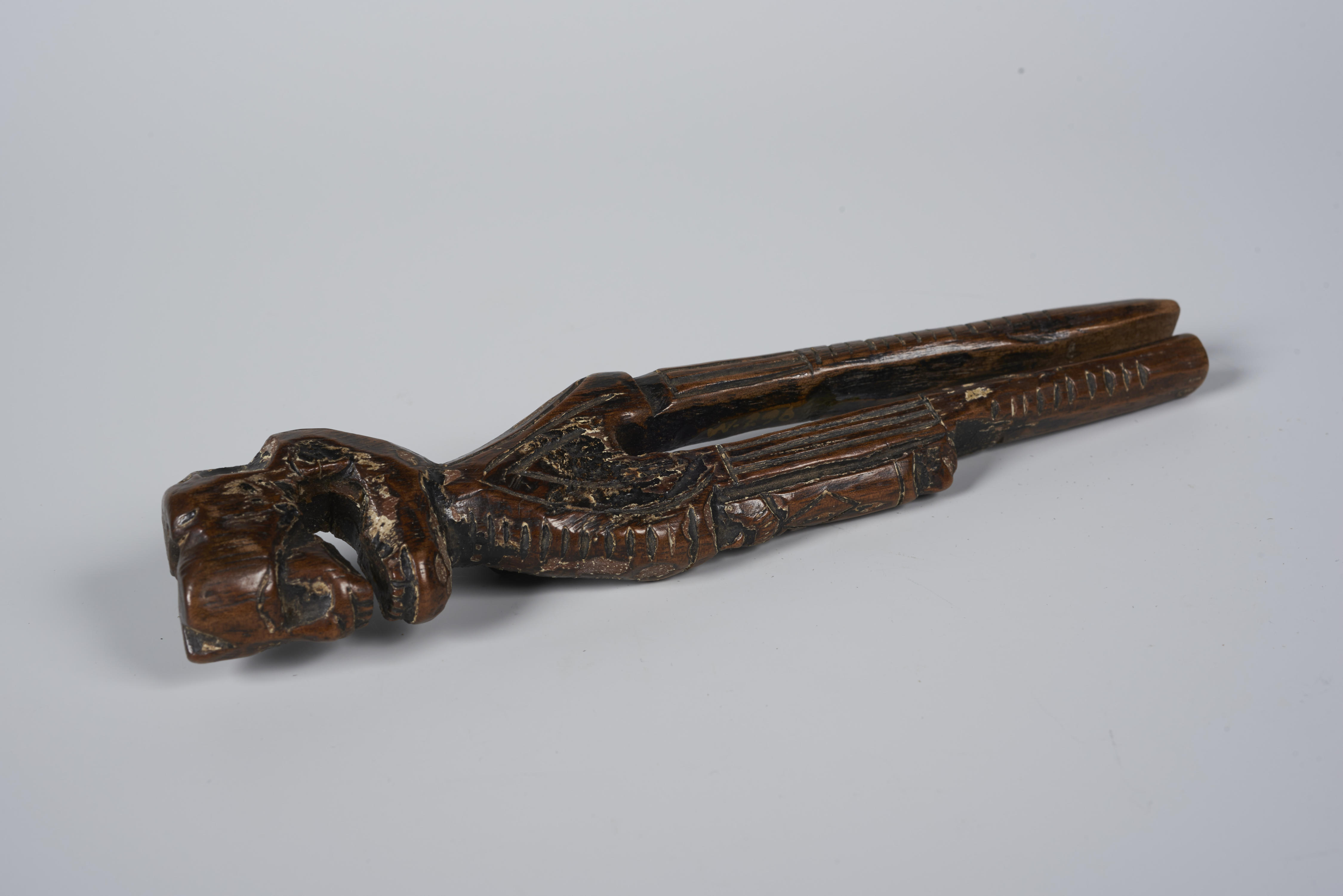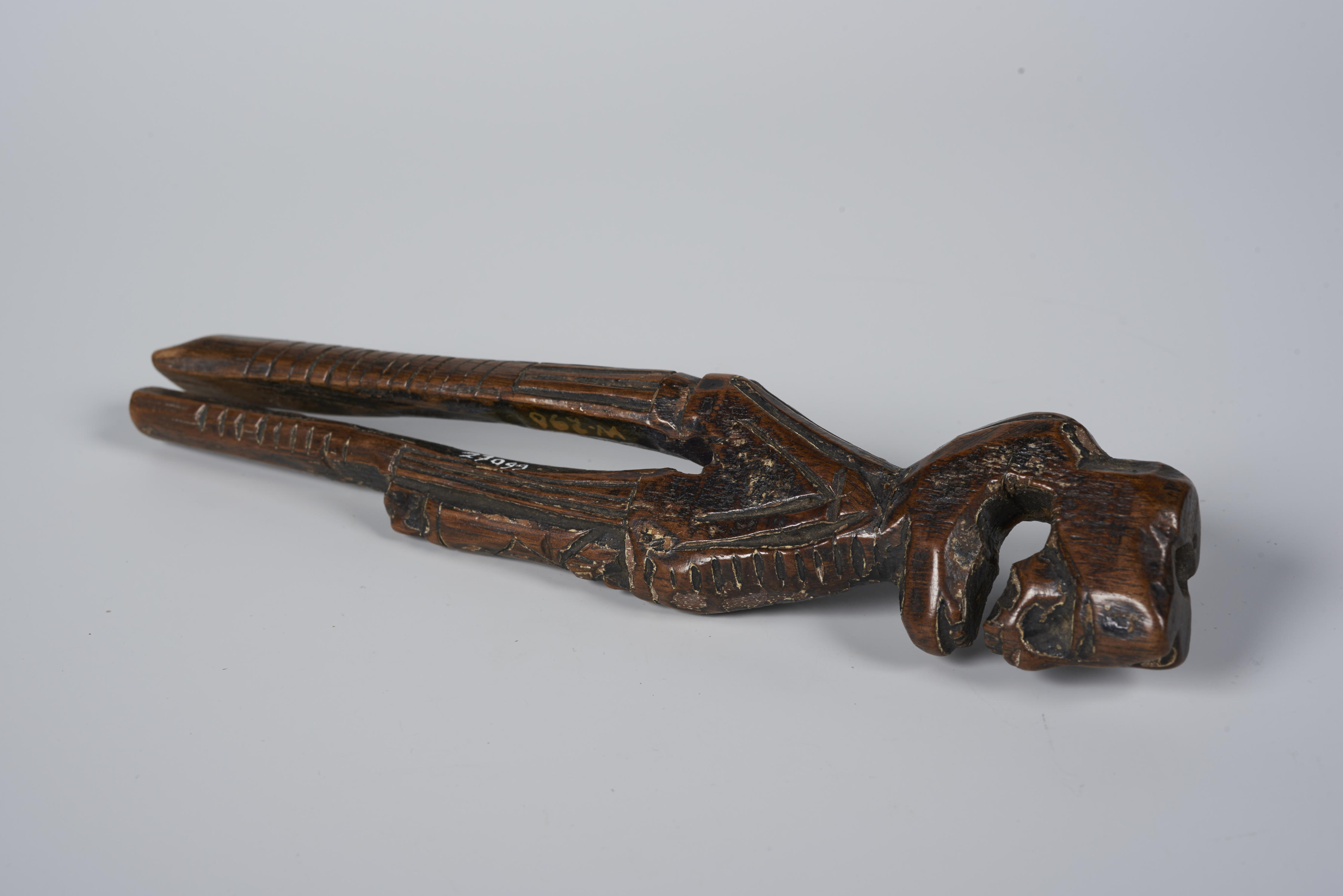 Breischede met een bekroning in de vorm van een schedel met daaronder een aanduiding van een ribbenkast. Daaronder is een manshoofd met ringbaard te zien. Verder naar beneden is een tweede gezicht te zien. De sleuf voor bevestiging aan de riem loopt door tot op eenderde van bovenaf. Het gat voor de breinaald is boven ...