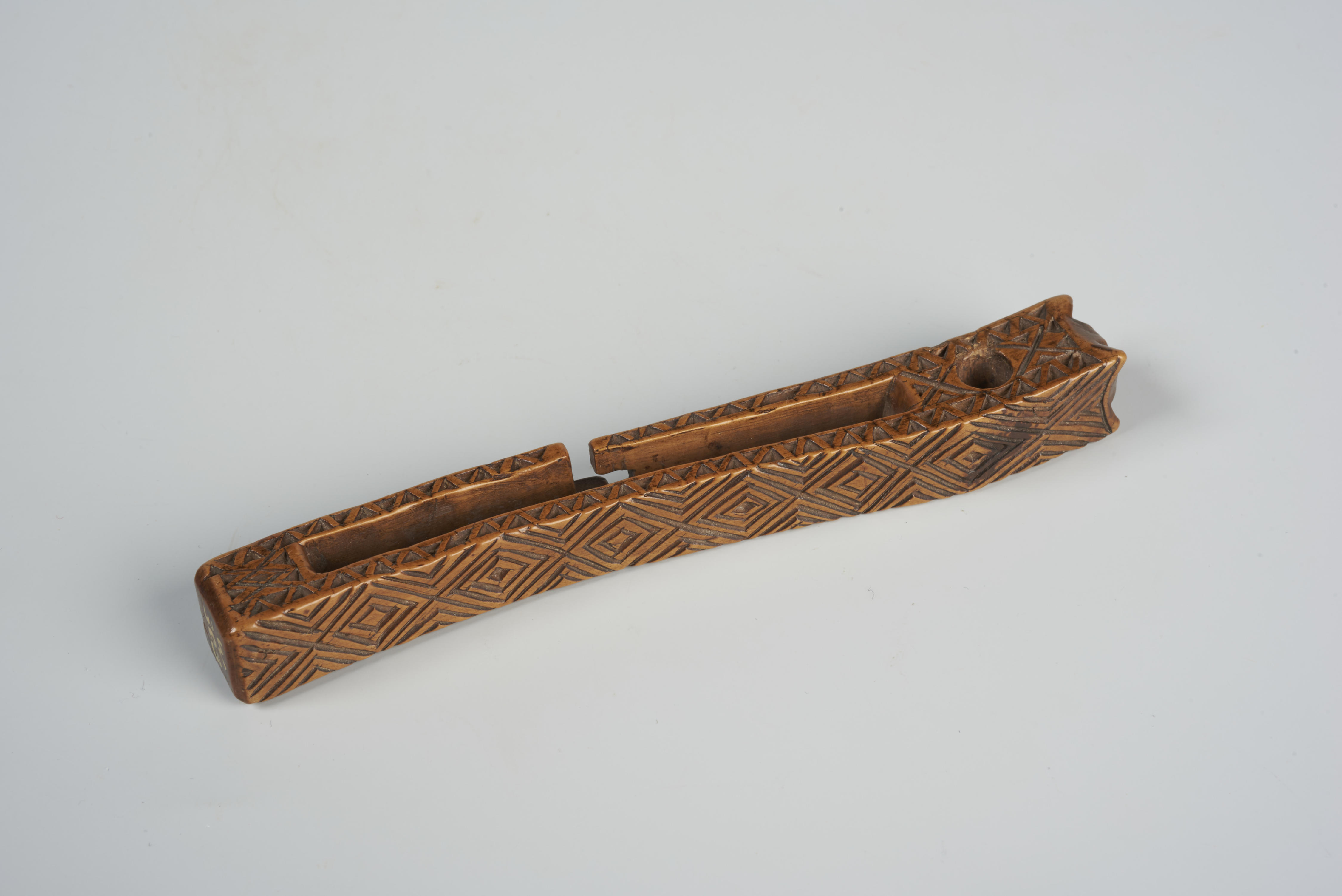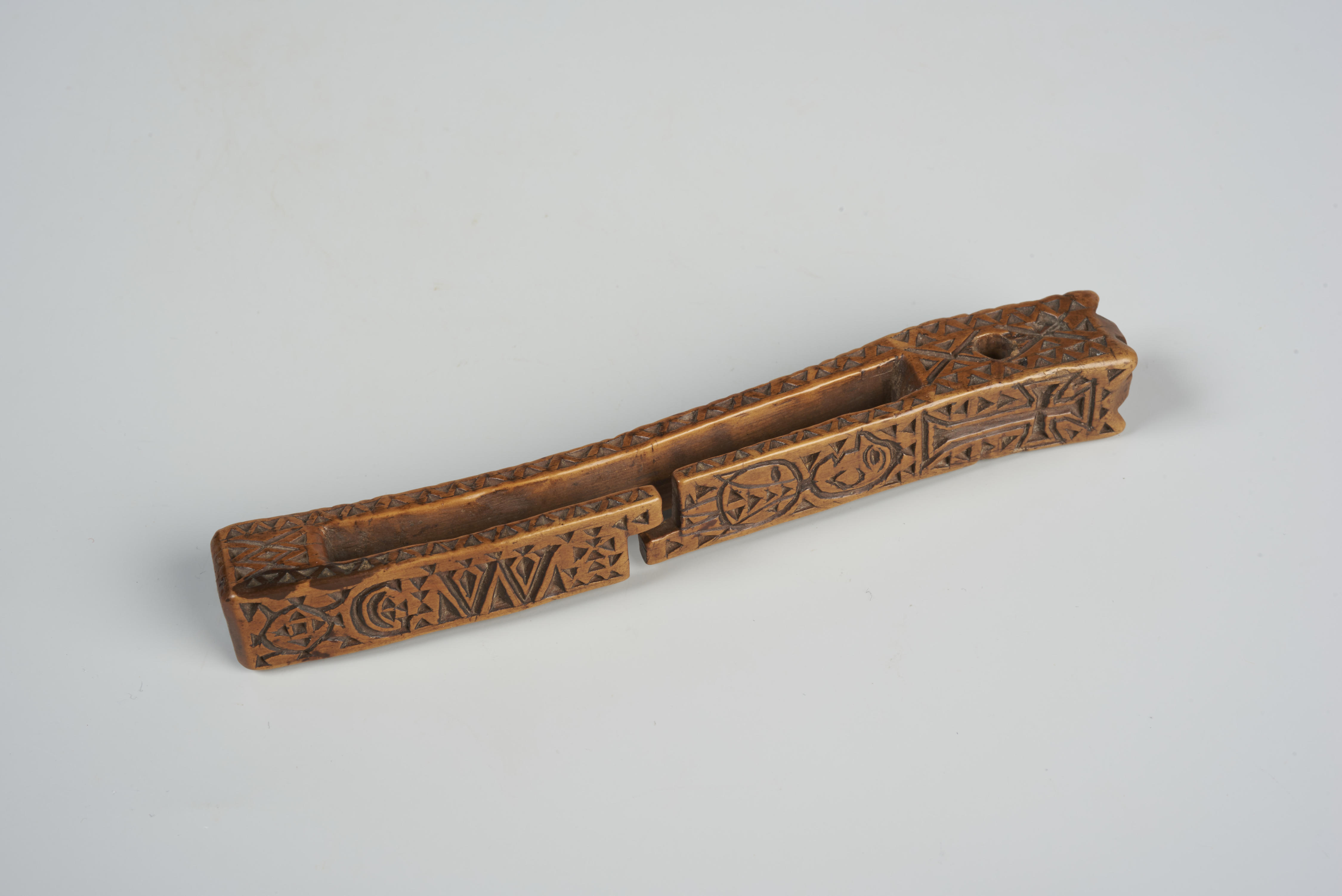 Breischede met een sleuf voor bevestiging. De breischede is met kerfsneewerk versierd. Aan de voorzijde zijn van boven naar onder een kruis, een staande man, de letters 'GW' en een zon te zien. Aan de achterzijde is door schuingestreepte vakken een ruitversiering ontstaan. De zijkanten zijn met zigzagranden versierd.