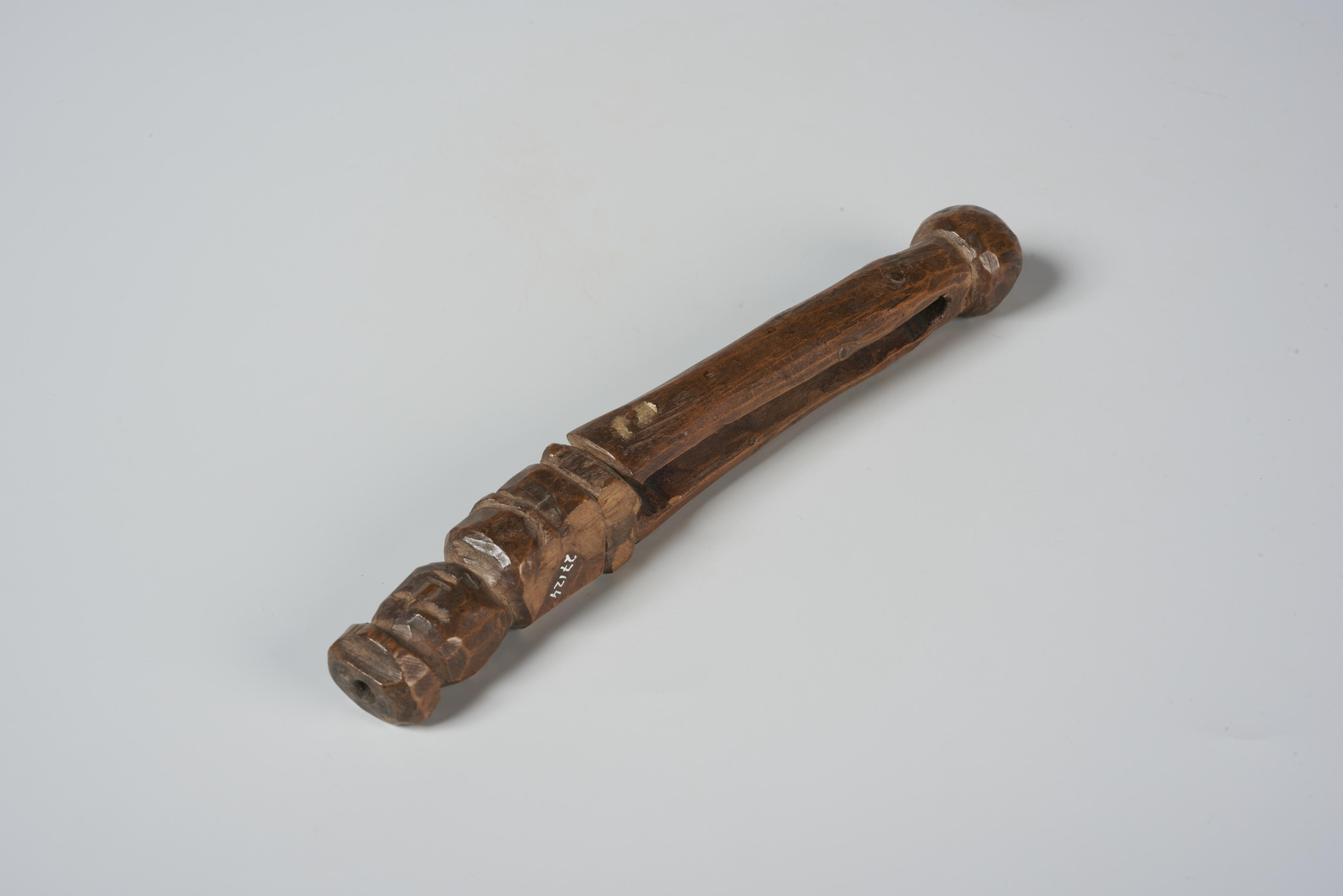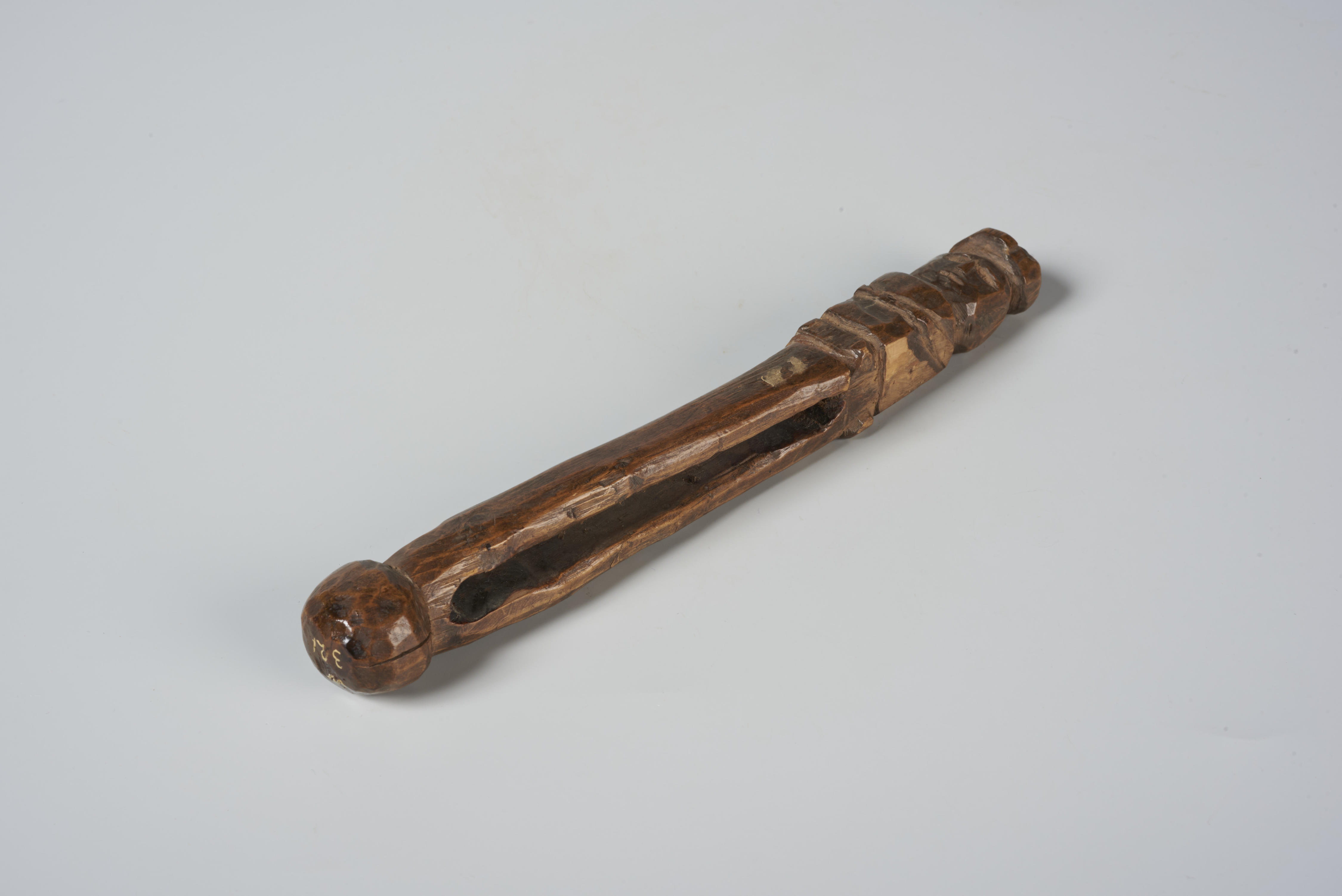 Breischede waarvan de bovenste deel is gesneden in de vorm van een zittende man met een pet op zijn hoofd. In de pet is een gat voor de breinaald geboord. Een overlangse sleuf doorsnijdt bijna het hele onderste deel, zodat de schede aan een riem gehangen kan worden.