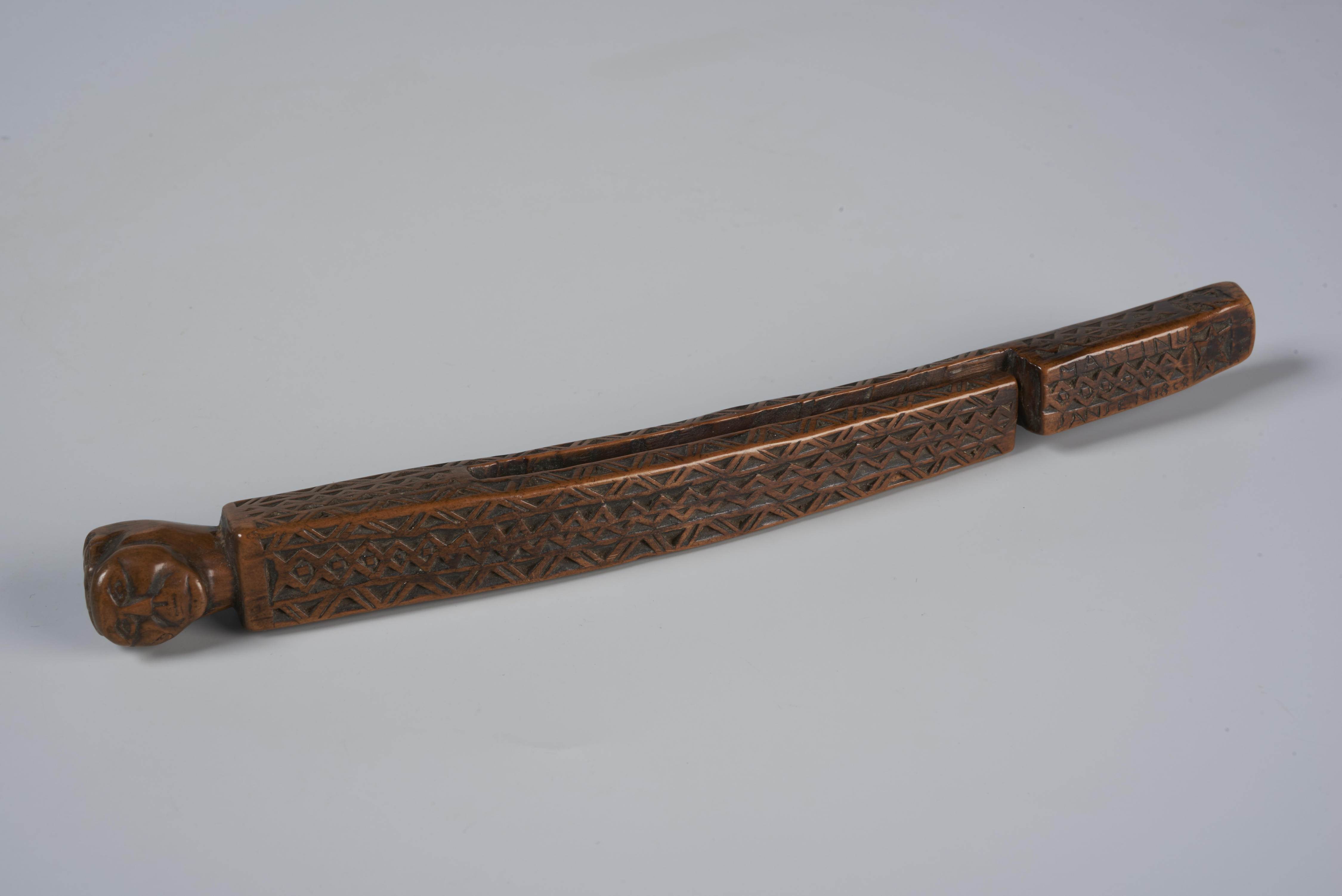 Breischede met als bekroning een mannenhoofd. Bovenin is een gat uitgeboord, omringd door een achtpuntige ster. De voorzijde en de linker- en rechterzijkant van de schede zijn met zigzagranden in kerfsneewerk versierd. Een lange sleuf beslaat het midden van de schede. Onderaan is deze ter weerszijden van een zespuntige ster gemerkt: 'Martinus Jansen 1858'. Aan ...