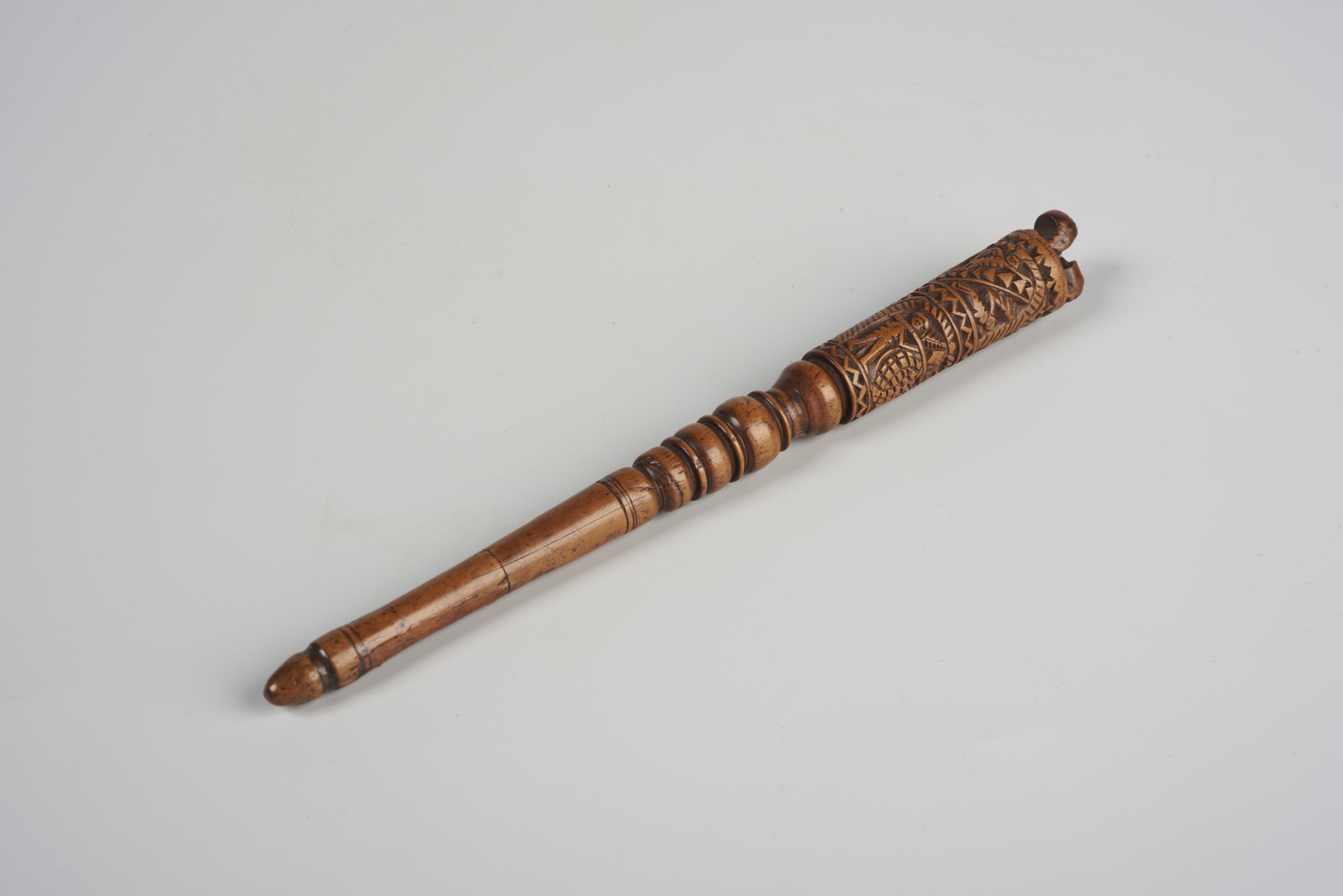 Breischede met op de bovenzijde een liggend leeuwtje waardoorheen het gat voor de breinaald is geboord. De versiering daarop is in twee friesen aangebracht. Op de bovenste fries zijn twee boogjes op zuiltjes gesneden, waaronder de ene Adam en Eva bij de boom der kennis staan en onder de andere Jacob's droom is afgebeeld met ...