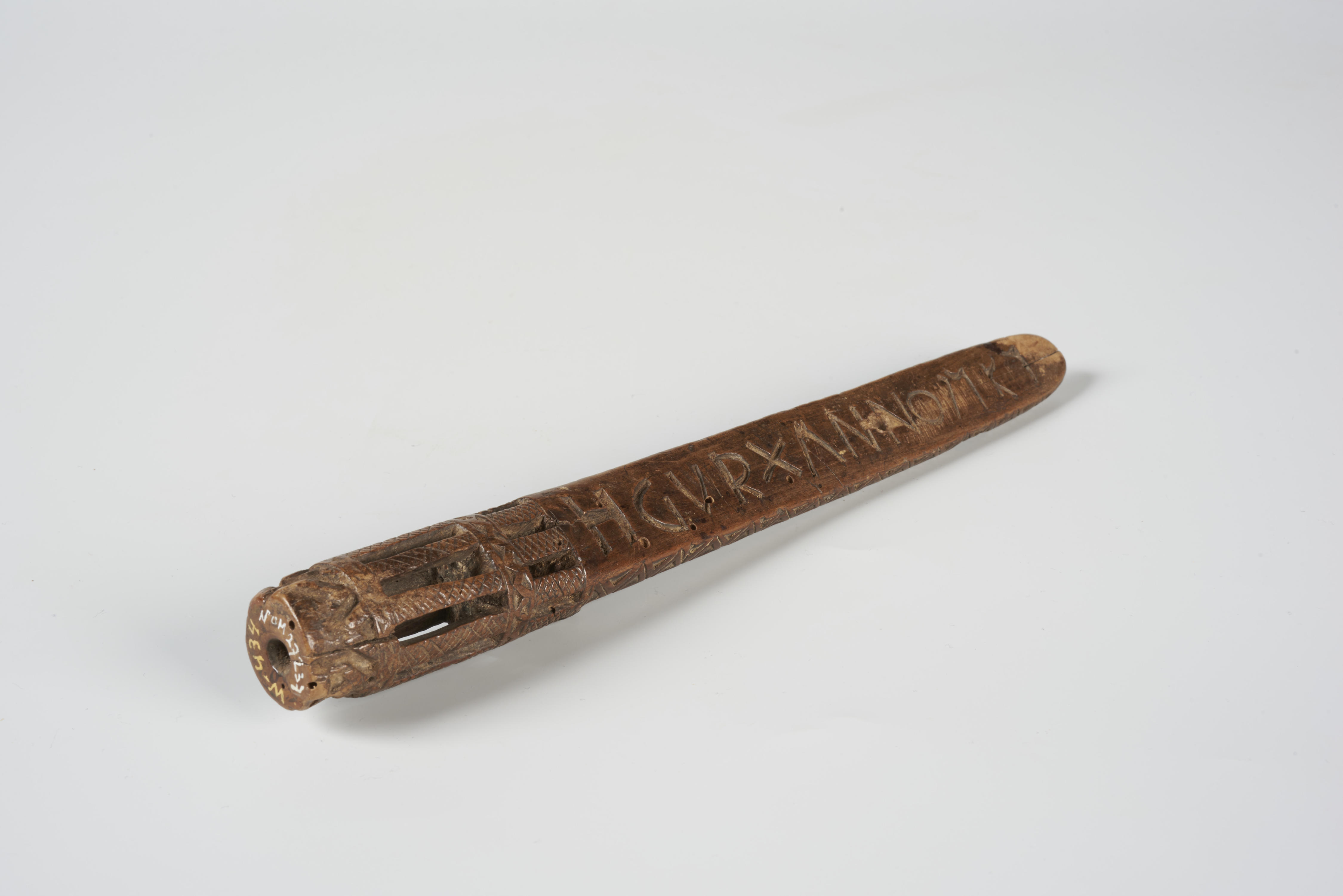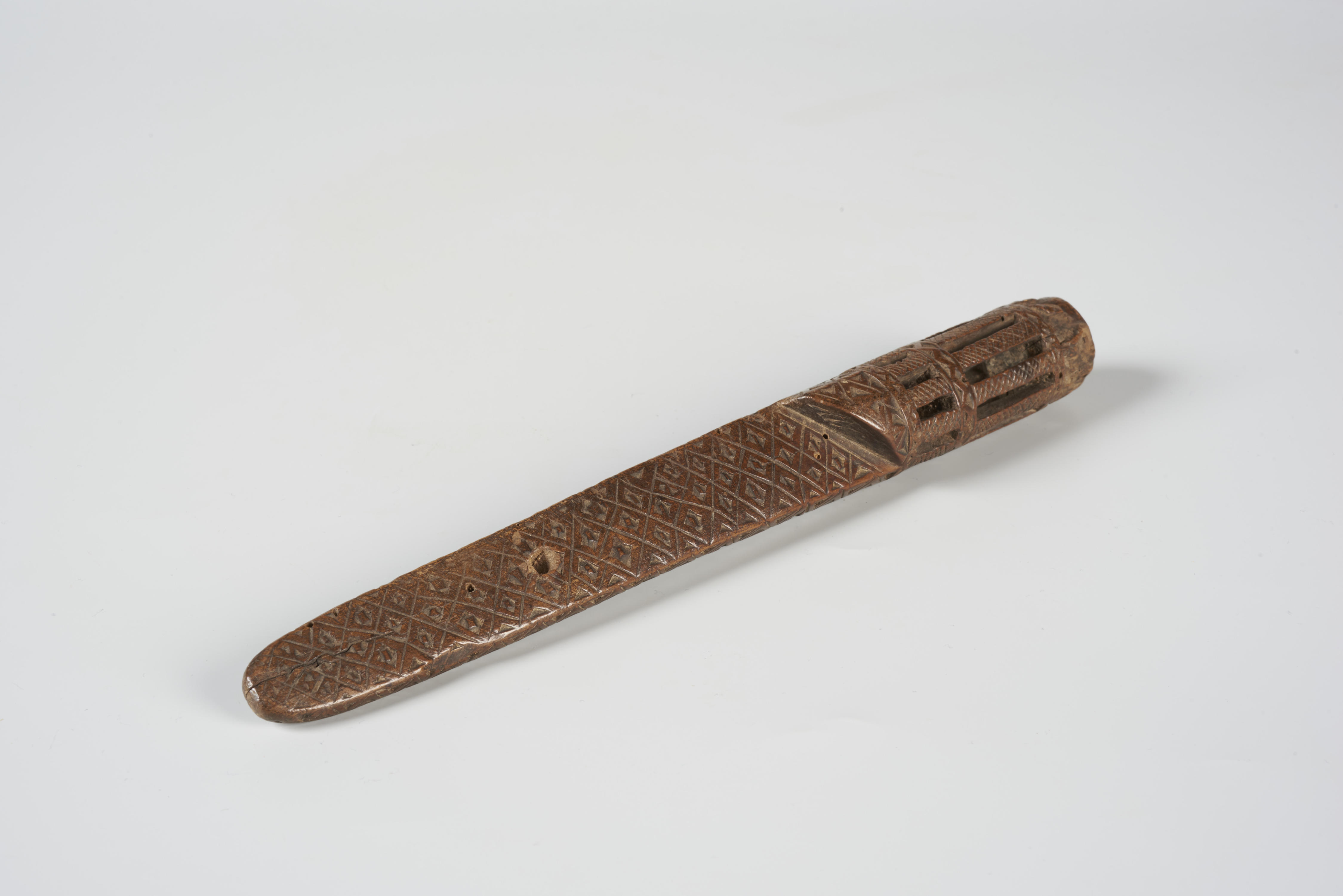 Breischede met bovenaan twee kooitjes. De versiering bestaat aan de voorzijde uit ruitmotieven. Aan de achterzijde draagt het platte gedeelte het inschrift: 'HGVR X ANNO 1757'. De zijkanten zijn met zigzagranden versierd.