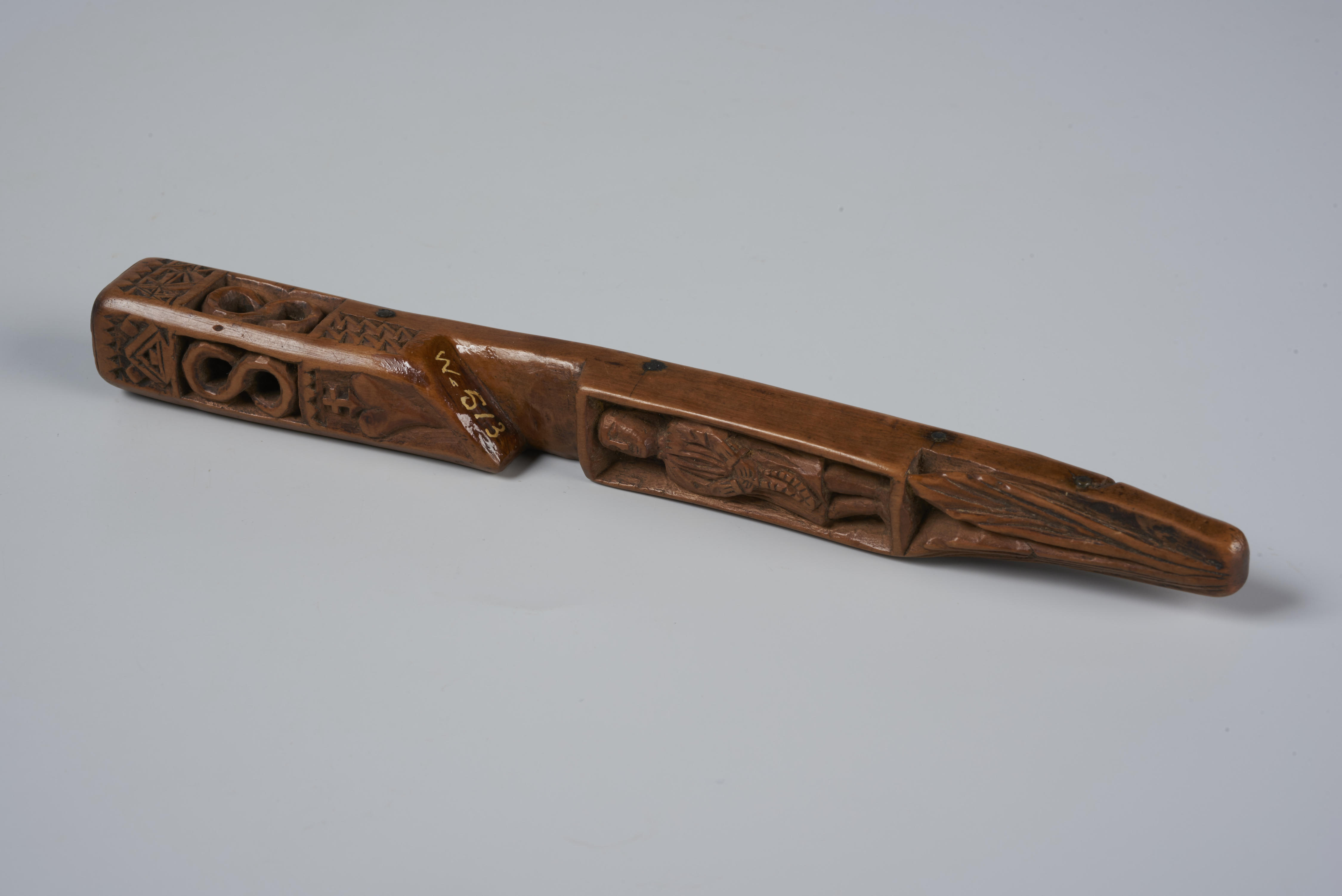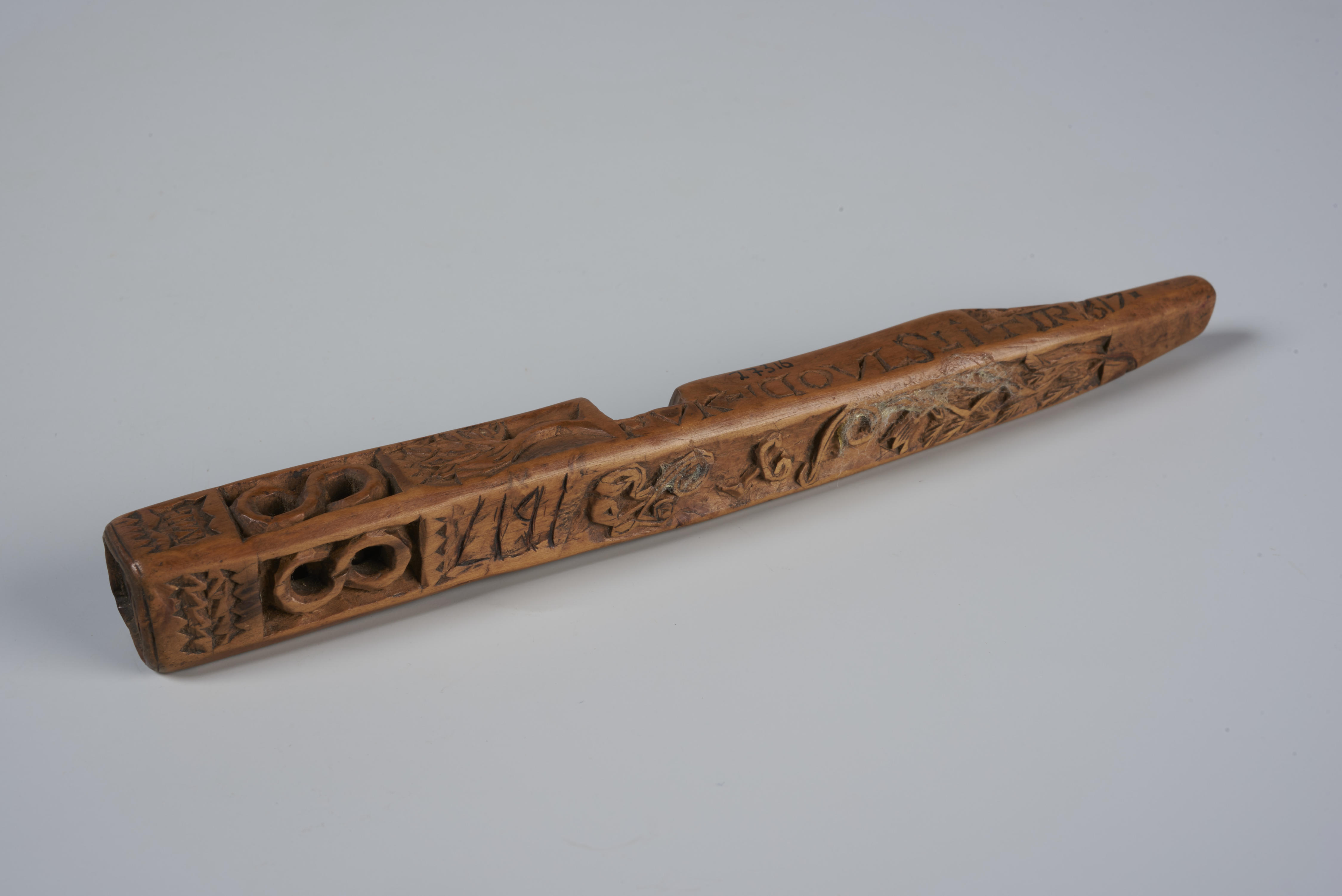 Bewerkte houten breischede, onder andere versierd met een kooitje, een hart, een man met een rozenkrans, een boom en palmtakken. Aan de rechterzijkant is een maatverdeling van 4.5, 4.5, 4.5, 2.2 en 2.5 centimeter aangebracht. Aan de linkerzijkant staan de letters MIH en het inschrift: 'PVK - AOVLSITIR 1617'. De 6 was oorspronkelijk een 8. ...