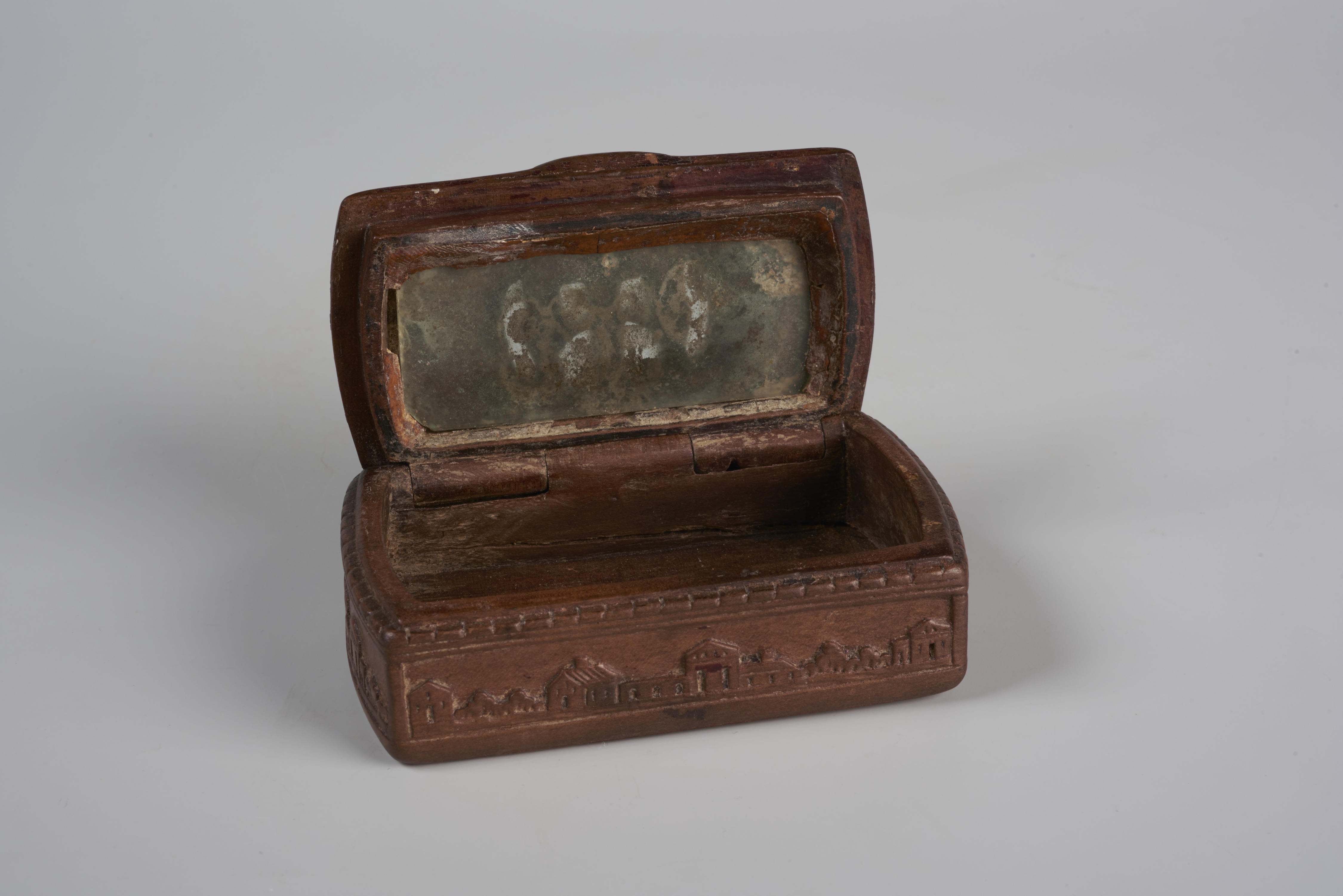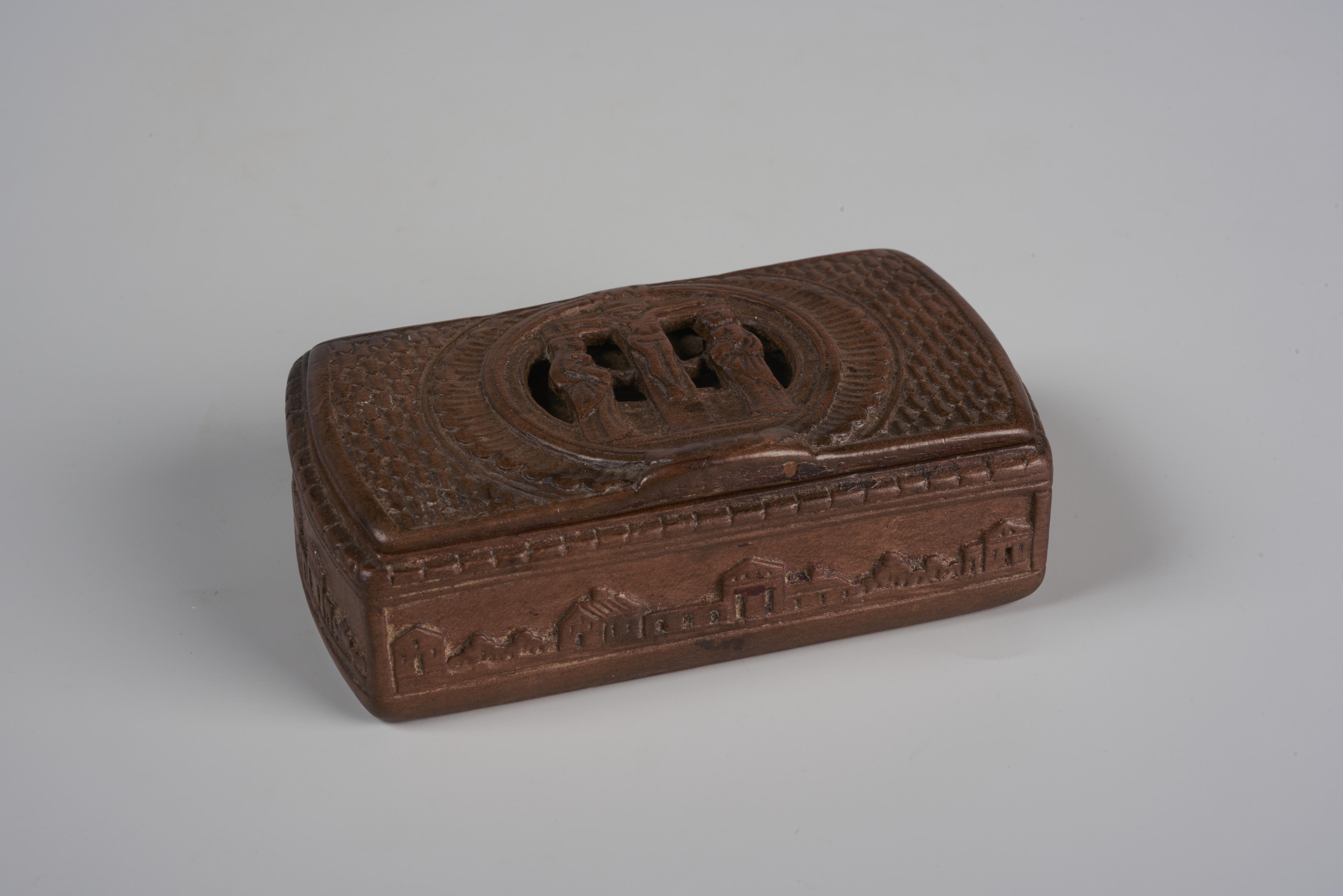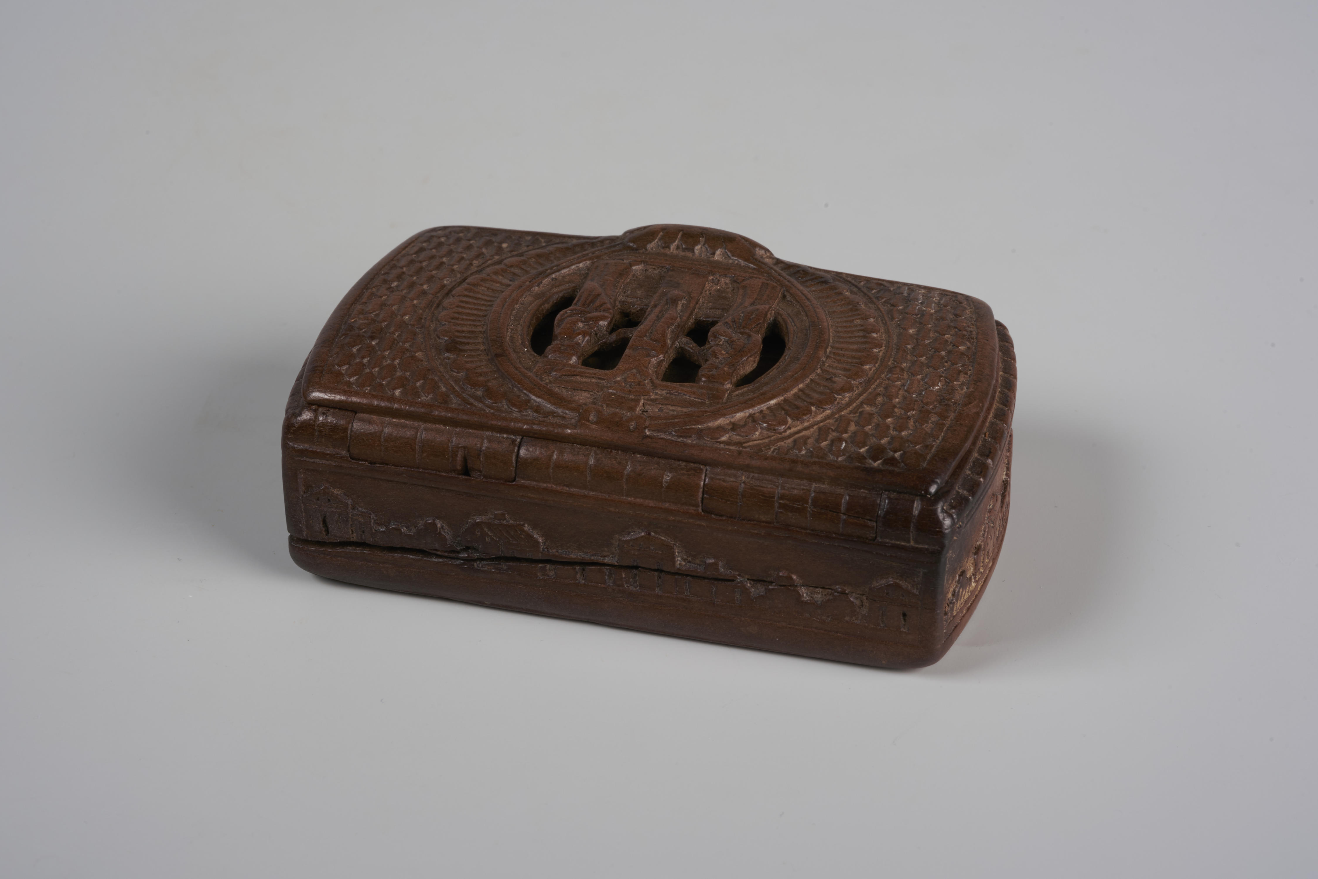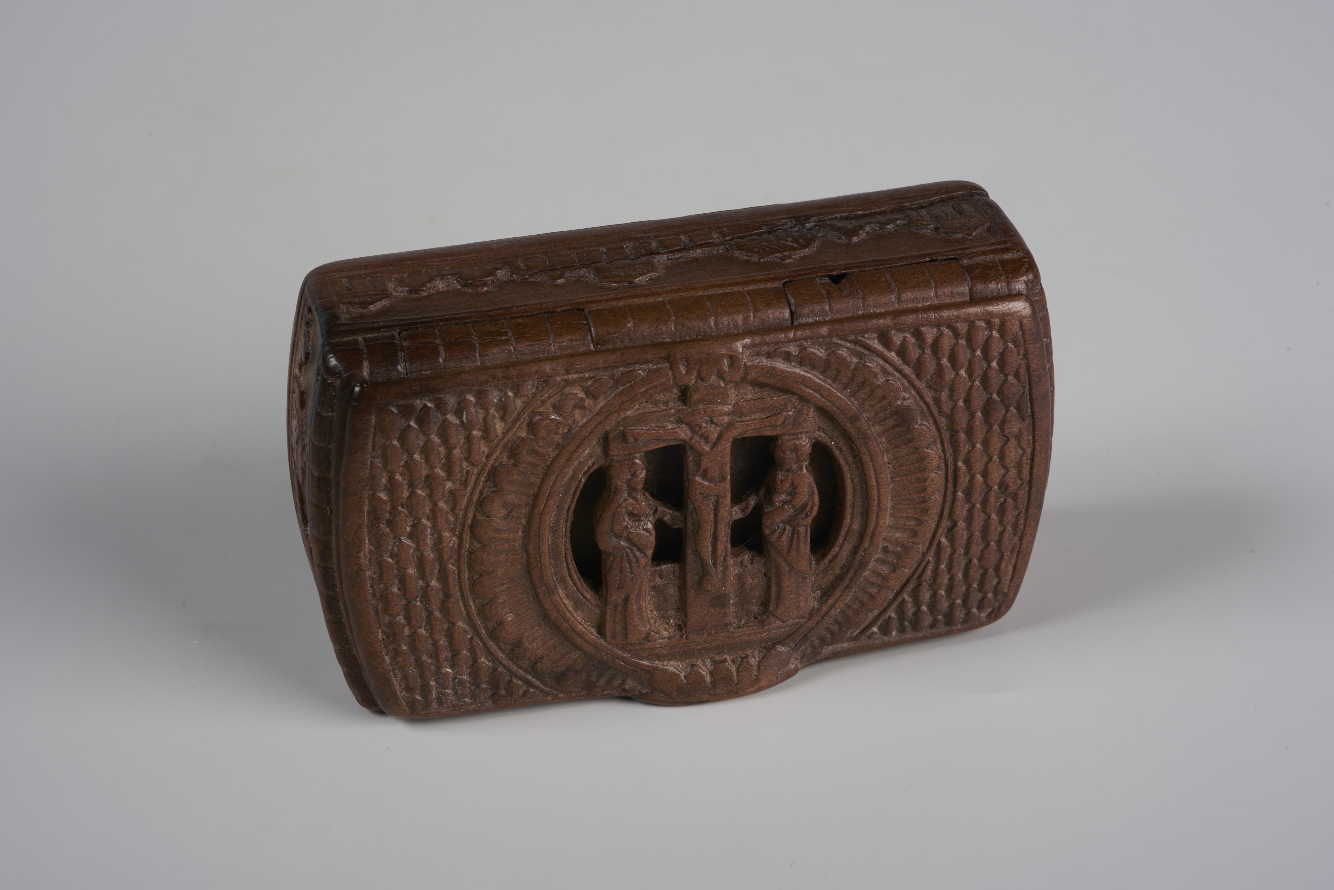 Snuifdoos met op het deksel een voorstelling van Christus aan het kruis met daarnaast Maria en Johannes. De rest van het deksel draagt een blokpatroon van kerfsneewerk. Op de vier zijkanten staan landschapjes met huizen en bomen in vlaksneewerk.