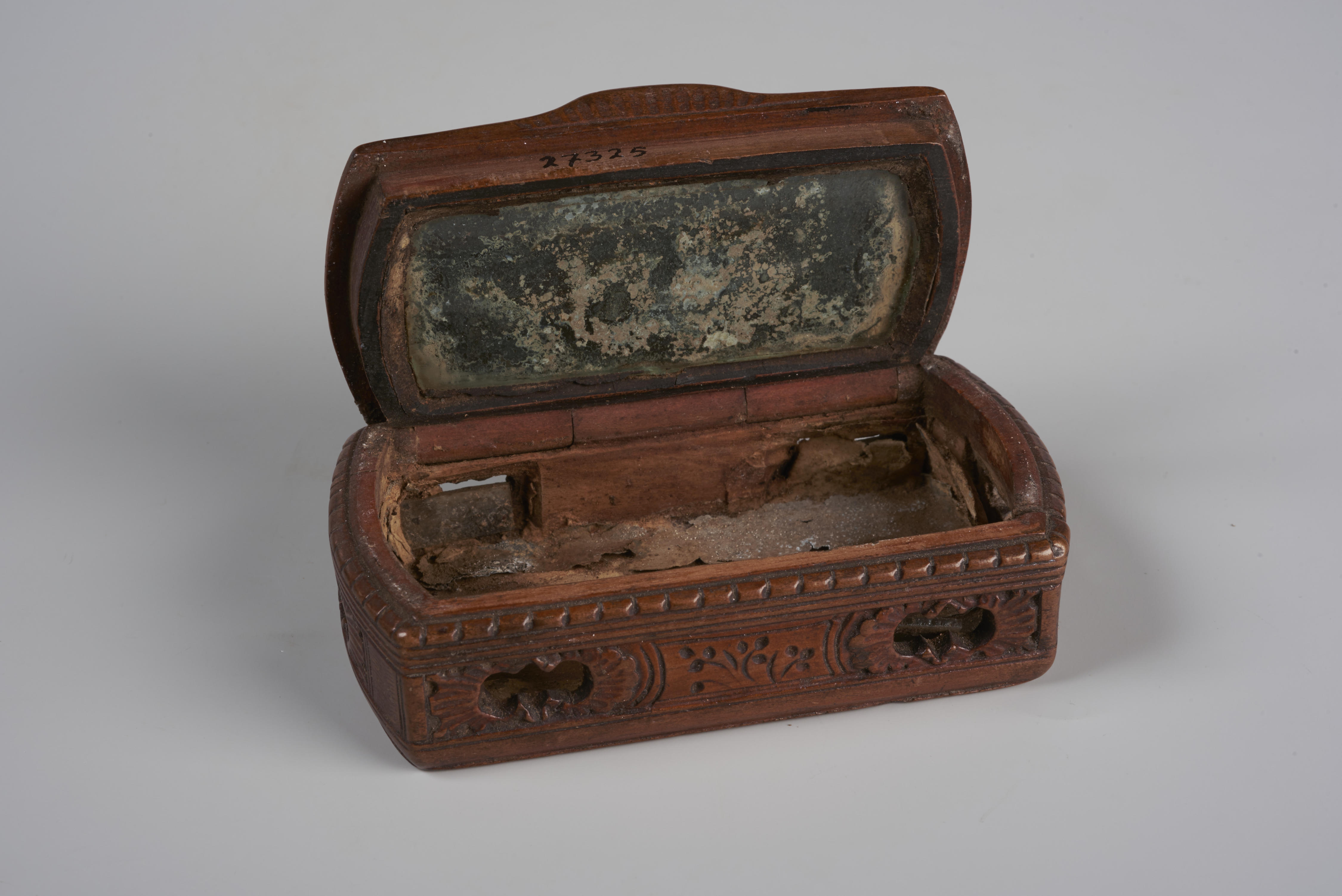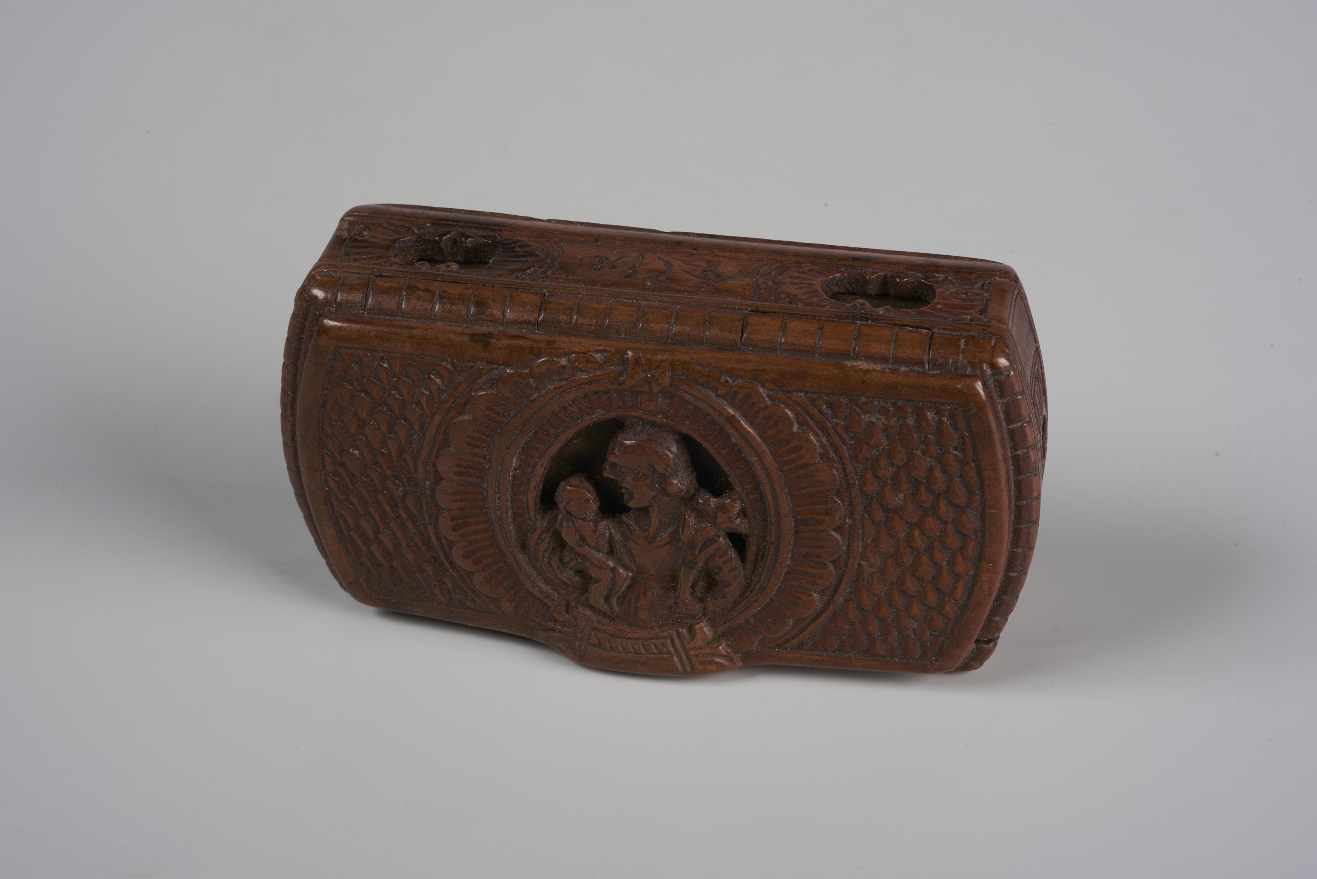 Snuifdoos met op het deksel de voorstelling van Maria met kind. Zij houdt in haar linkerhand een lelietak. De rest van het deksel is versierd met een blokpatroon in kerfsneewerk. Van de opstaande kanten zijn de korte versierd met een opening met vereenvoudigd rocaillelofwerk aan weerszijden. De lange kanten zijn versierd met twee van dergelijke ...