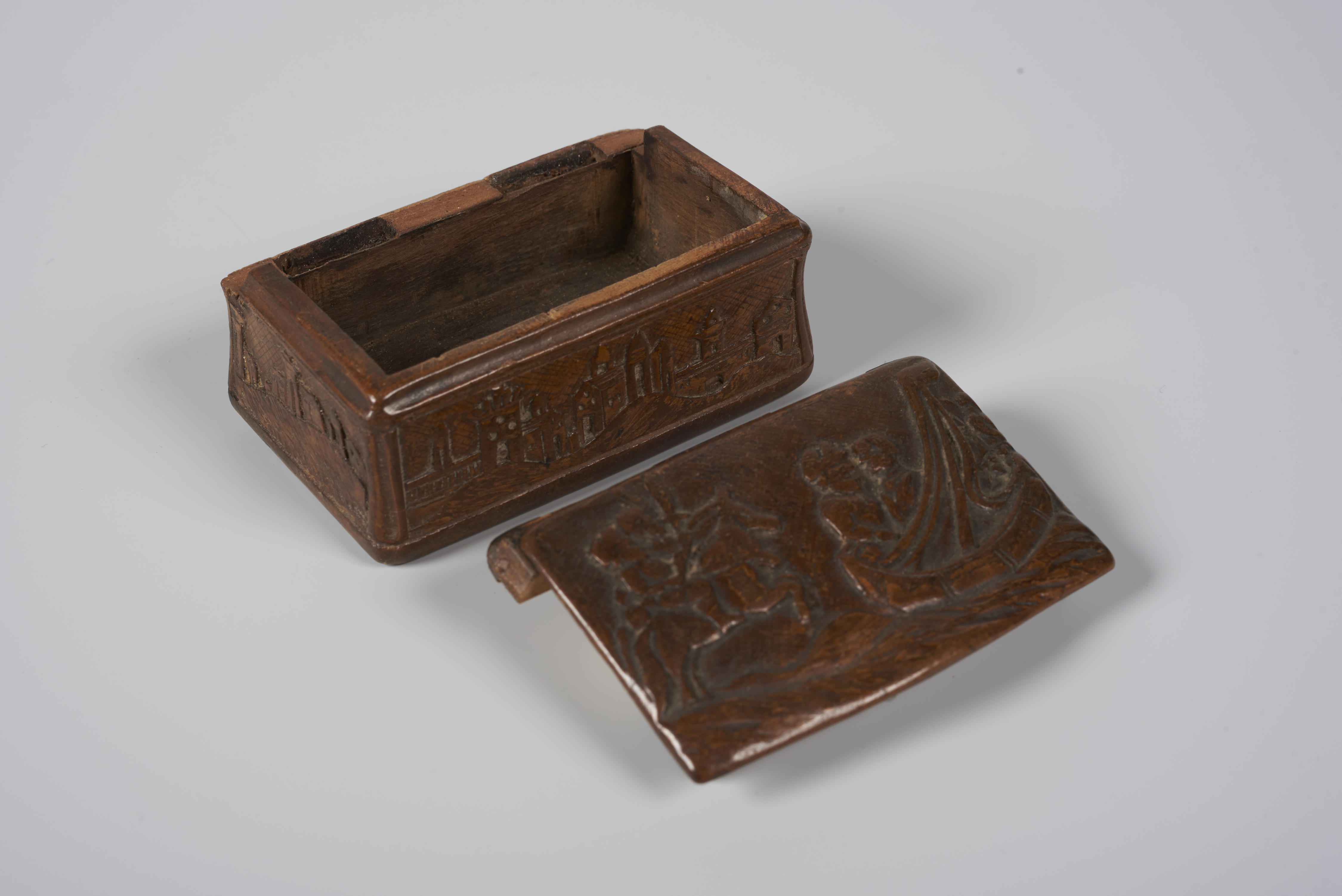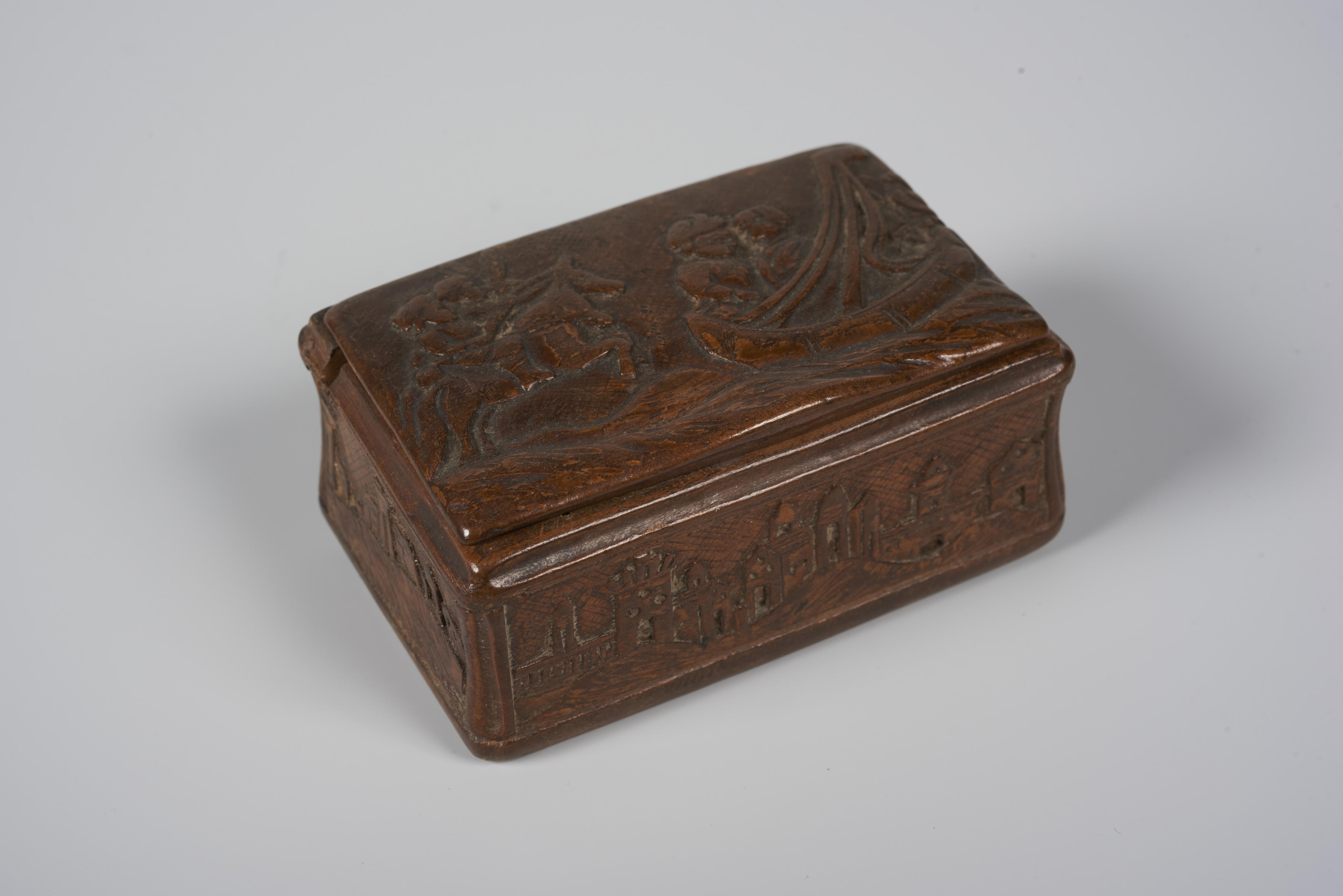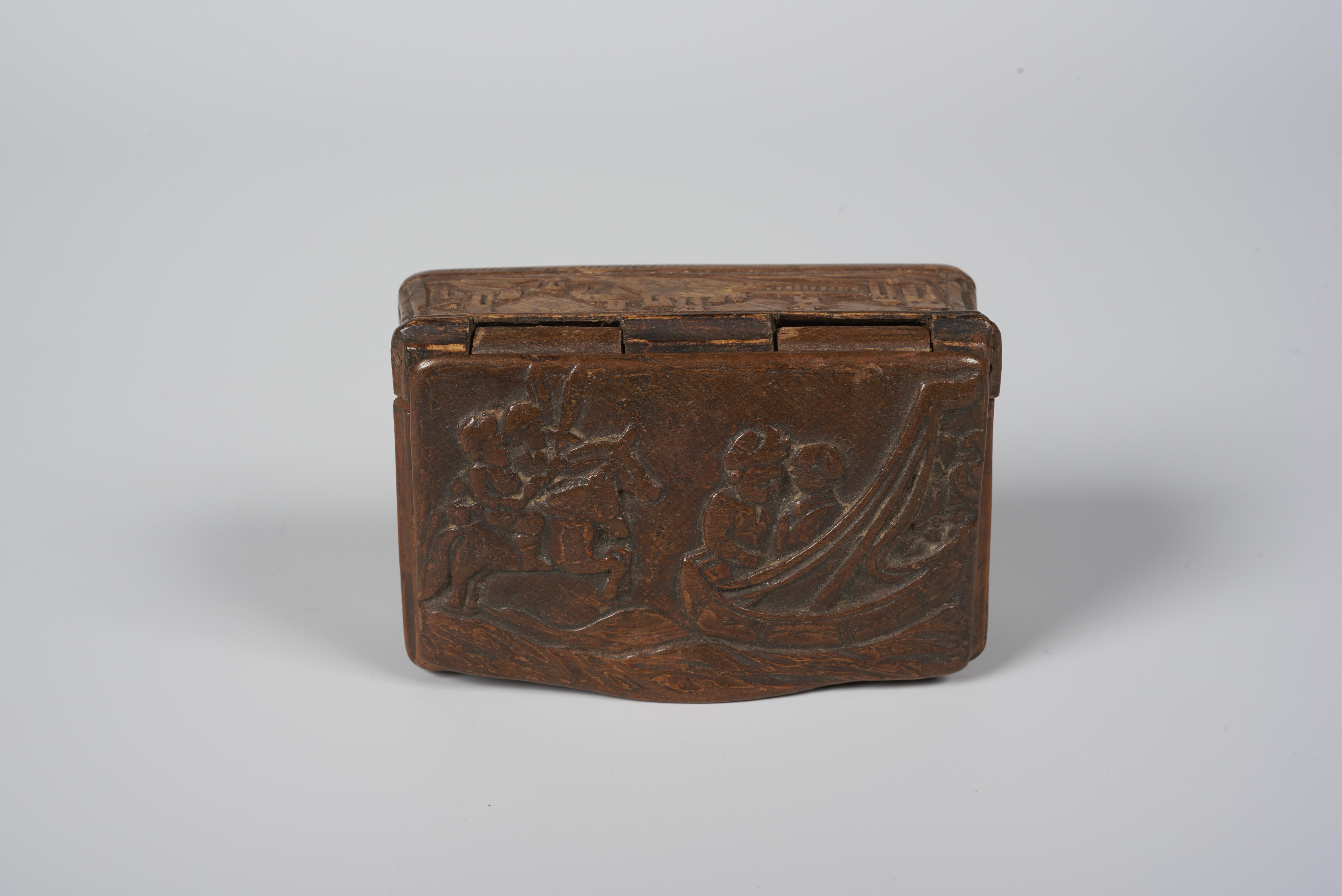 Snuifdoos met op het deksel een voorstelling van een man en vrouw op een zeilboot op zee. Links staan twee met speren gewapende ruiters op het land. Langs de vier zijkanten zijn landschapjes met bergen, huizen en paleizen te zien.