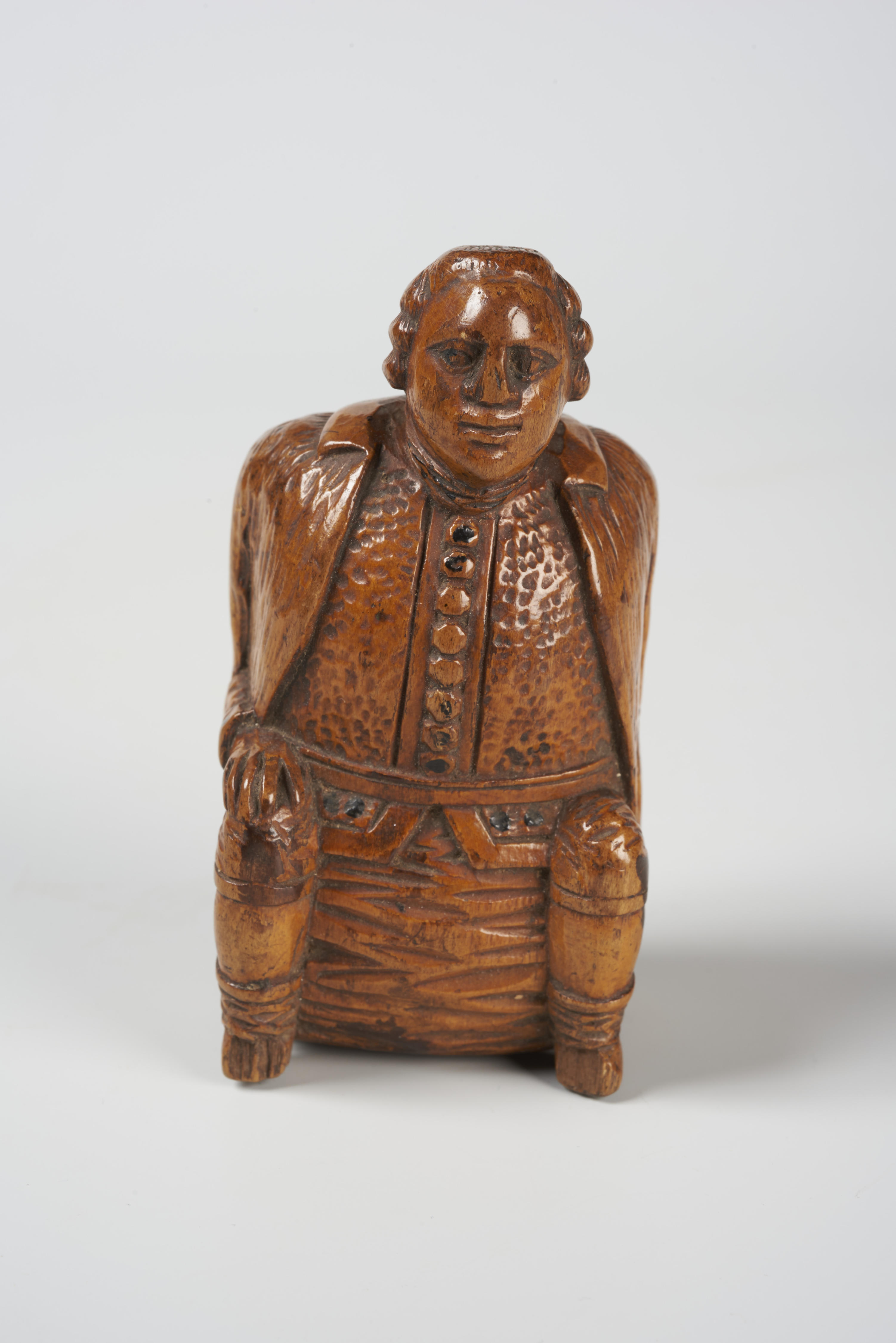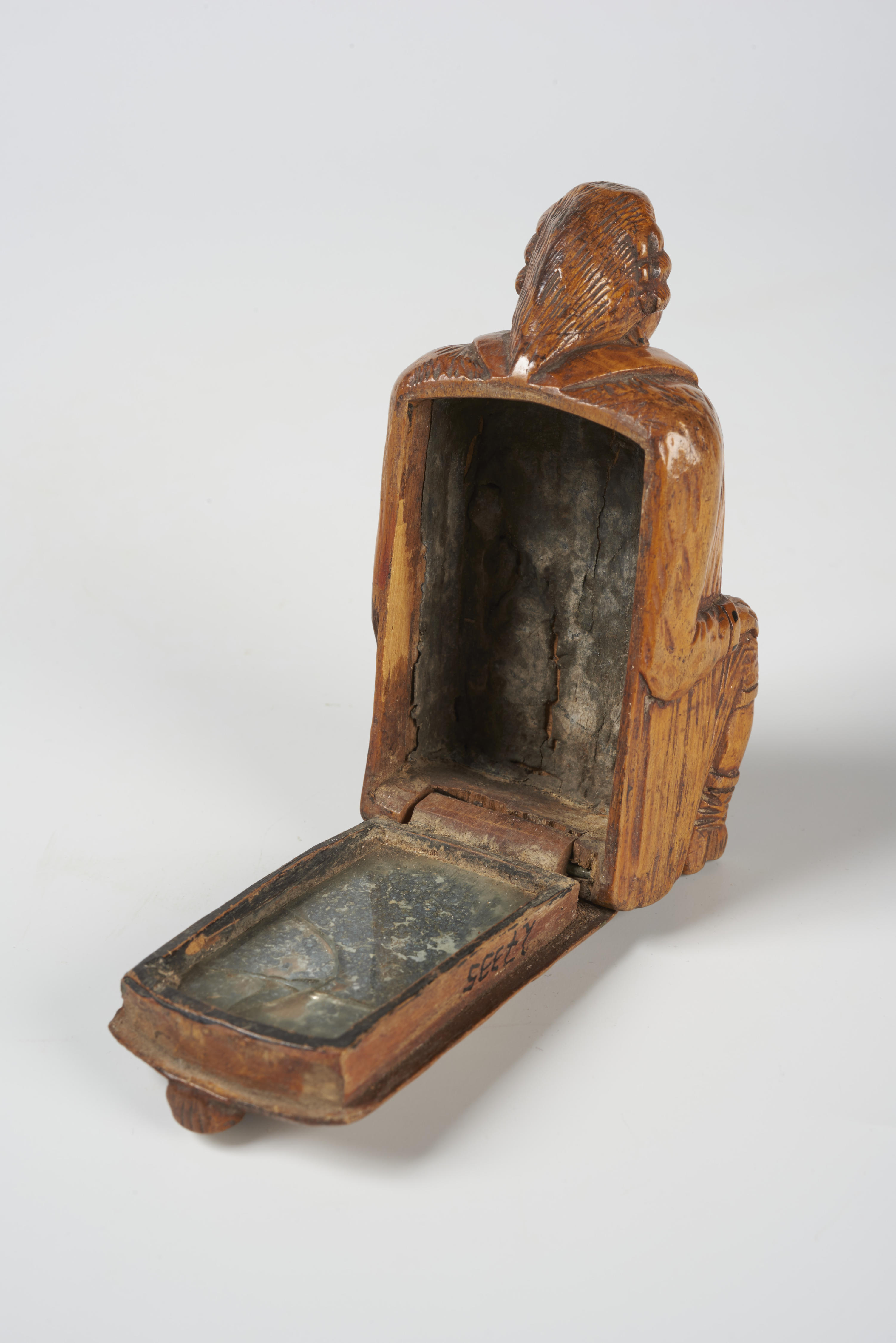 Snuifdoos in de vorm van een zittende man. De rugzijde is uitgevoerd als deksel. Aan de binnenzijde van het deksel is een spiegeltje aangebracht.