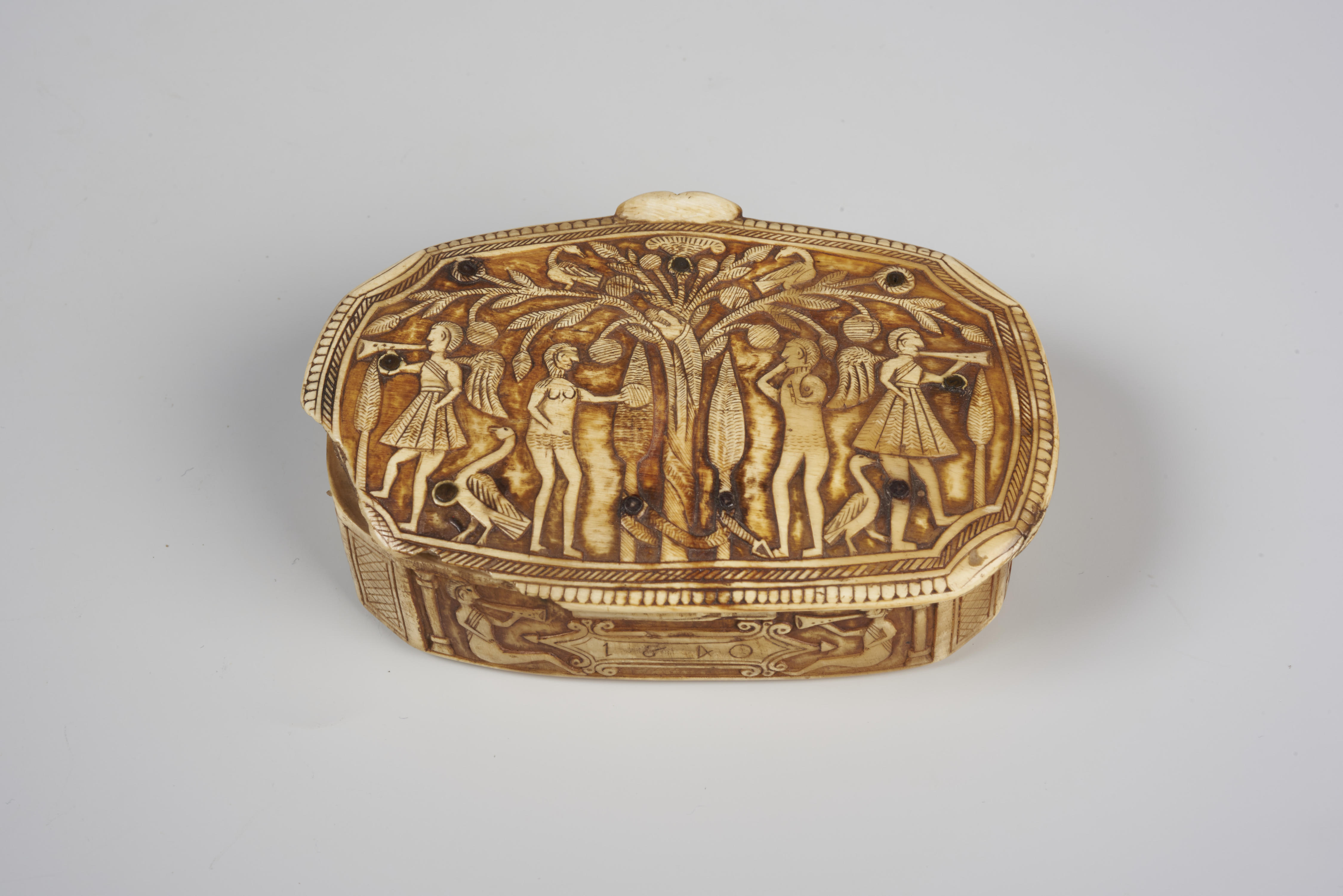 Hoornen doos met kersenhouten binnendeksel. Tussen binnendeksel en opstaande zijkant is een koperen scharnier aangebracht. De doos is aan alle kanten met gegraveerd reliëf versierd. Op het deksel staat de voorstelling van Adam en Eva in het Paradijs. De opstaande kanten zijn versierd met twee bredere en twee smallere langwerpige taferelen. Aan de voorzijde is ...