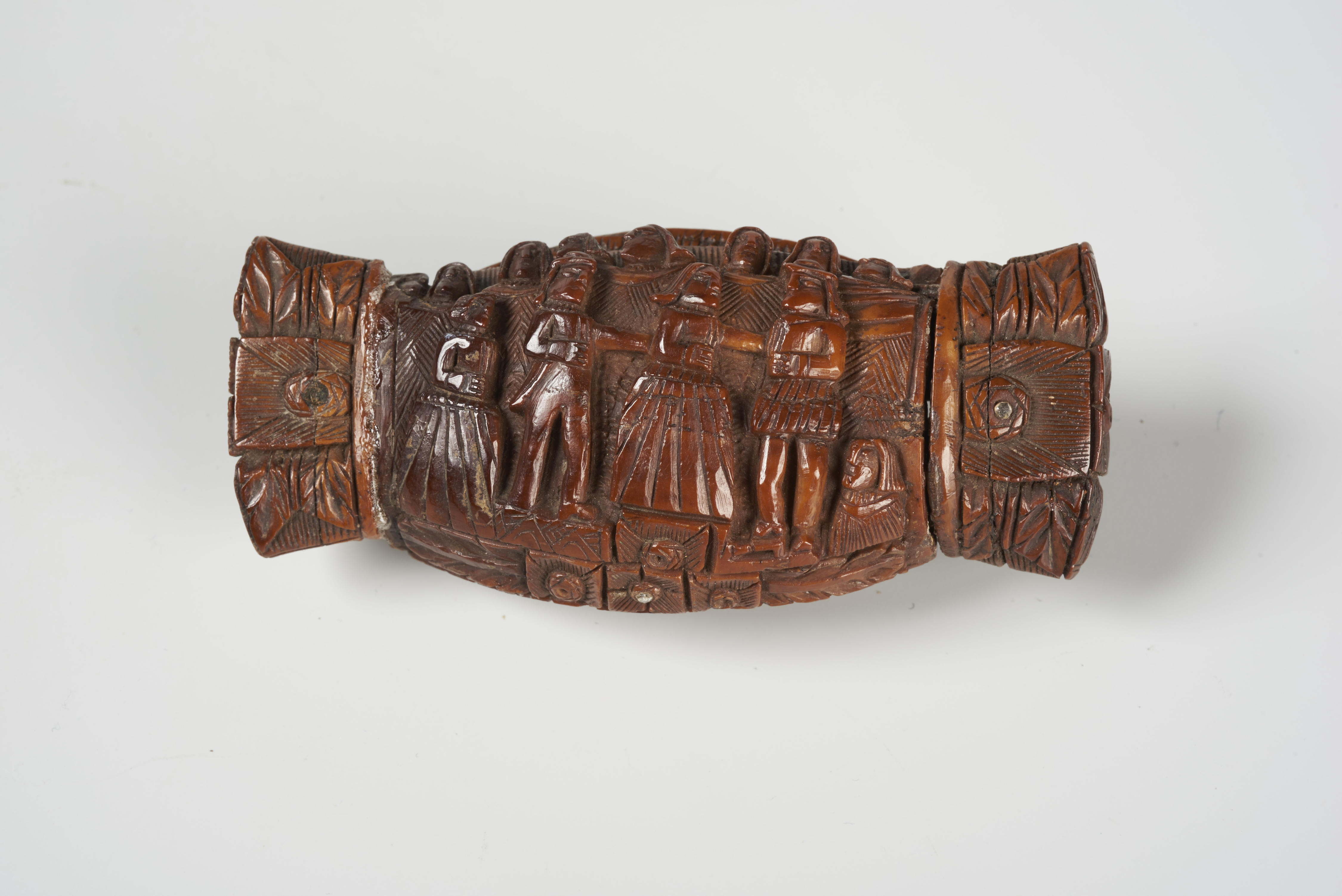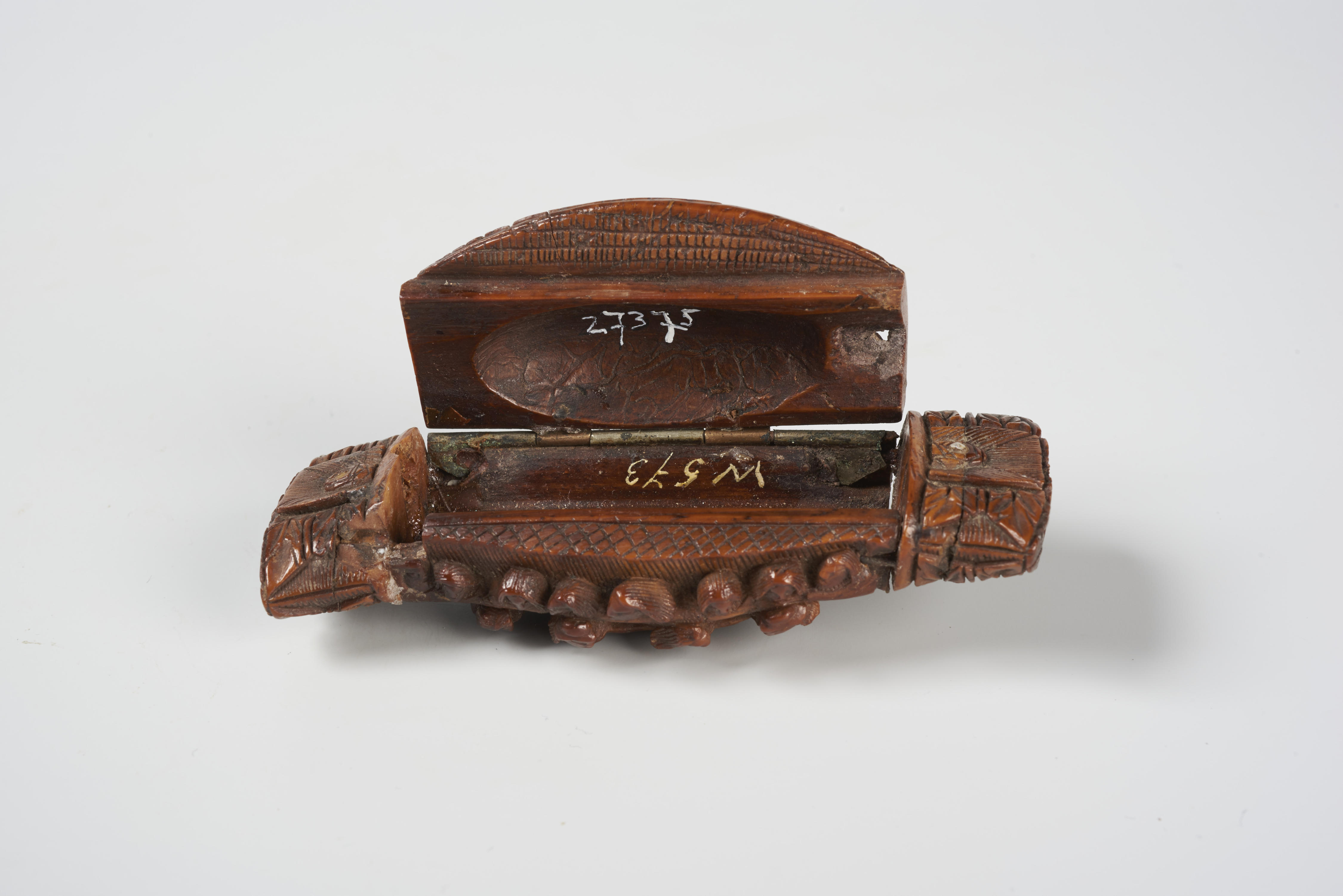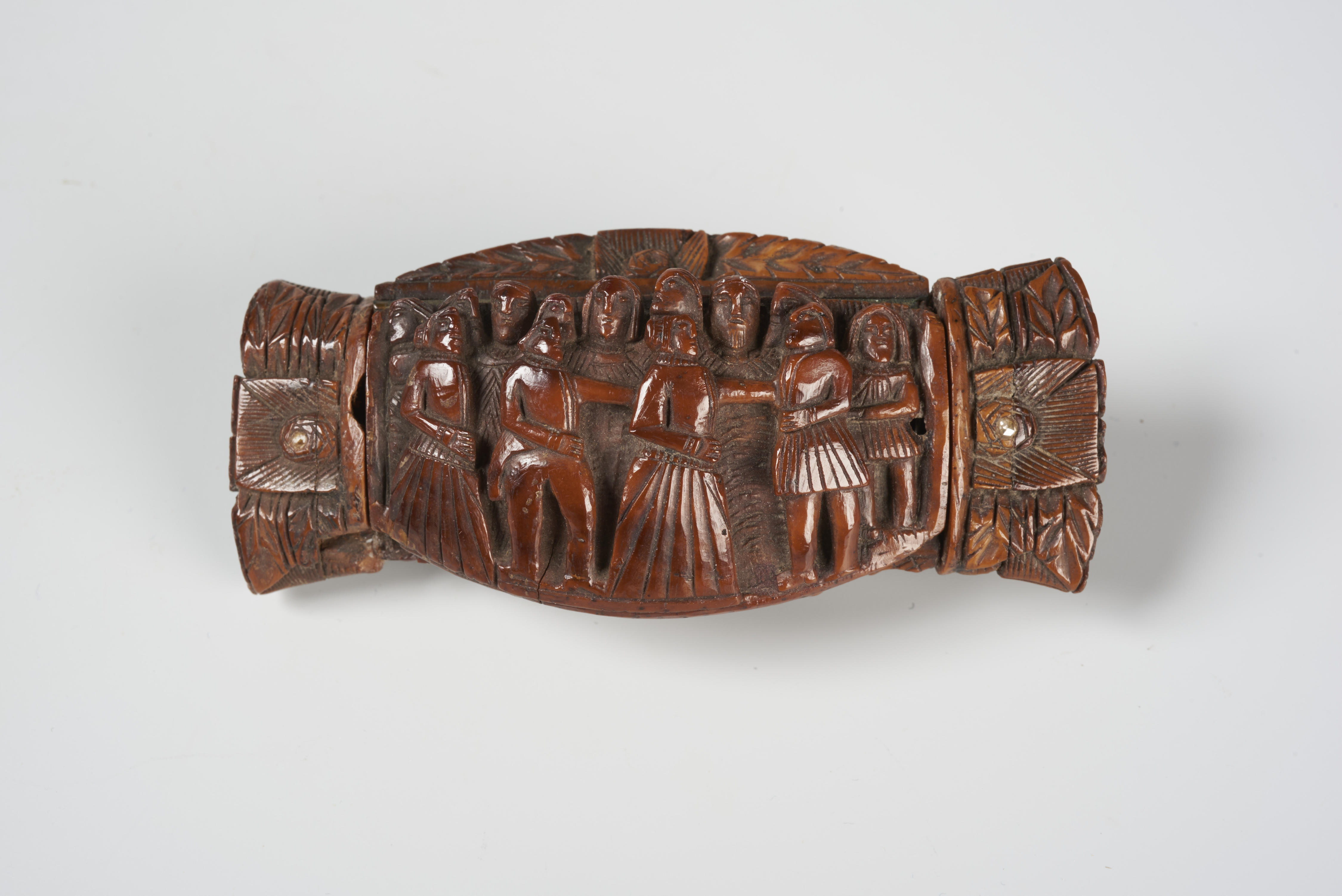 Snuifdoos met op het deksel een voorstelling van een gezelschap van mannen en vrouwen. De achterzijde van het doosje vertoont nagenoeg dezelfde voorstelling, alleen staan hier de mensen op de voorgrond op verhogingen. De uiteinden zijn aan de boven- en onderzijde op gelijke wijze versierd met een gestileerde roos tussen bladeren.