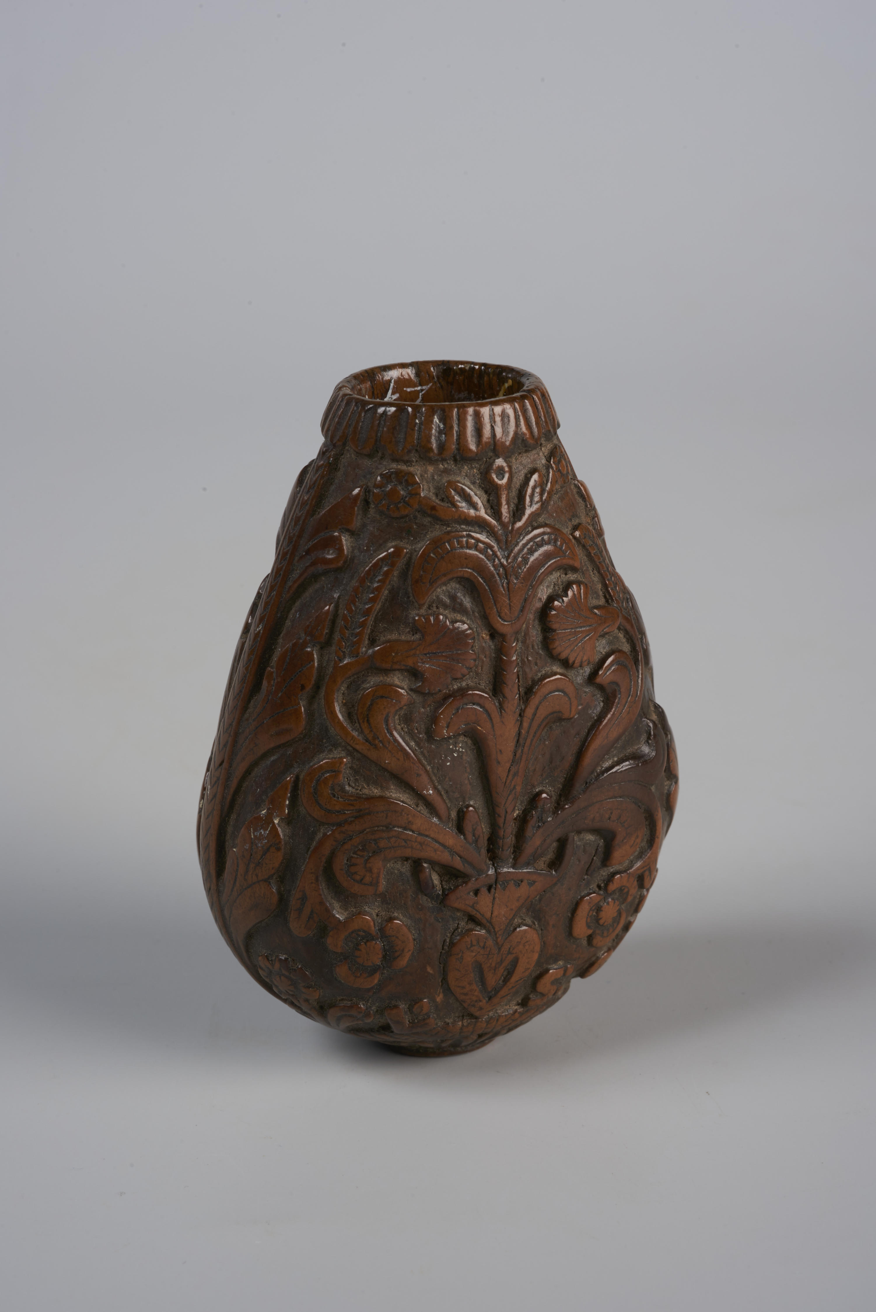 Palmhouten flesje, mogelijk een kruithoorn. De stop die als afsluiting voor het vulgat diende, is niet meer aanwezig. De ene vlakke kant is versierd met een staande engel, die met een veren pen in het Boek des Levens schrijft. Rechts van deze engel zijn een grafsteen met een liggend kruis en een schedel met beenderen ...