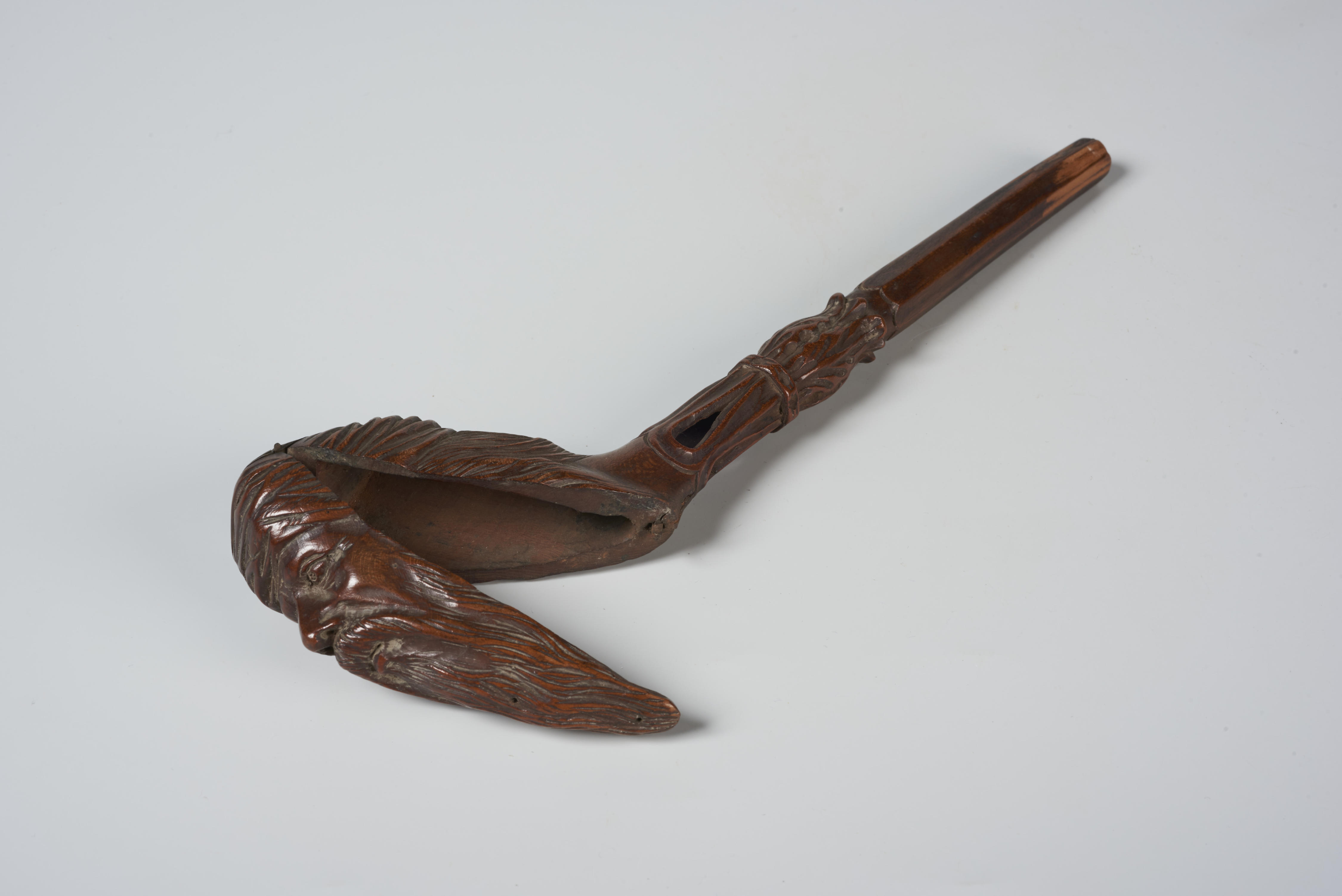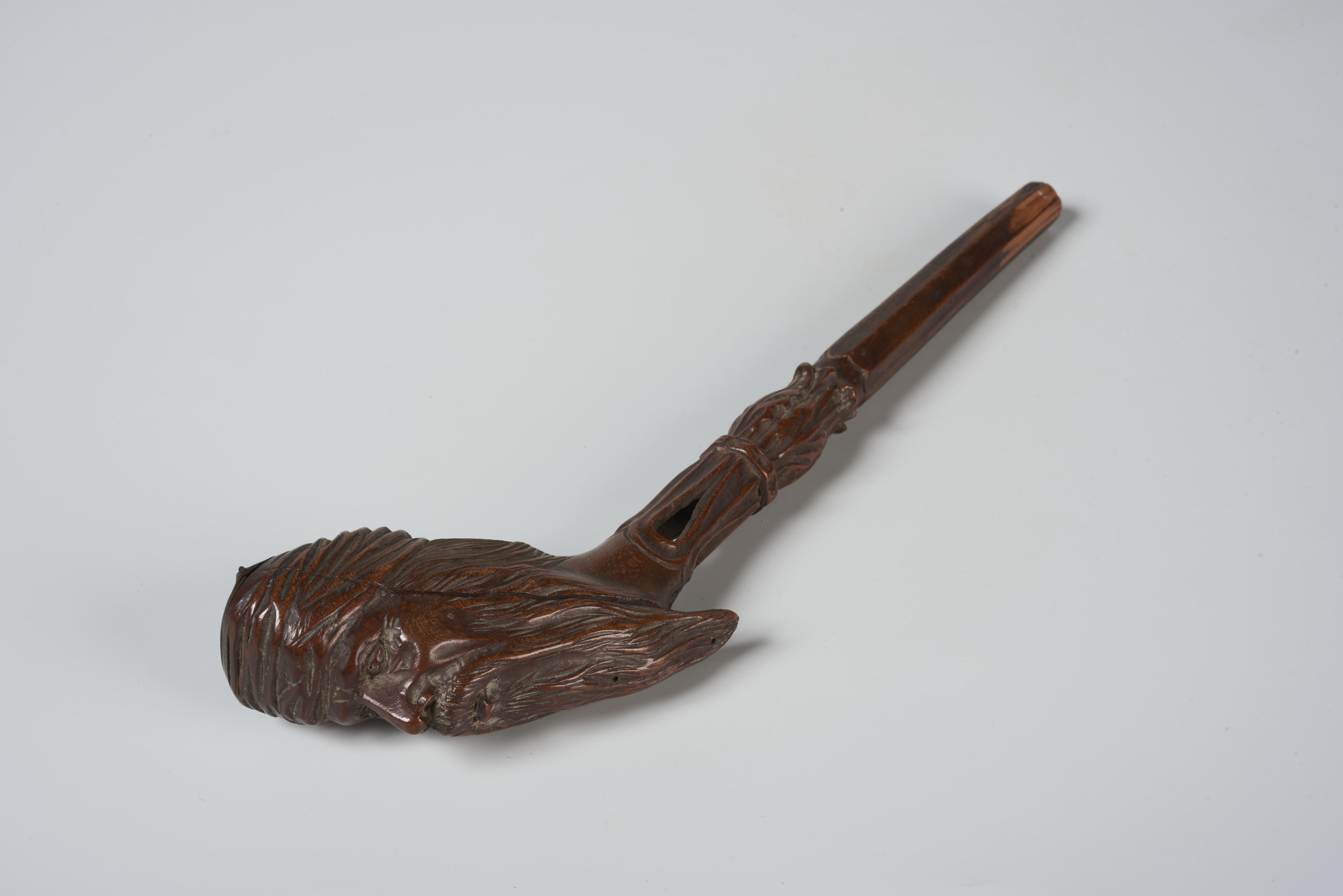 Houten pijpenkas met een kop in de vorm van een mannenhoofd met een baard en een tulband. De pijpenkas is afkomstig uit Frankrijk.