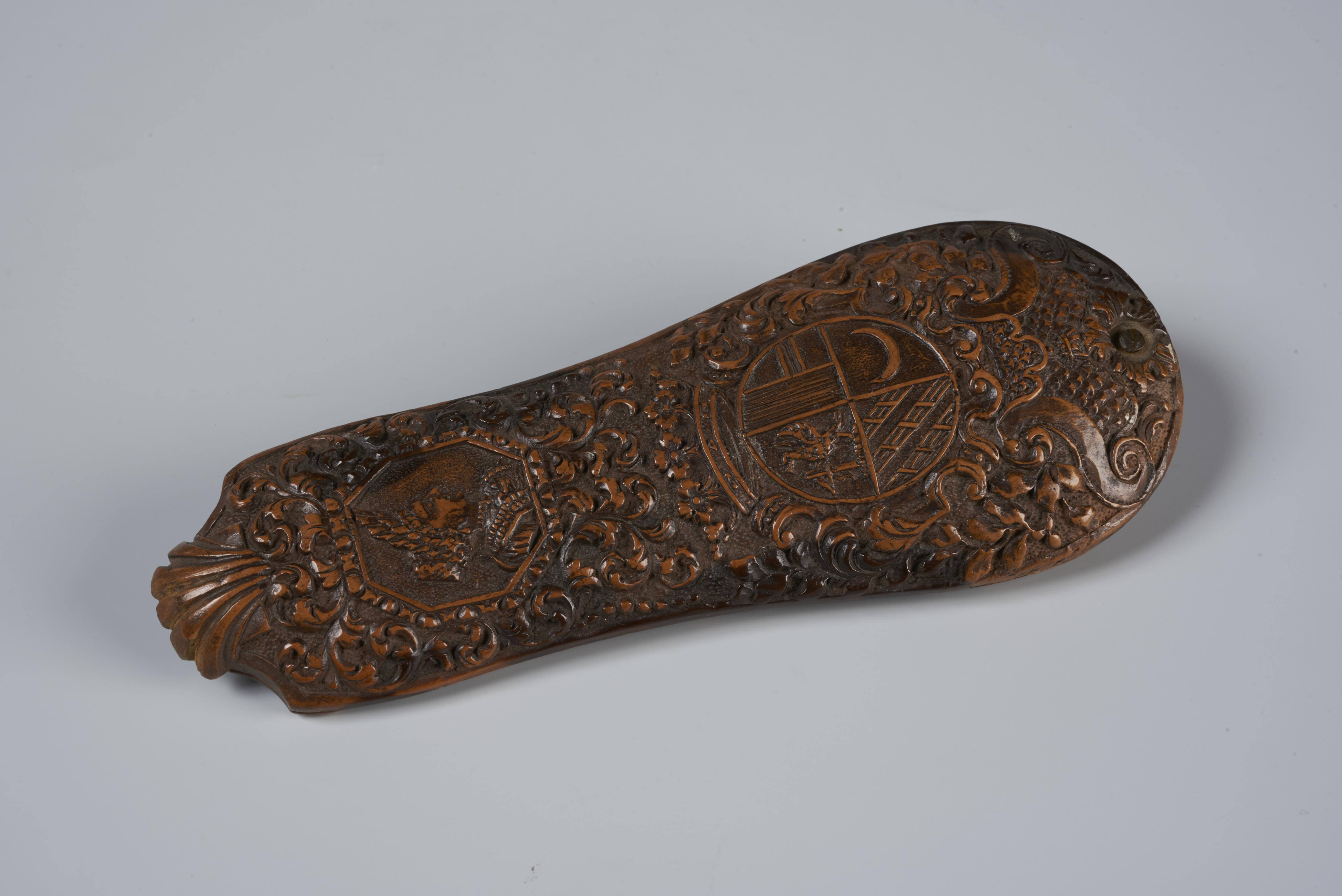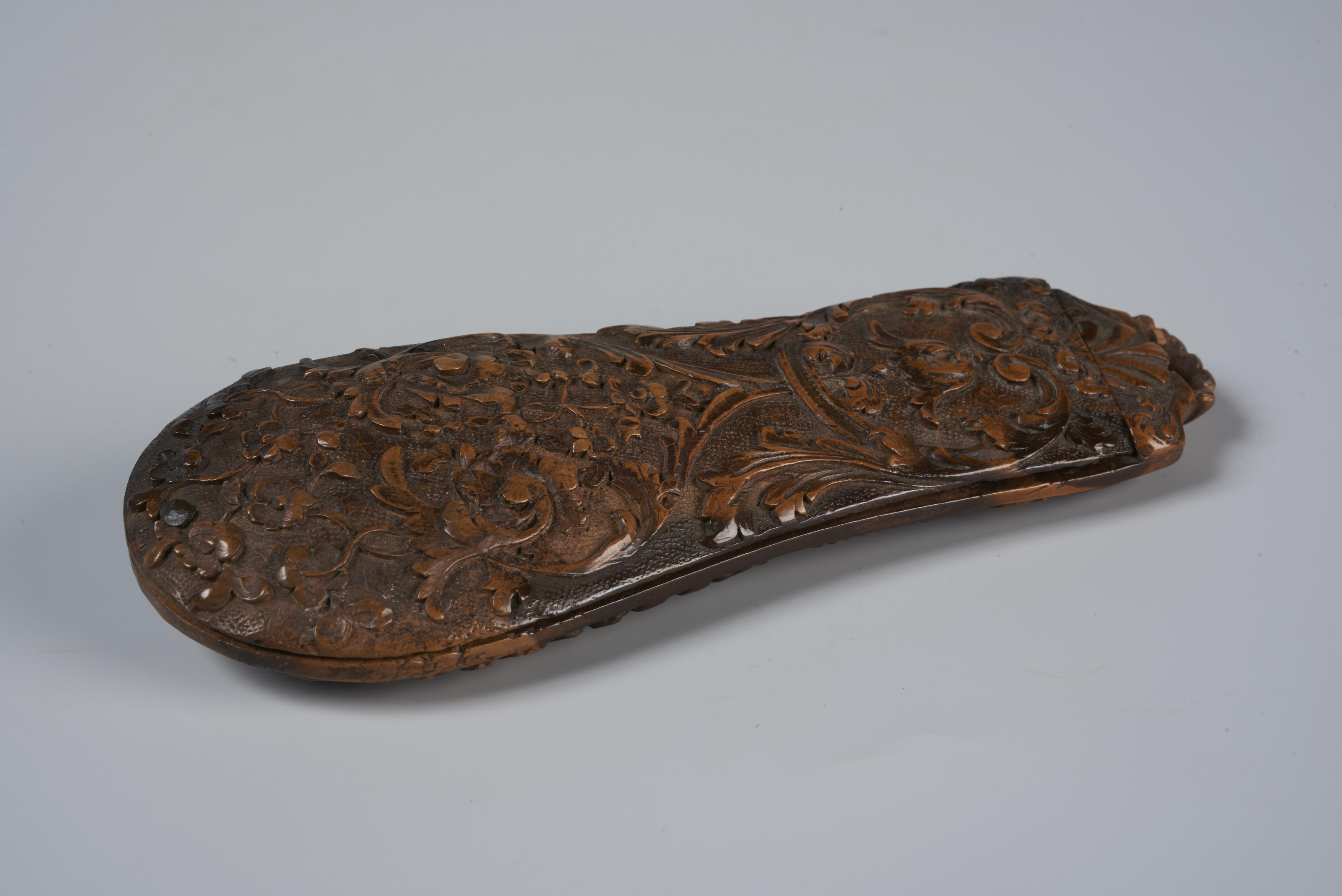 Buxushouten snuifrasp, op bestelling in Frankrijk vervaardigd. De snuifrasp was waarschijnlijk eigendom van Jan Reint de Sigers ther Borch. Jan Reint werd gedoopt in Groningen op 17 april 1678 en is overleden in Langweer op 10 maart 1753. Hij was heer van Vennebroek bij Paterswolde en kapitein in het regiment van de prins van Oranje. ...
