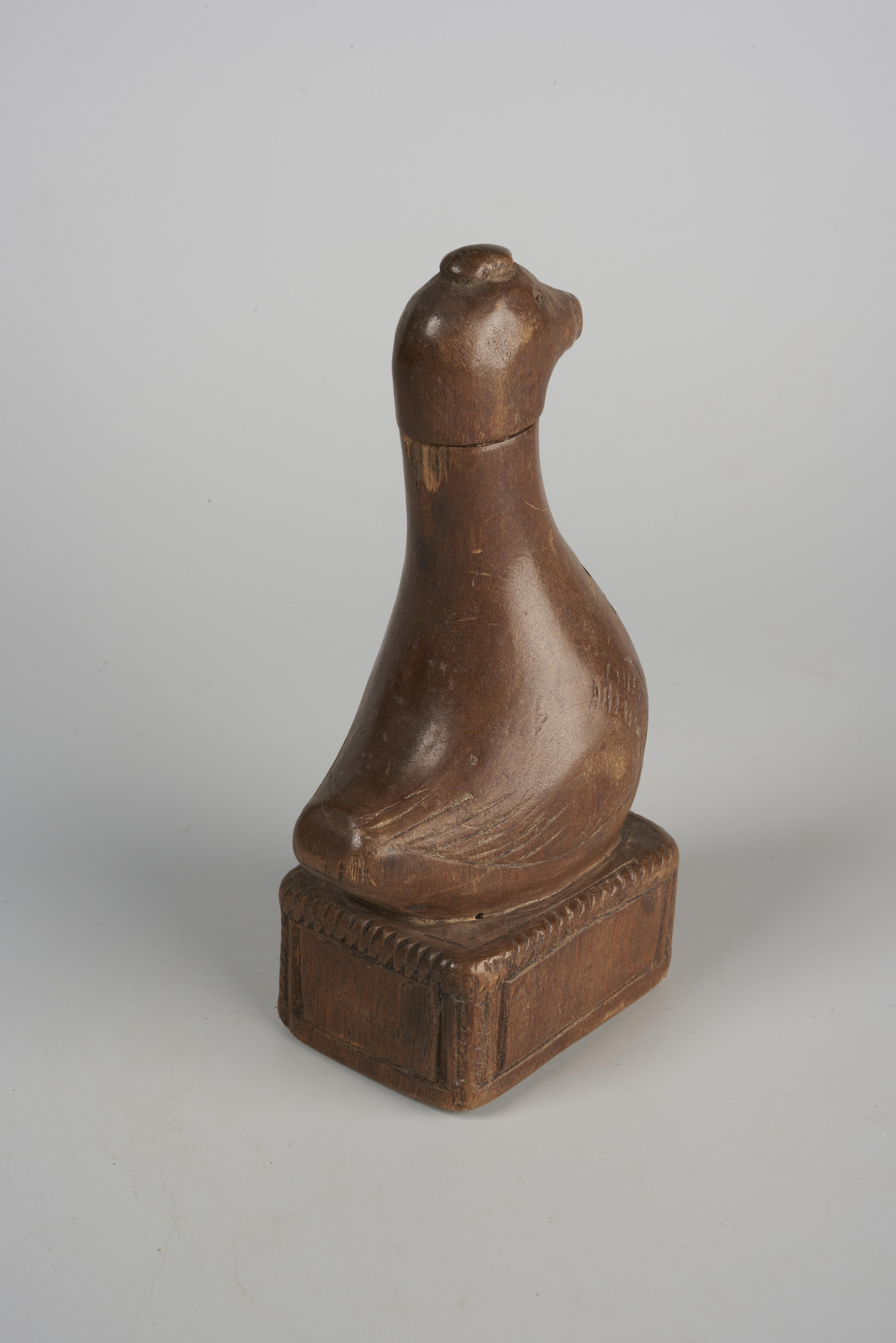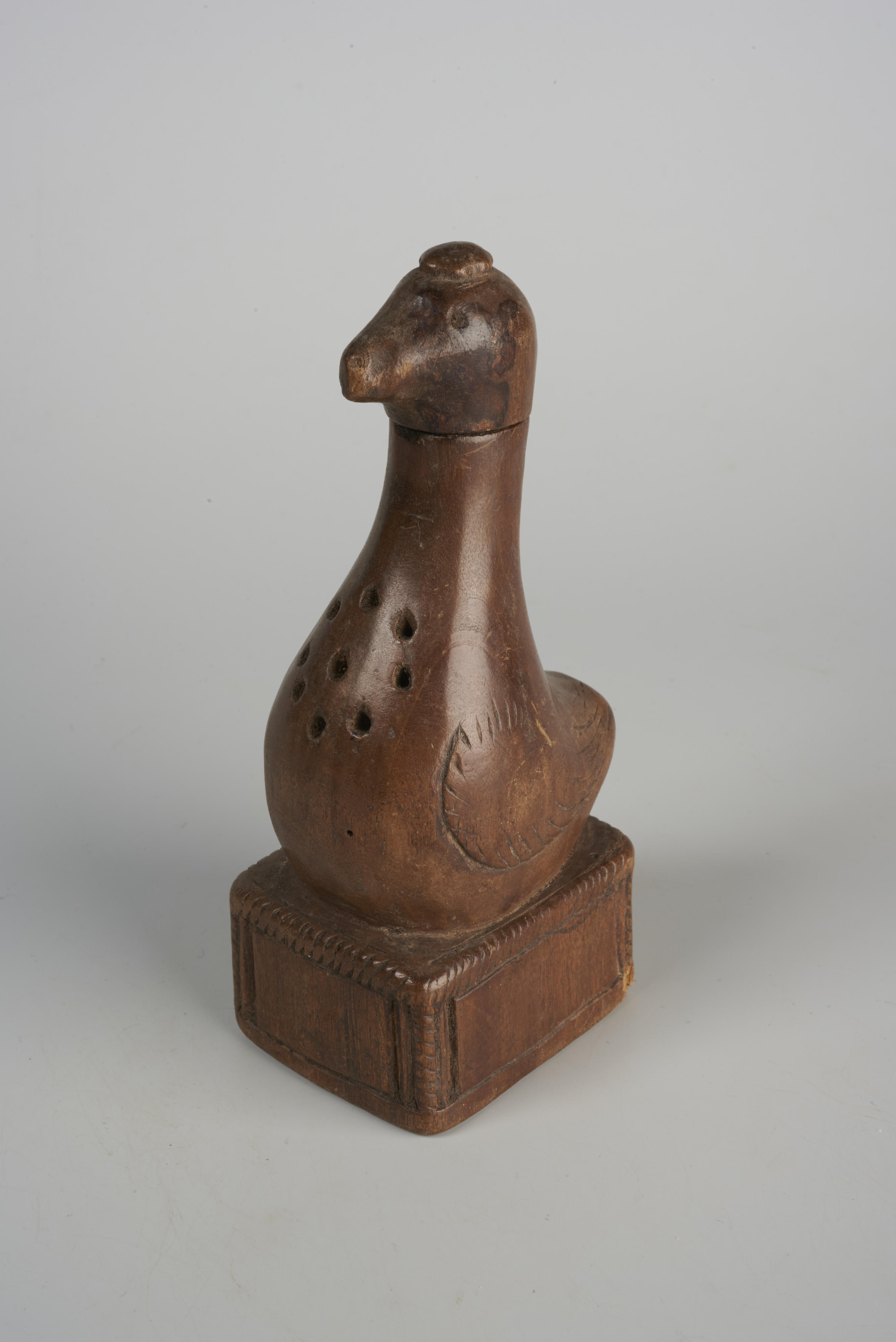 Houten strooivat in de vorm van een vogel op een kistje. Het strooivat zou in Limburg gemaakt zijn.