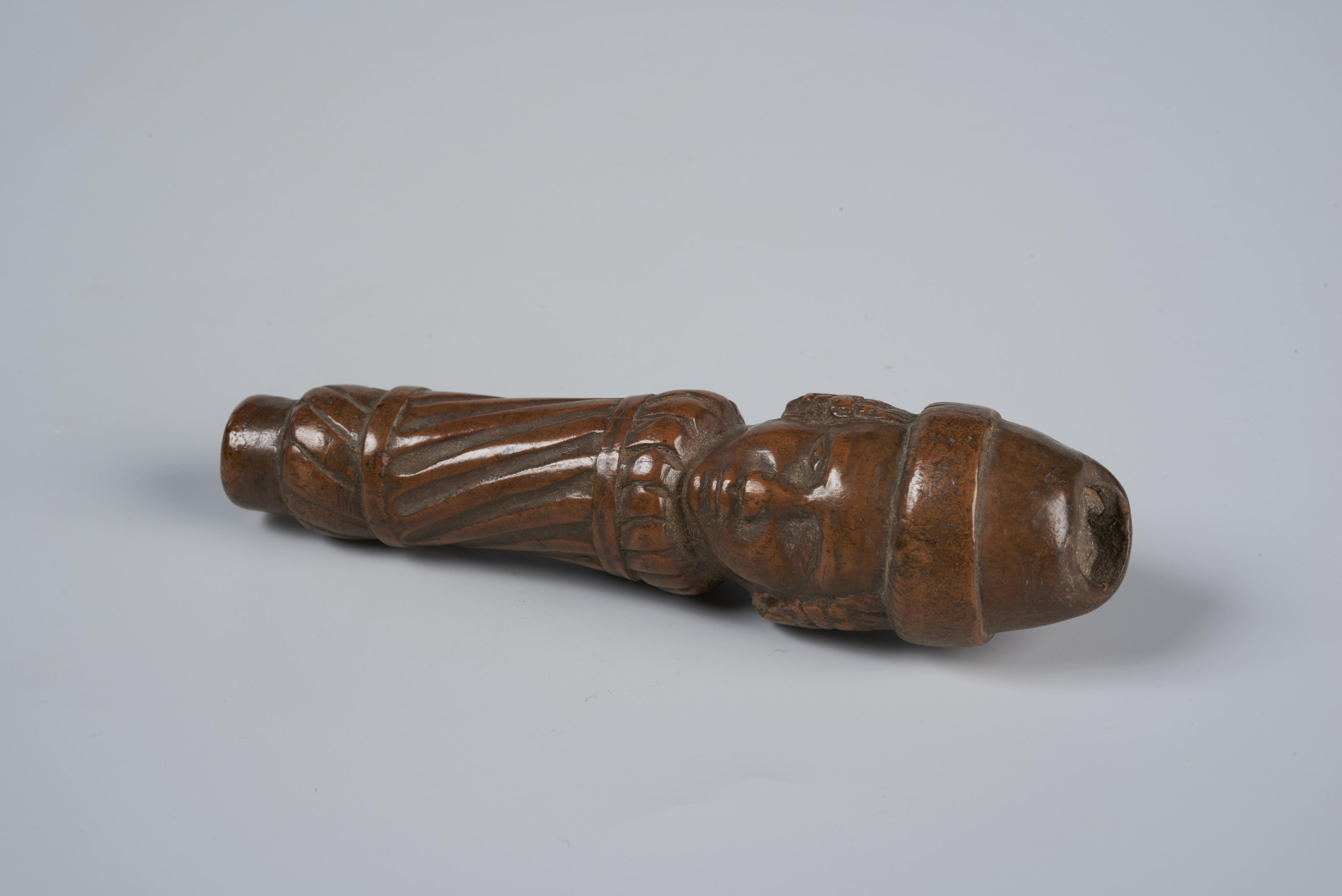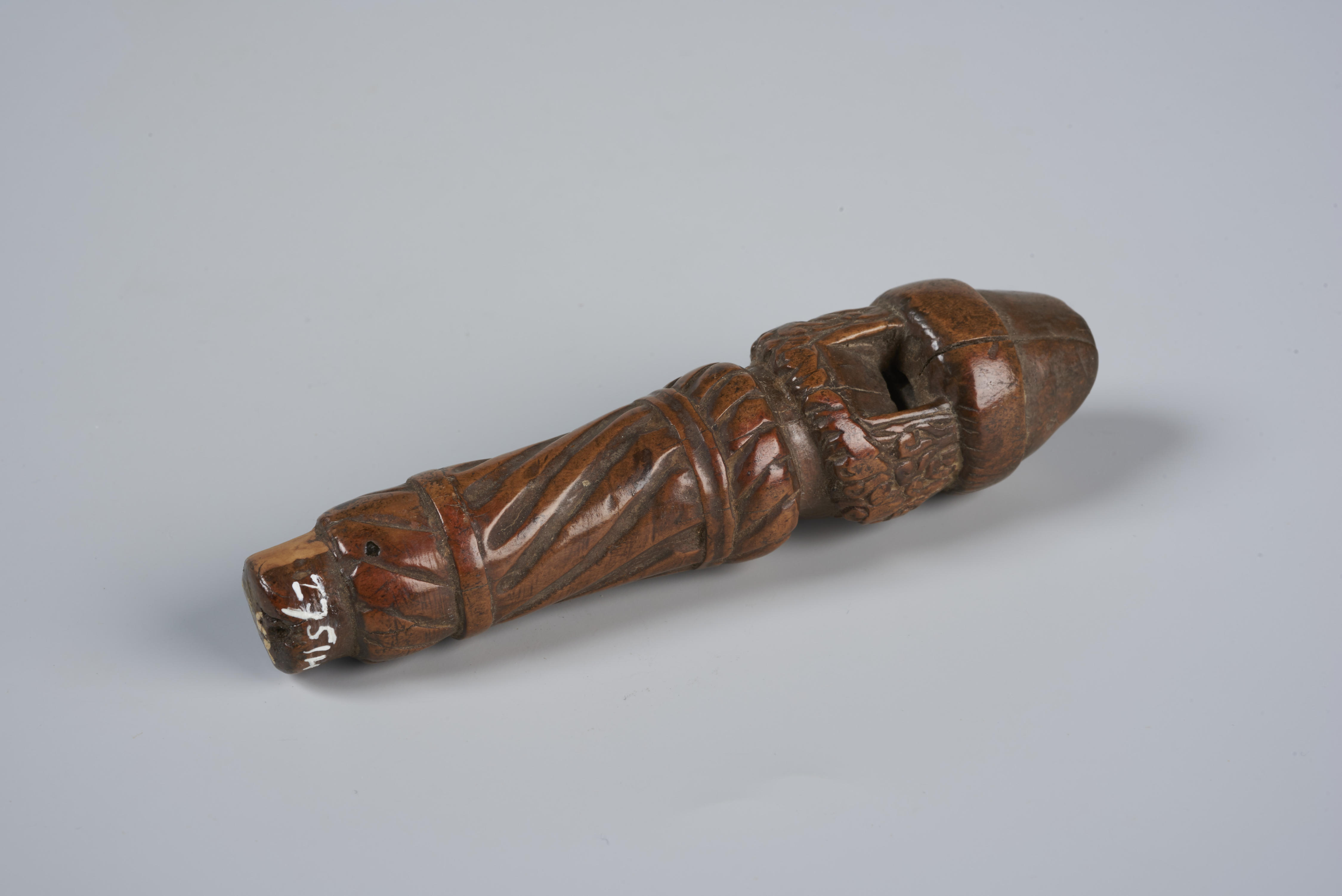 Houten fluitje. Het mondstuk wordt gevormd door een manshoofd met een hoed. Onder de hals is het grootste deel van het fluitje getorst. Het fluitje zou afkomstig zijn van een schaapherder uit Noord-Brabant.
