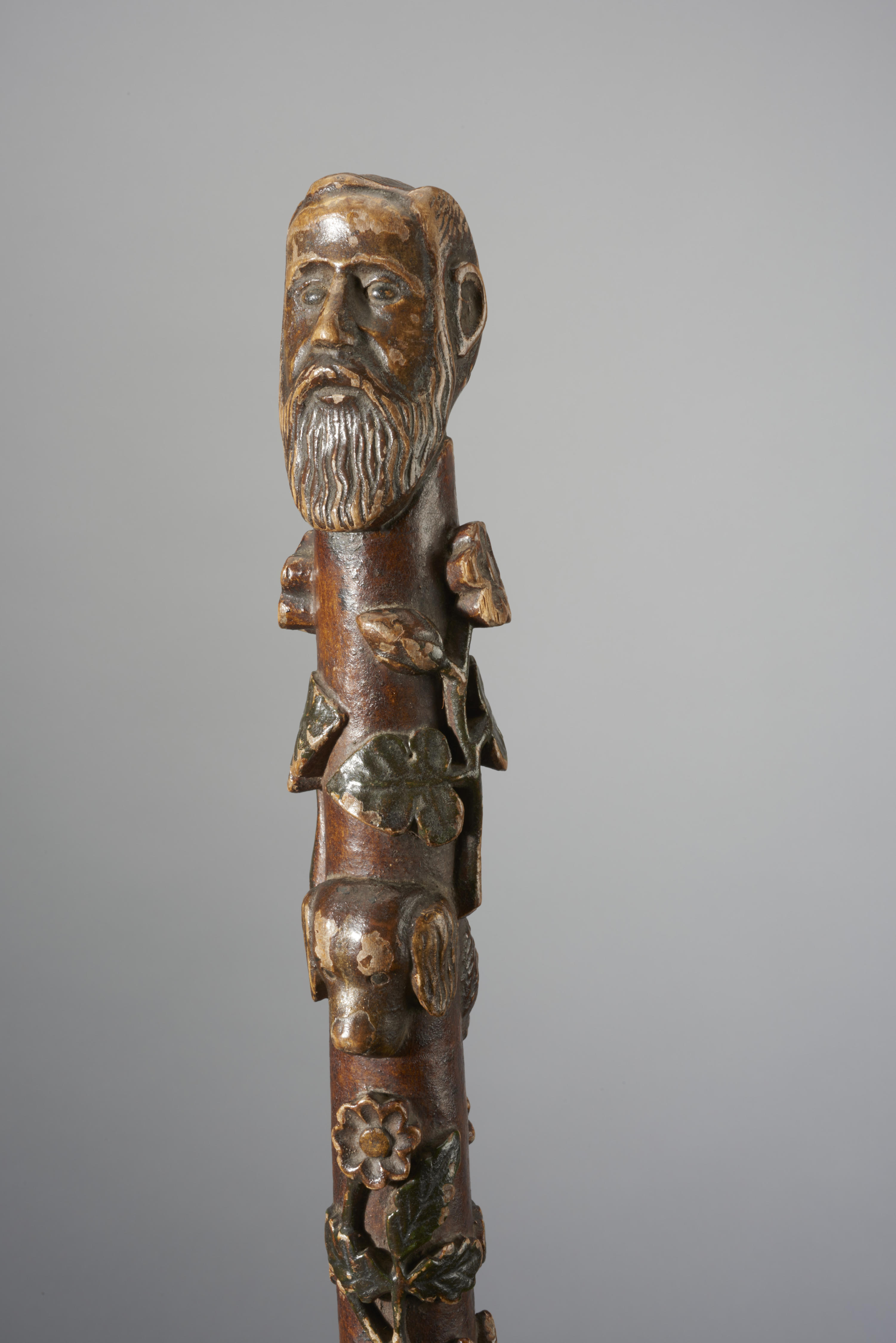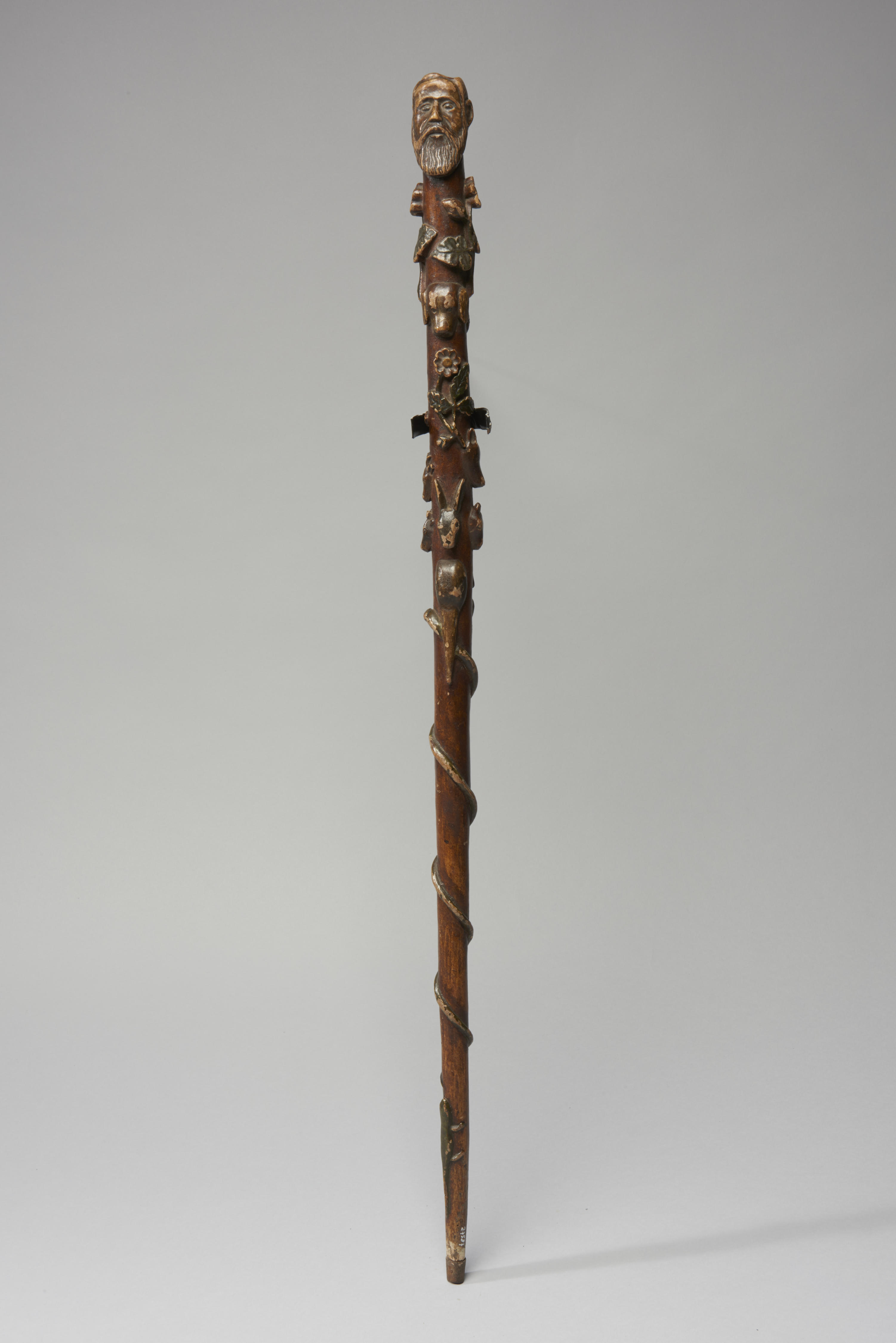 Wandelstok, versierd met verschillende reliëfs: bloemtakken, de kop van een hond, een leeuw, een vos, een hert, een ezel, een koe, een vogel, een konijn, een paardenhoofd, een kikker, een slang die om de stok heen gekruld is en een hagedis. De wandelstok heeft een knop in de vorm van een mannenhoofd met snor en ...