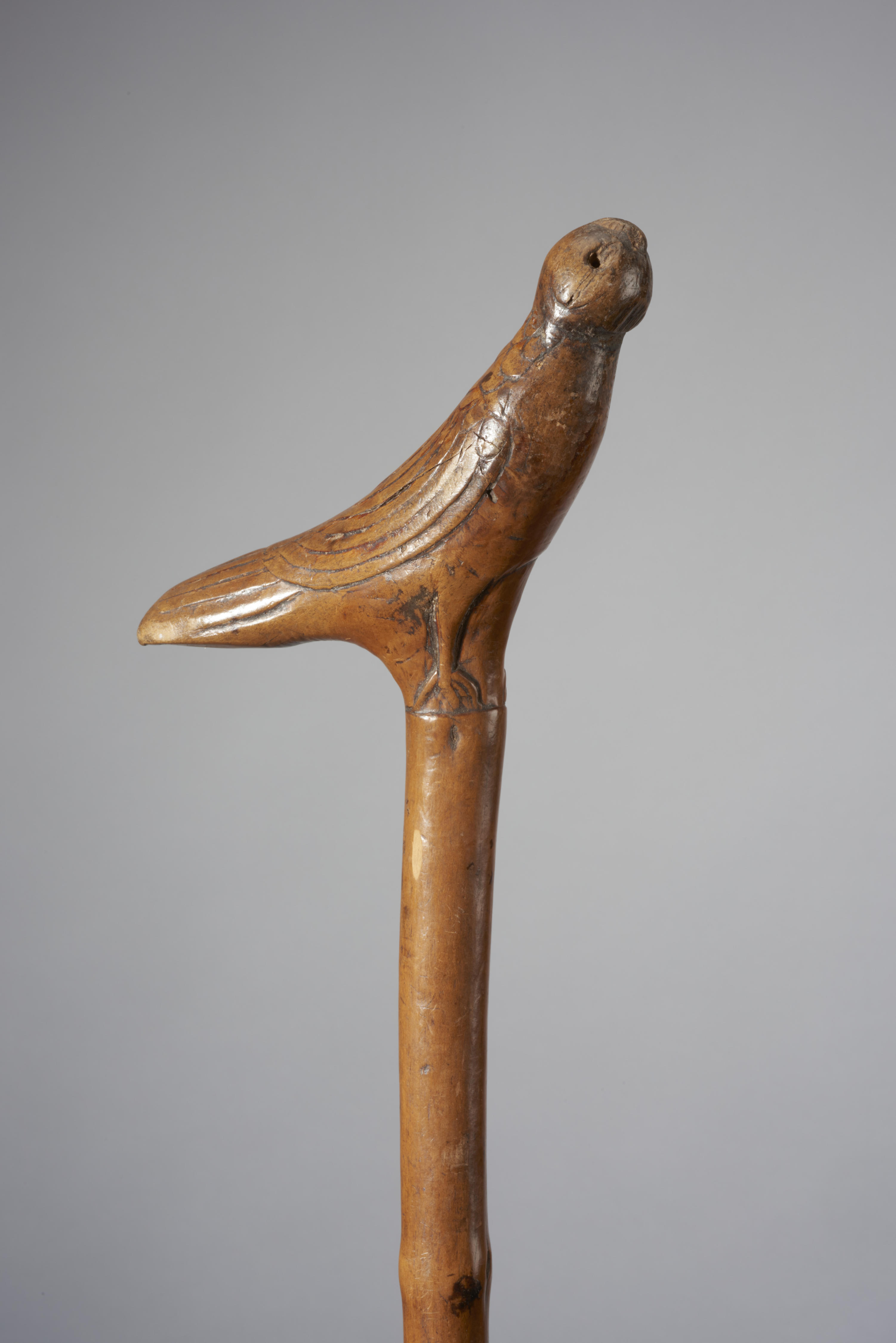 Wandelstok met een knop in de vorm van een vogel. De wandelstok is afkomstig uit de Achterhoek.