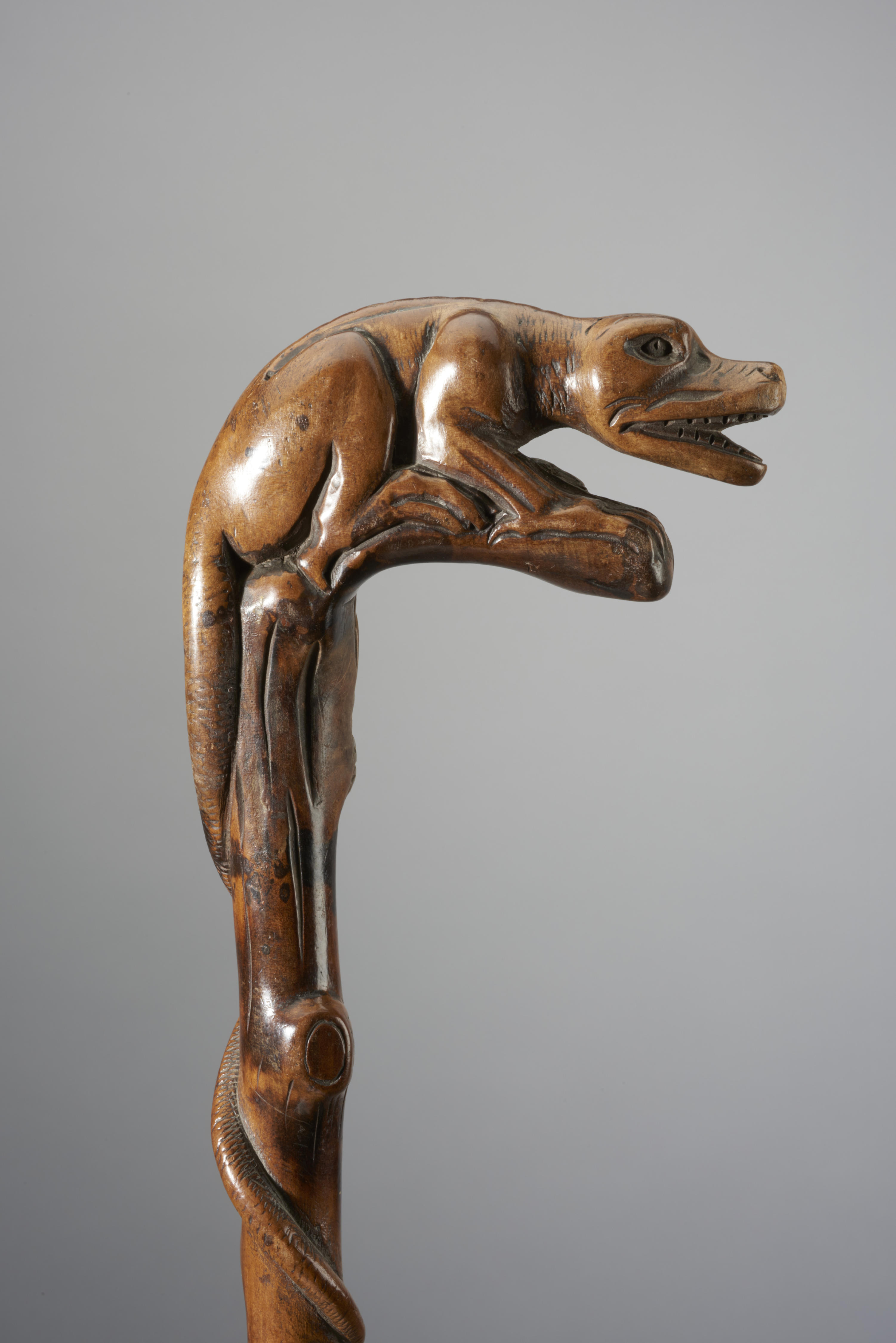 Wandelstok met een knop in de vorm van een dier met grote klauwen en een staart die om de wandelstok heen gewikkeld is.