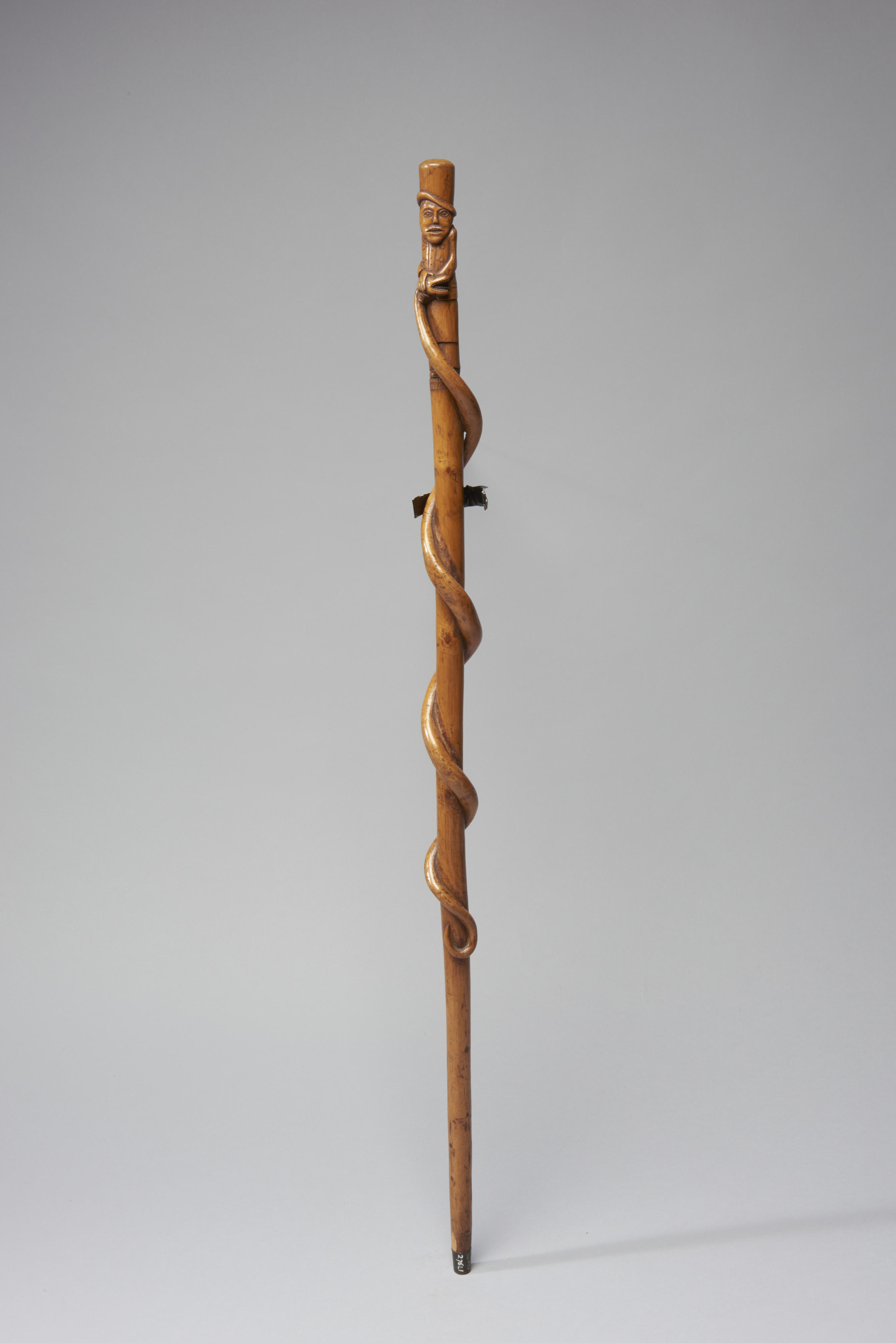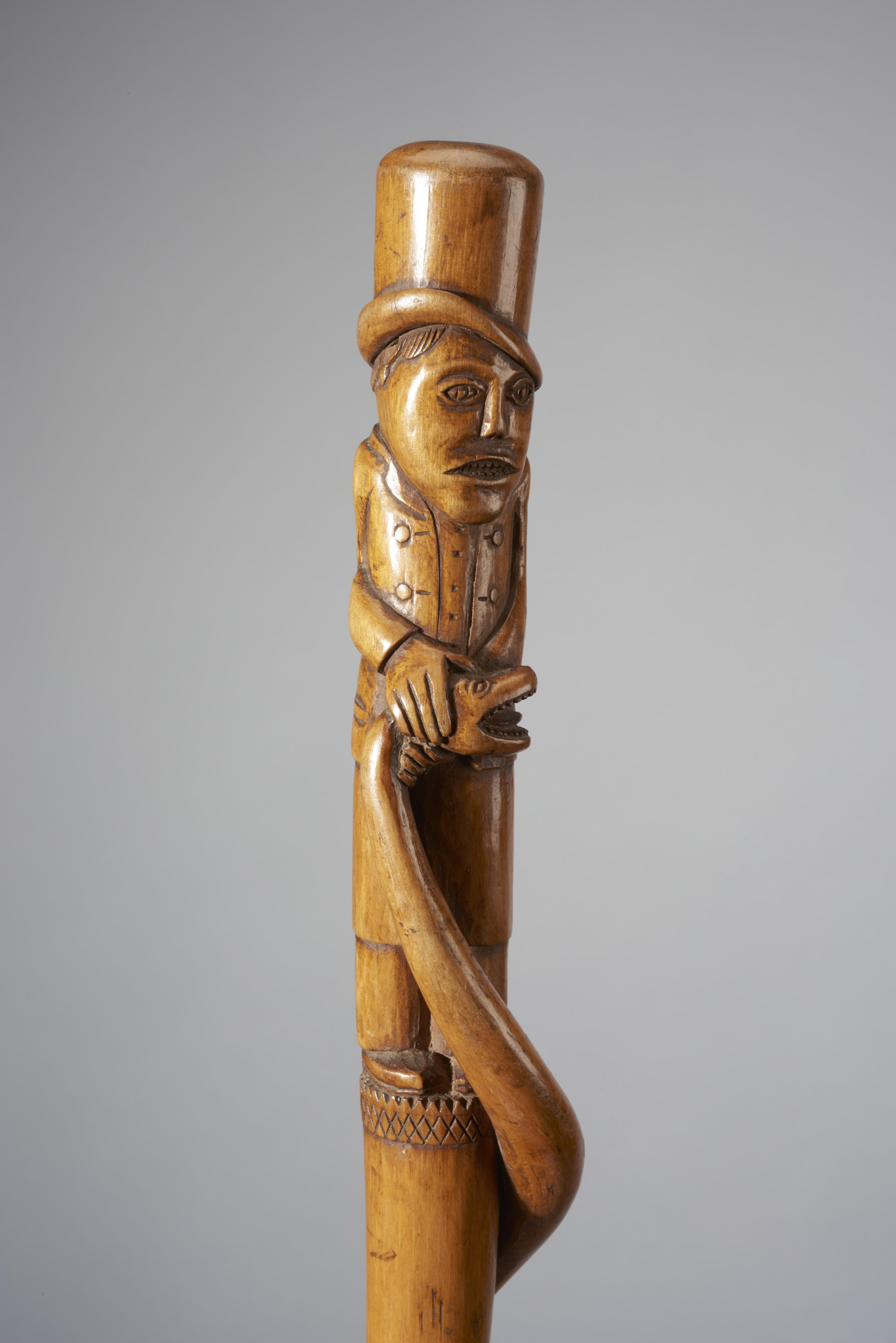 Wandelstok met een knop in de vorm van een man met een hoge hoed. De man houdt een slang vast die om de wandelstok gedraaid zit. De stok is afkomstig uit Vlaanderen.