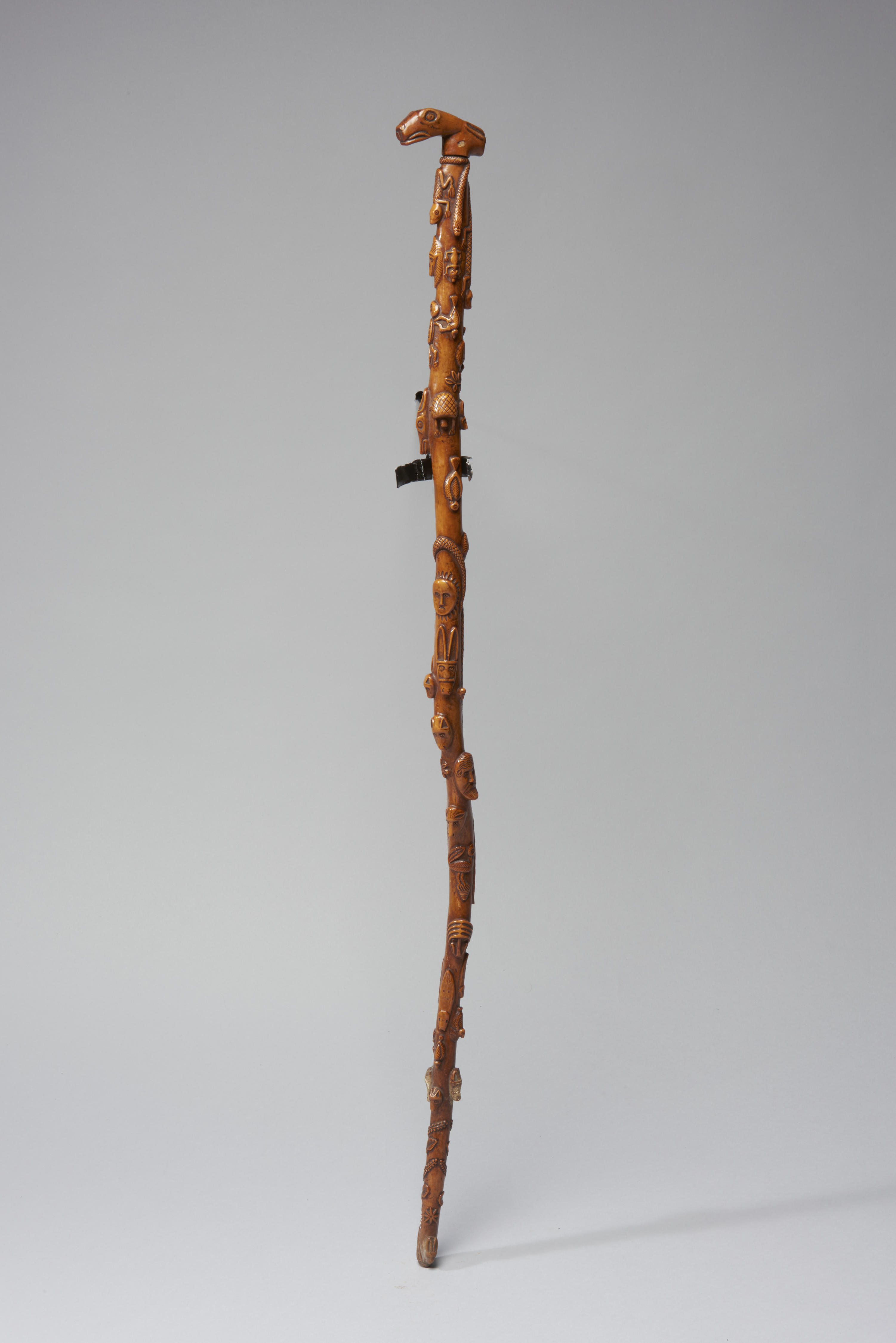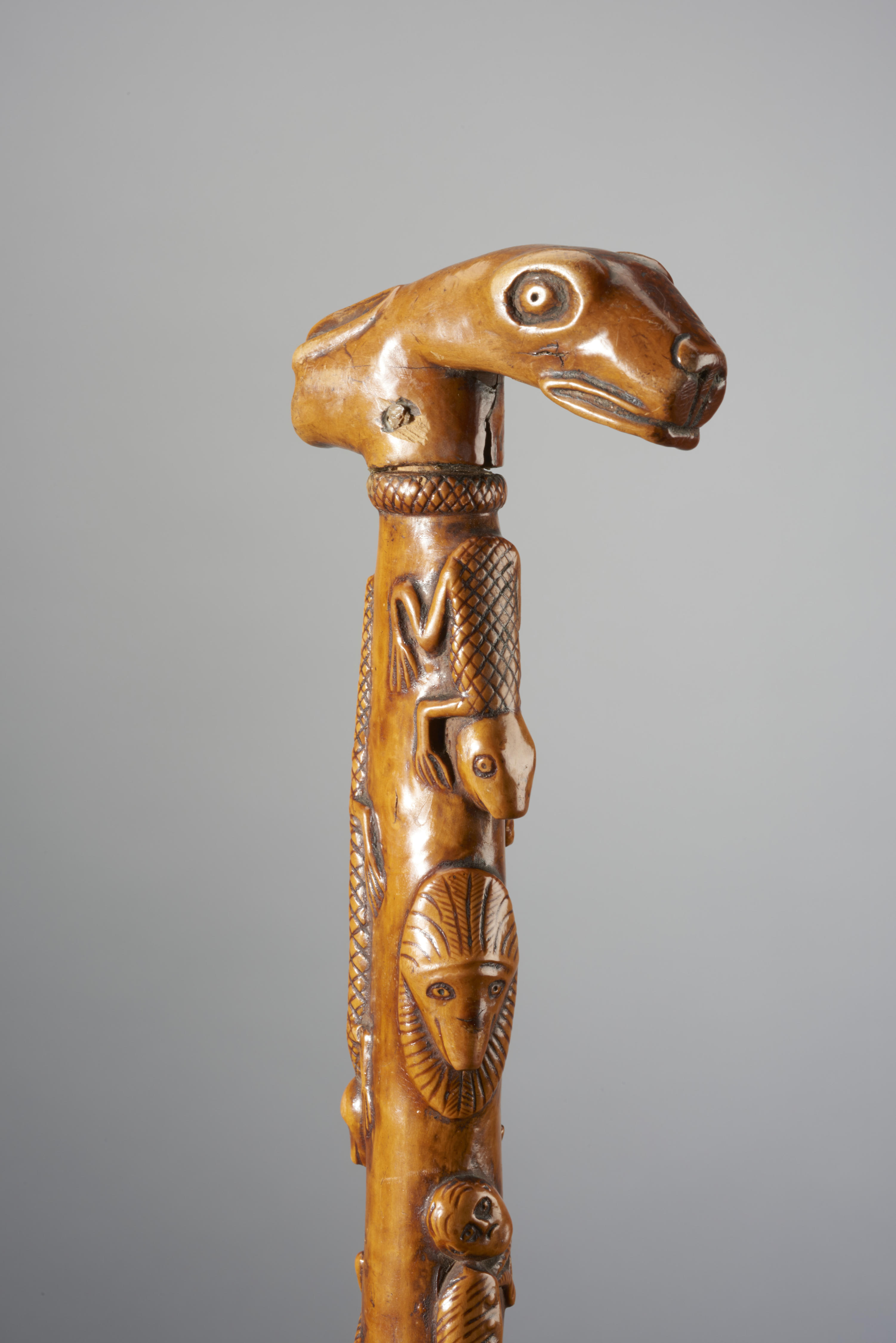 Wandelstok met een handgreep in de vorm van een fabeldier. Op de stok zijn verschillende figuren afgebeeld, waaronder een kikker, een leeuwenkop, een uilenkop, een ezelskop, een kruipend dier met het opschrift 'Uit Bergen', een slang met het opschrift 'D. Baeke koster' en een konijnenkop. De wandelstok is gemaakt door een koster in Bergen, Limburg.