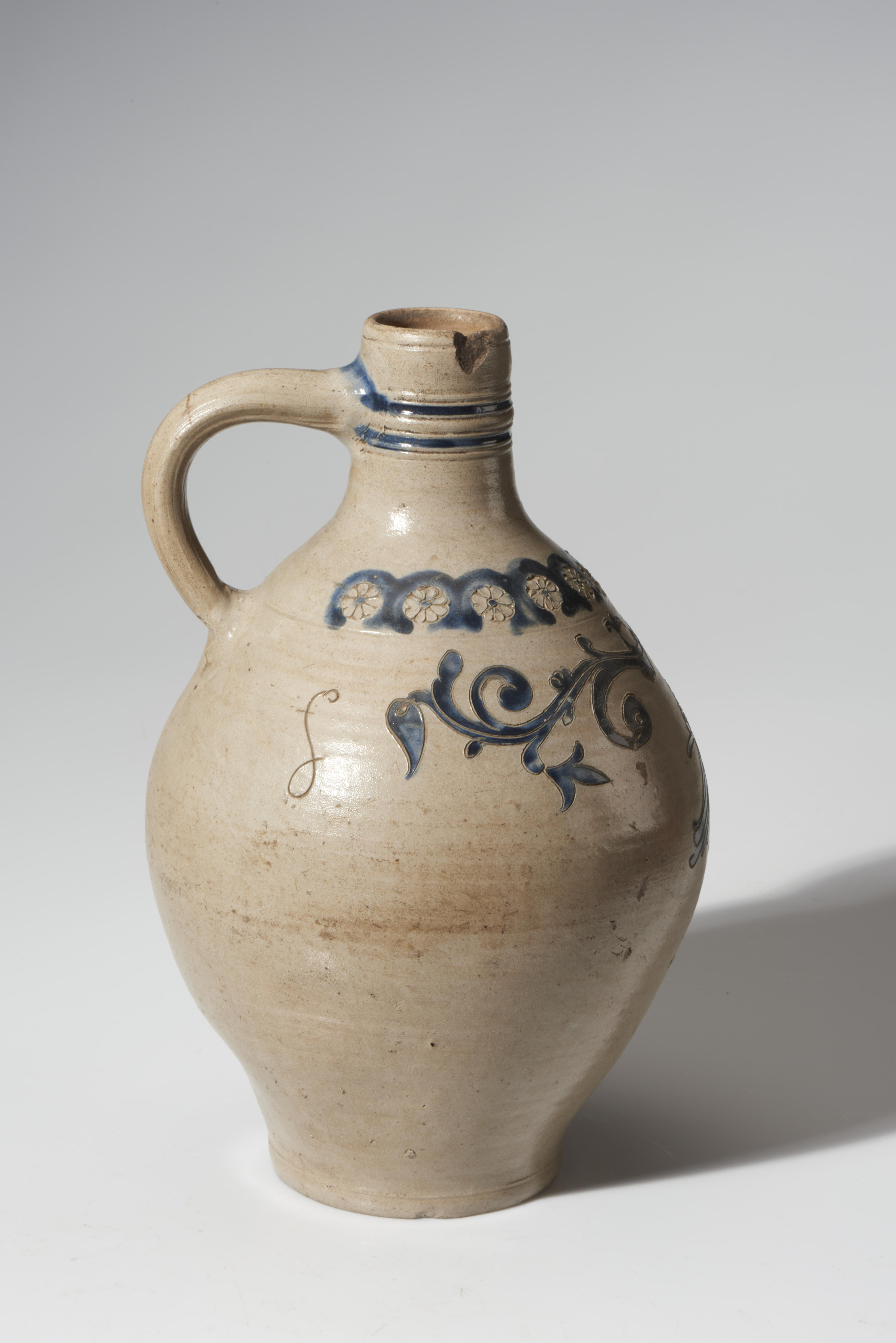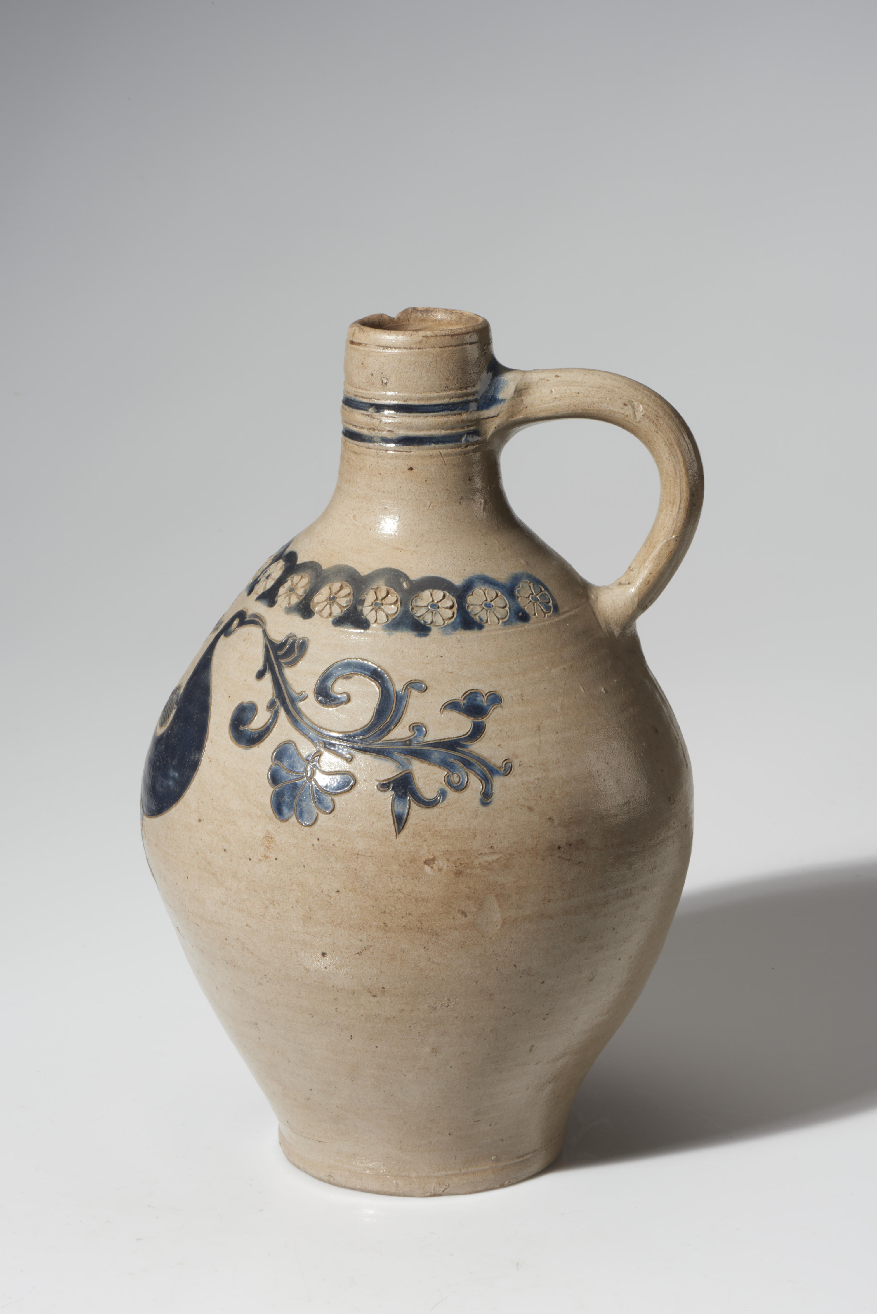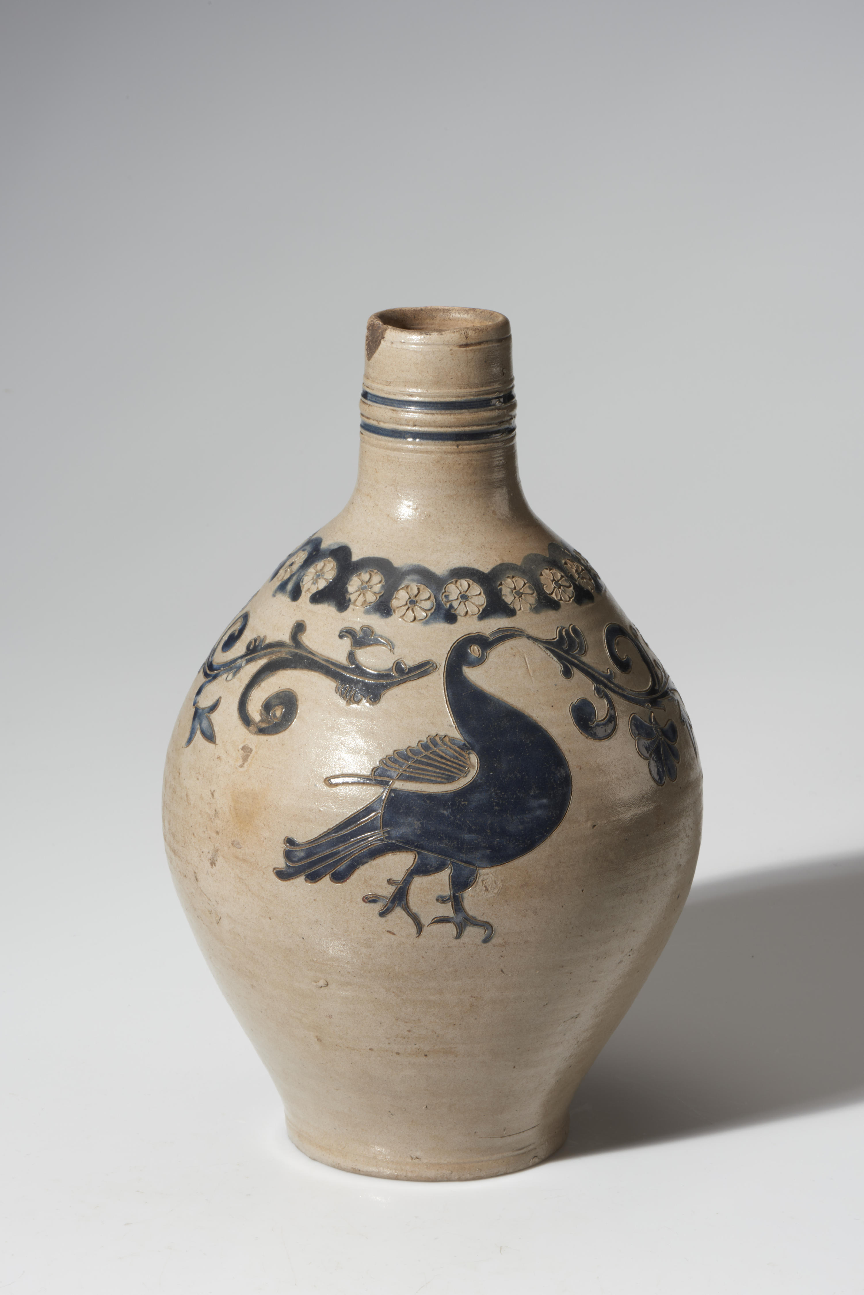 Kruik van steengoed, vervaardigd in de eerste helft van de negentiende eeuw in Westerwald. Op de kruik is een voorstelling van een vogel te zien (mogelijk een kraai of ekster), een veelvoorkomende voorstelling op Westerwalder kruiken in deze periode. De bloemmotieven en het lijnwerk zijn tevens karakteristiek voor deze regio.