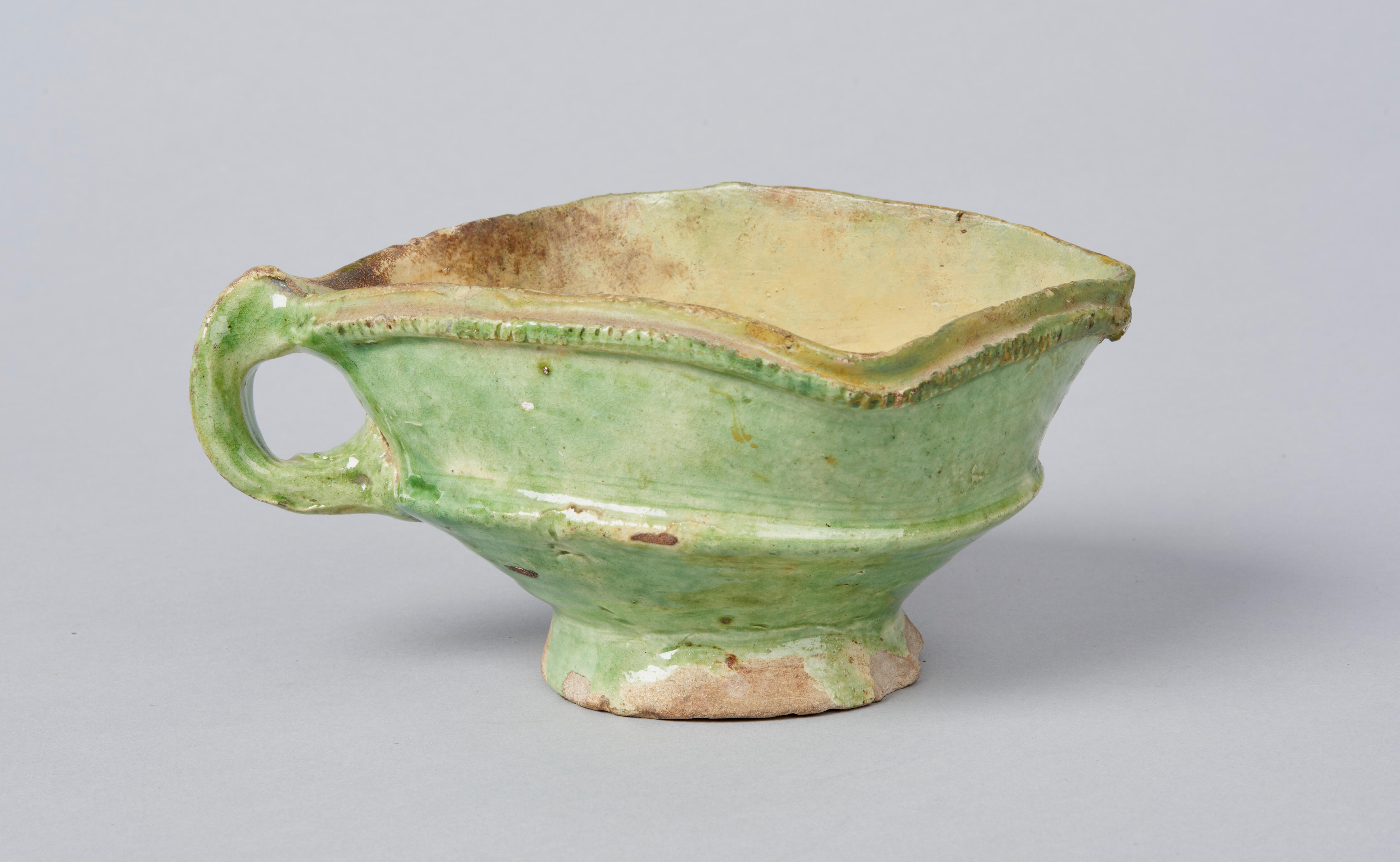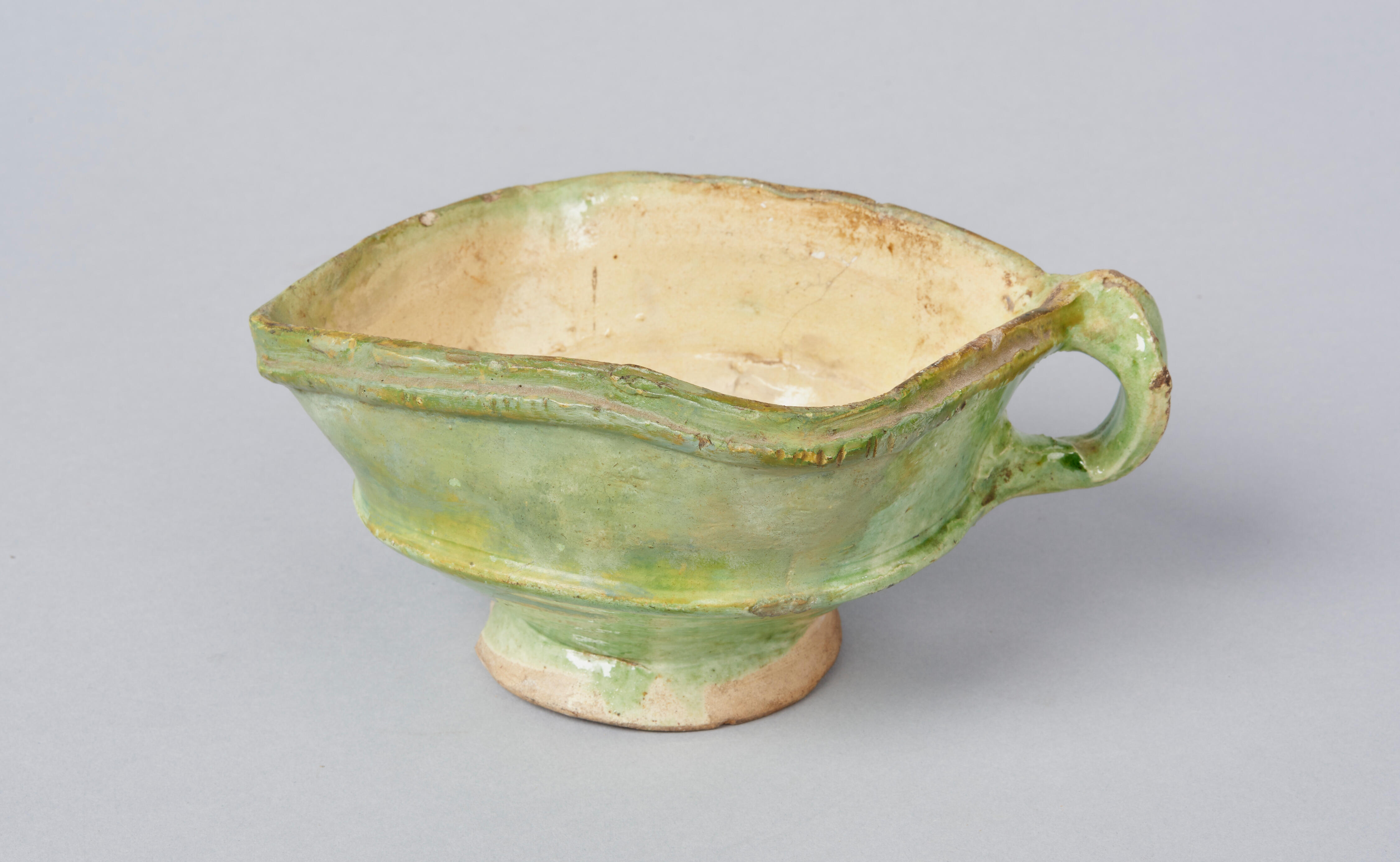 Vuurtest van witbakkende klei. De vuurtest is aan de buitenzijde groen en aan de binnenzijde geel geglazuurd.