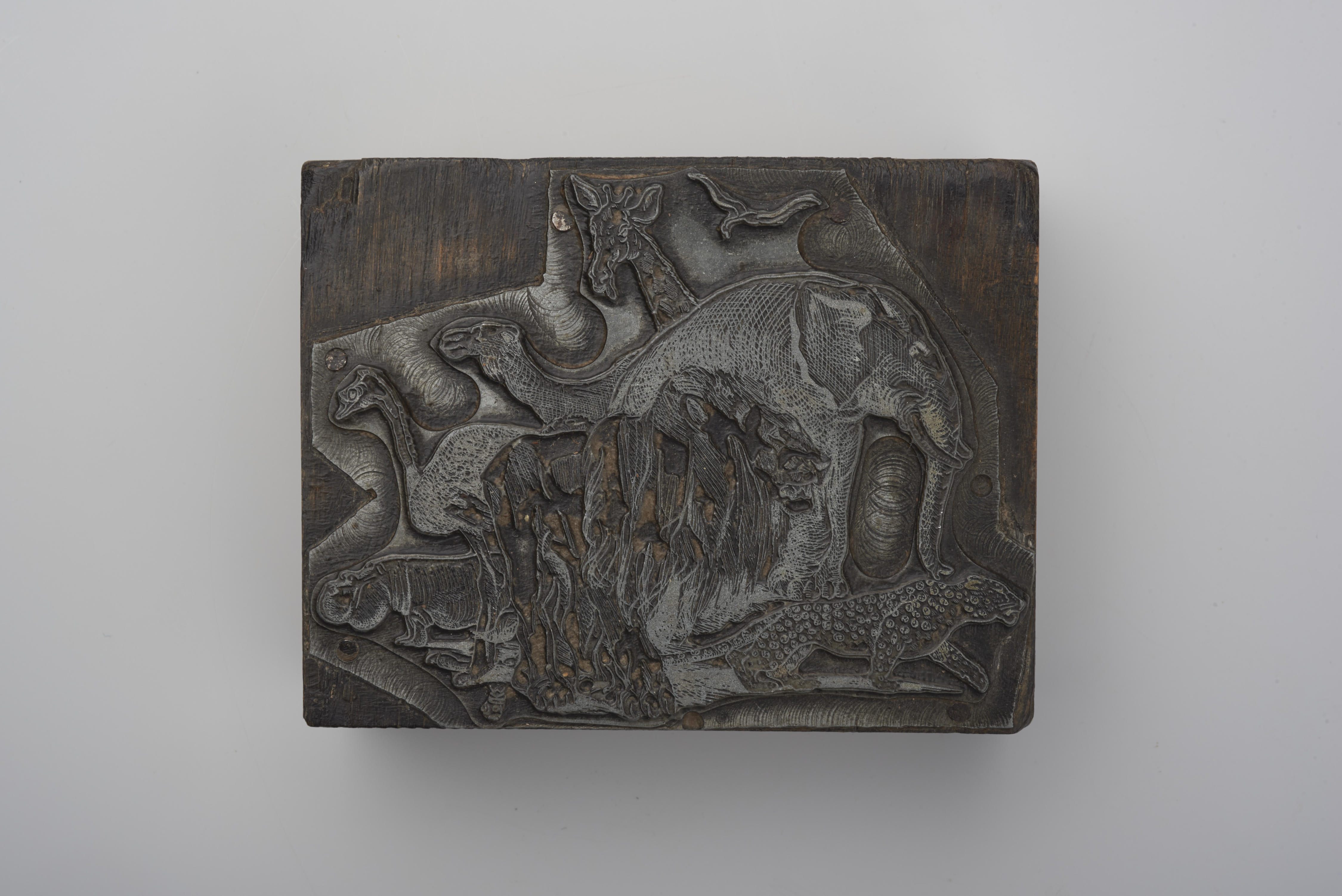 Cliché met de voorstelling van verschillende dieren, waaronder een olifant, luipaard en giraffe.