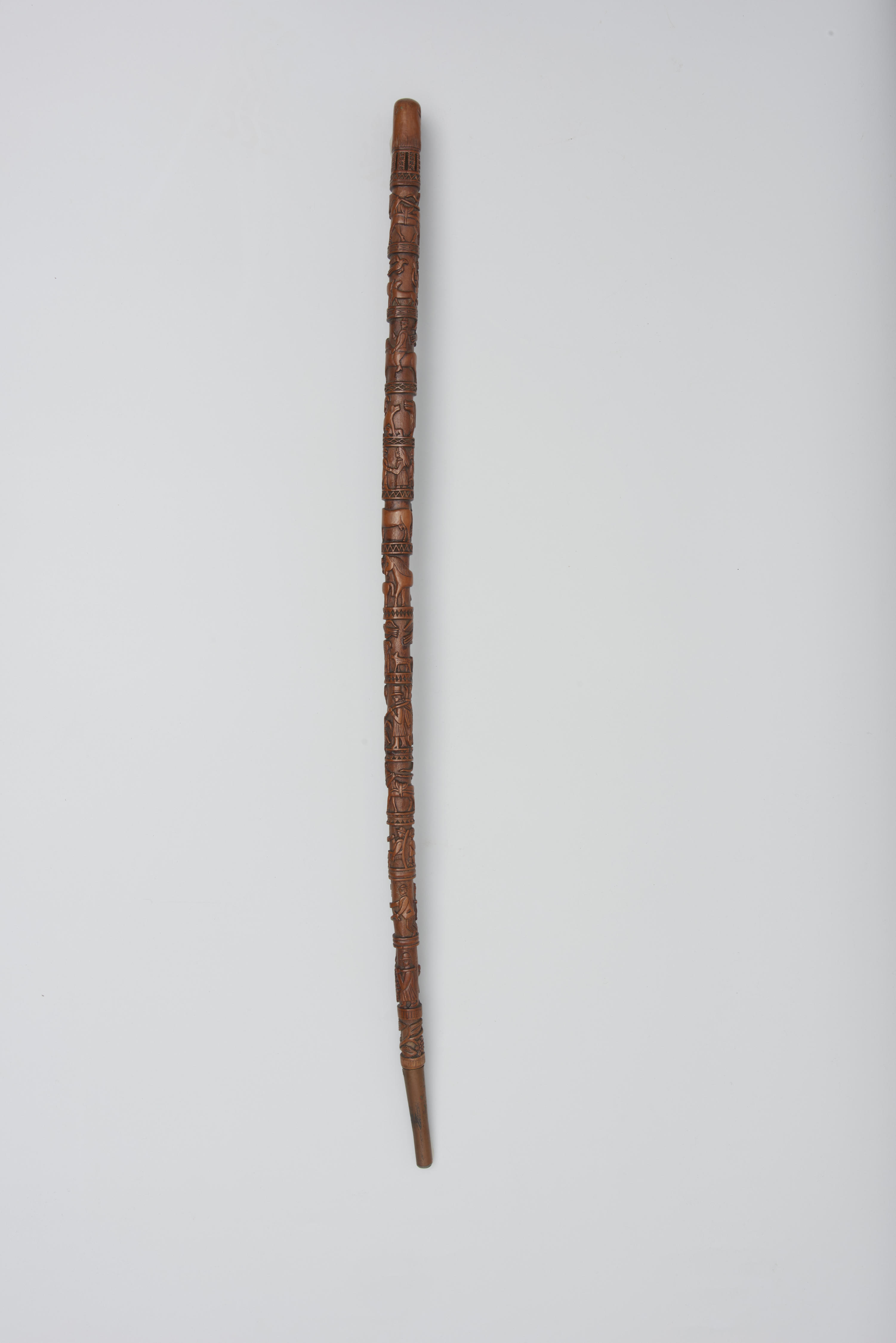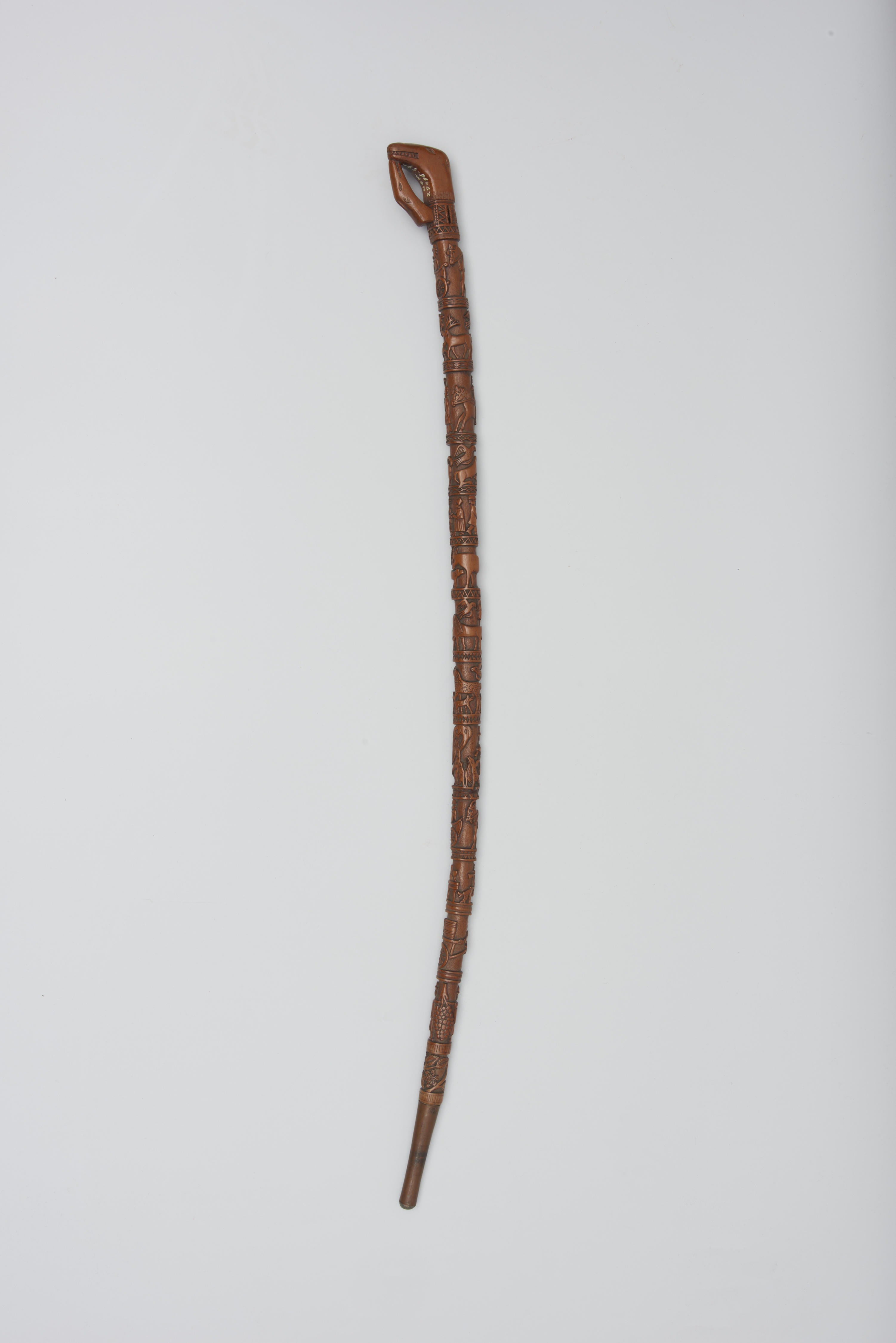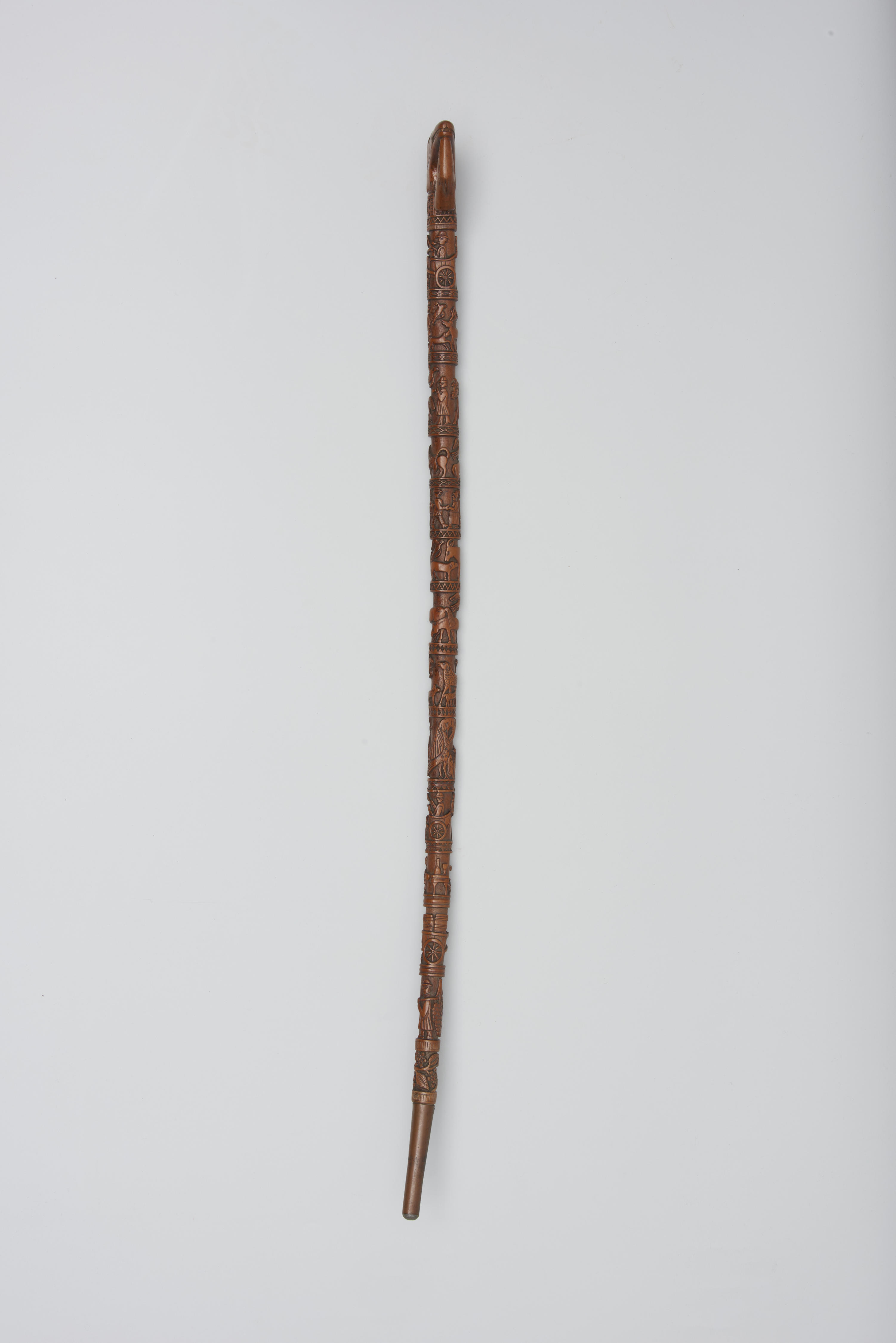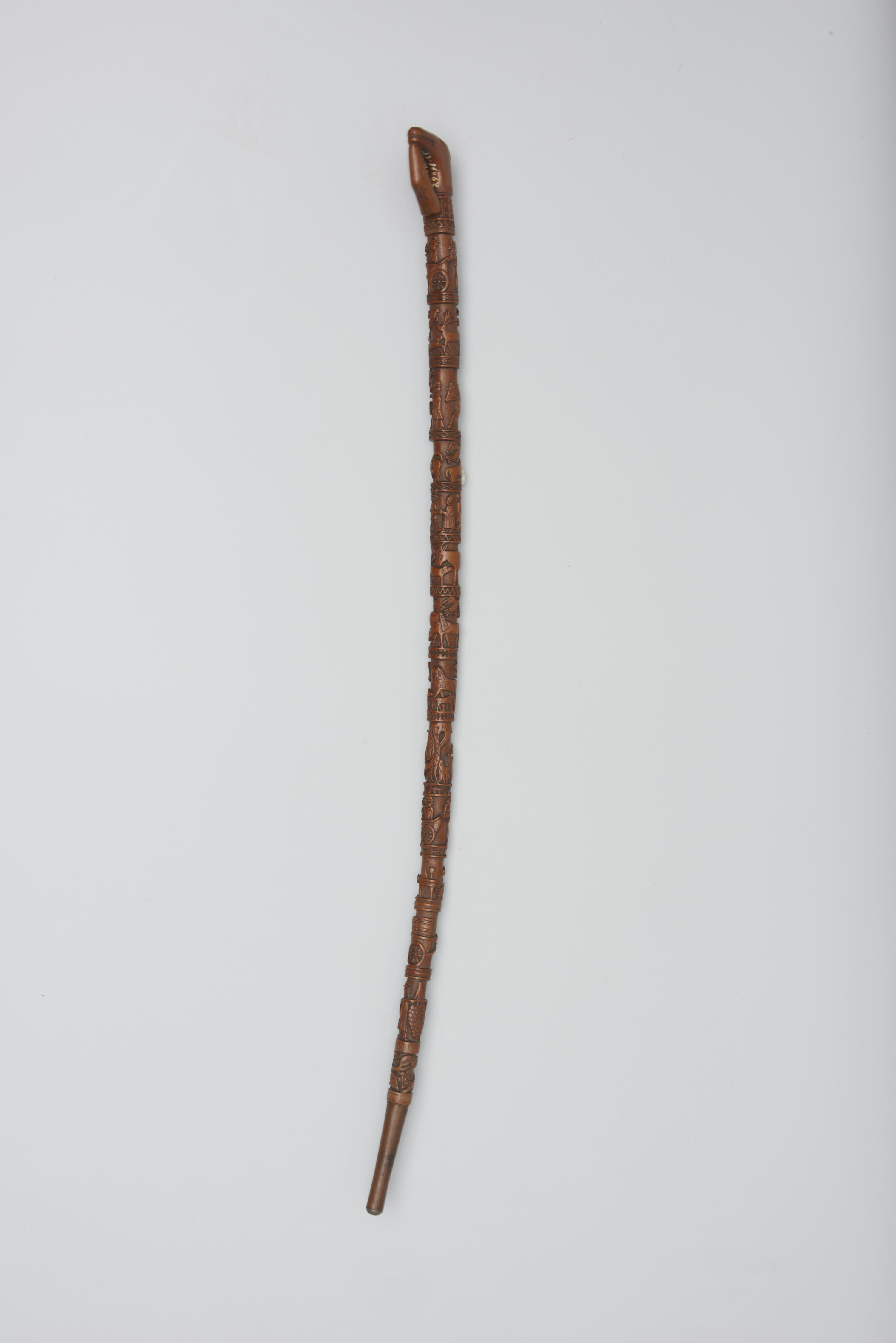 Zeeuwse wandelstok van hout. Het handvat is in de vorm van twee dierenkoppen. De stok is verder besneden met verschillende voorstellingen, zoals een jager met honden, vogels, leeuwen en een pelikaan met twee jongen. De wandelstok is vervaardigd door Pieter Puijpe in Souburg, Zeeland.