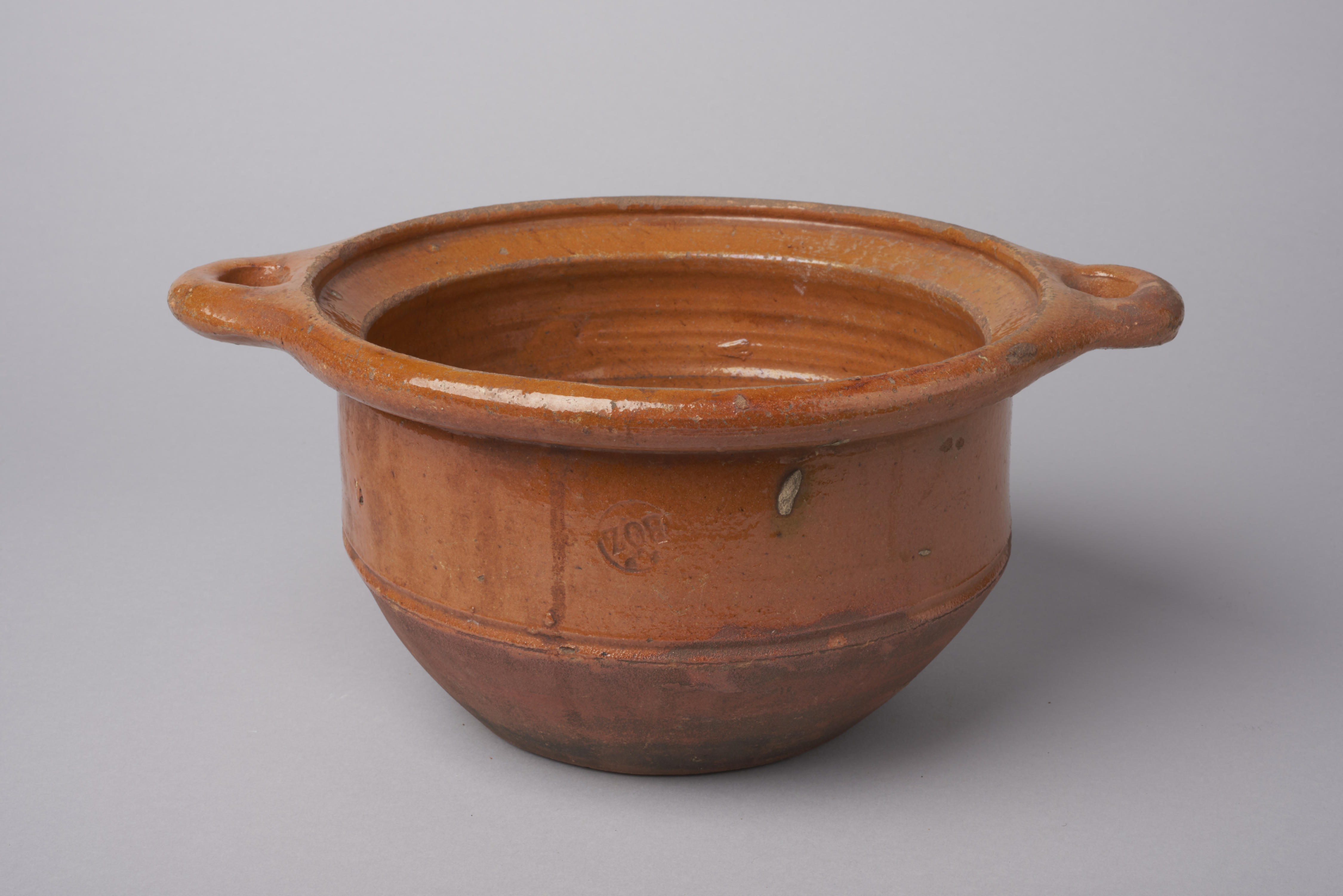 Pan met het merkteken 'BOZ' en daarboven de letters 'RJD'. De letters 'RJD' zijn de initialen van Rinse Jan Dorama, aardewerkfabrikant in Leeuwarden.