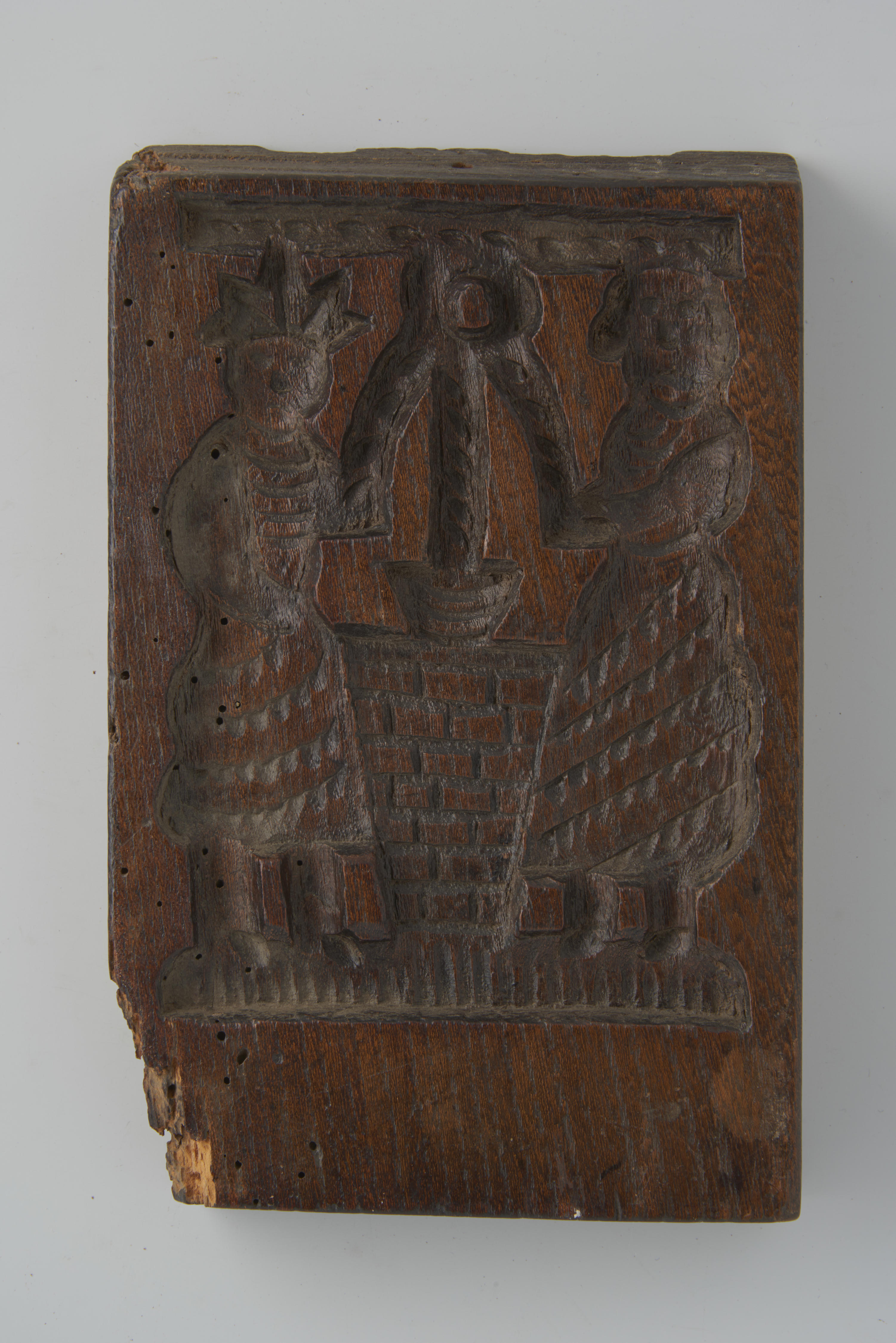Essenhouten koekplank. De plank is aan één zijde besneden met een voorstelling van twee vrouwen aan weerszijden van vermoedelijk een waterput en aan de andere zijde met een voorstelling van een gearmde vrouw en man.