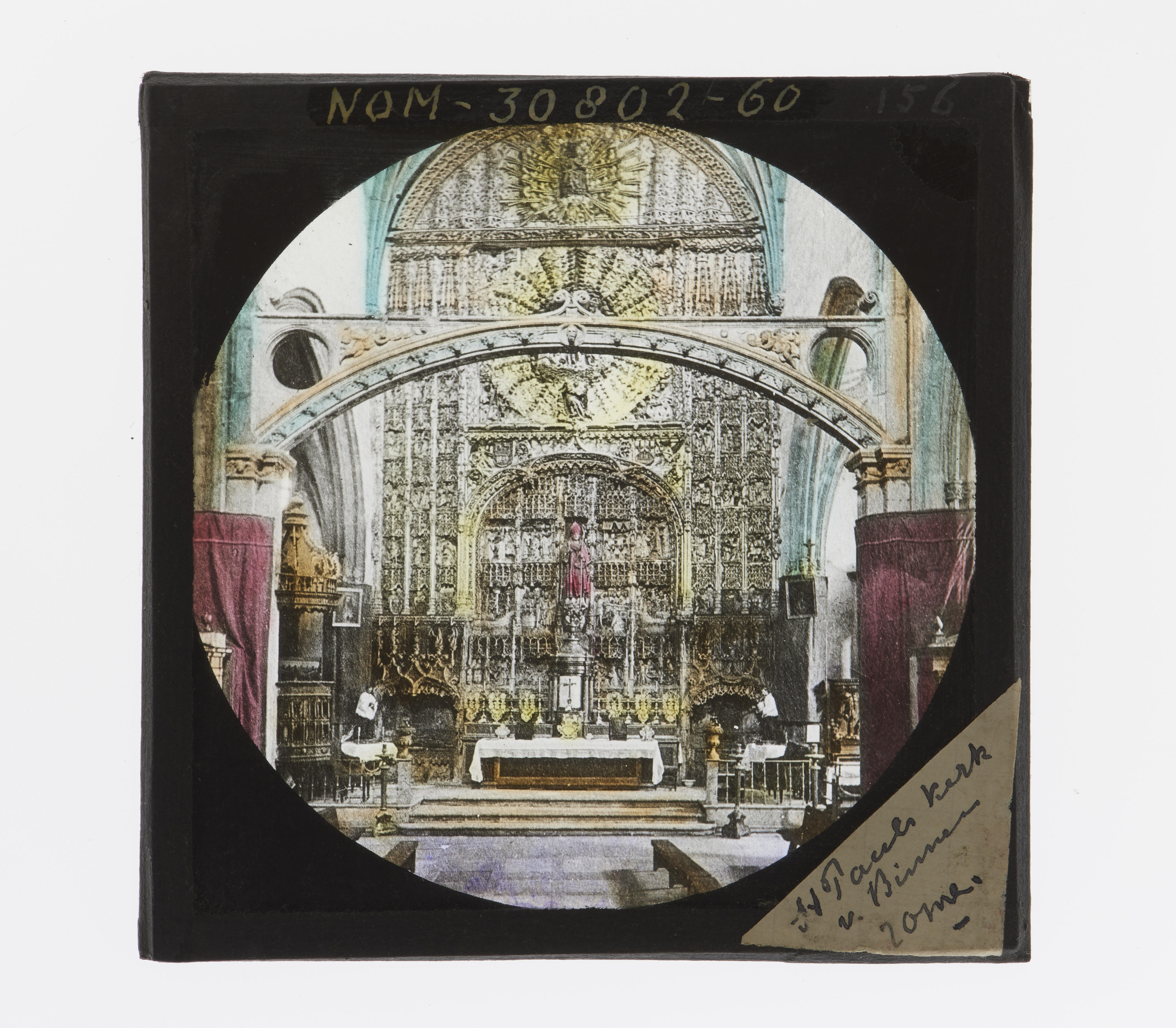 Een kerkinterieur. Het opschrift op het etiket luidt: 'St Pauls kerk v. Binnen Rome'.