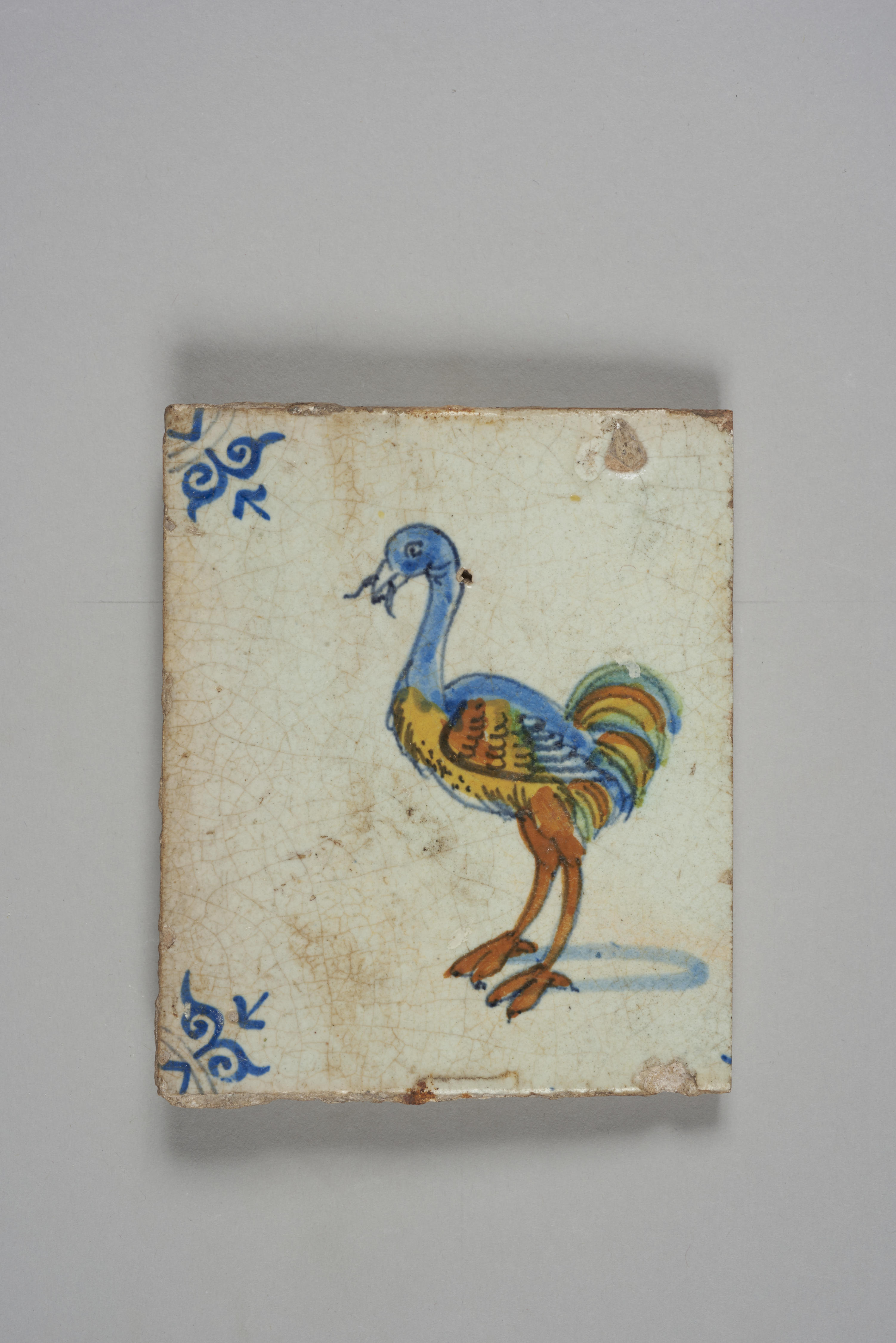 Wandtegel met een afbeelding van een vogel; veelkleurig; hoekmotief: ossenkop.