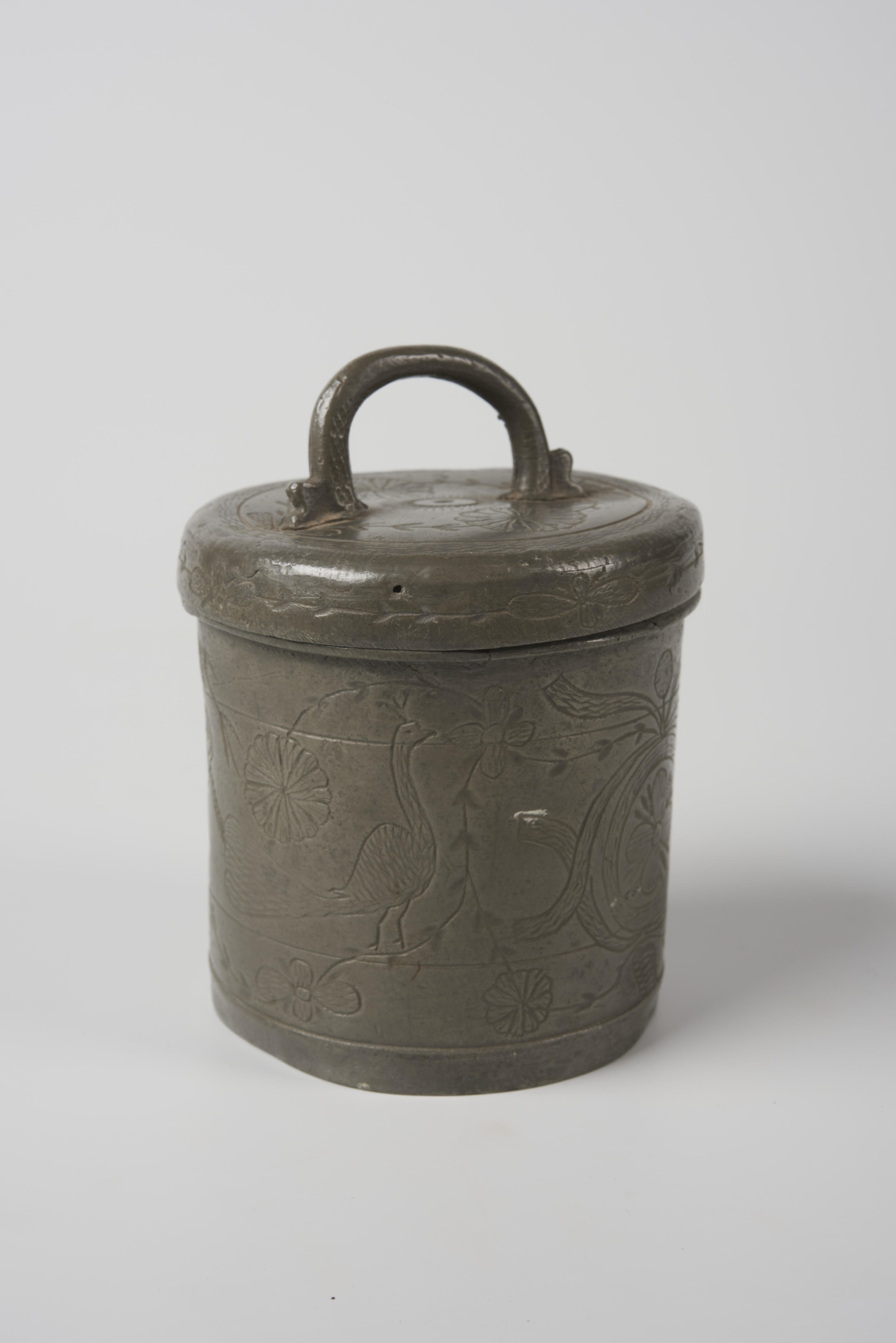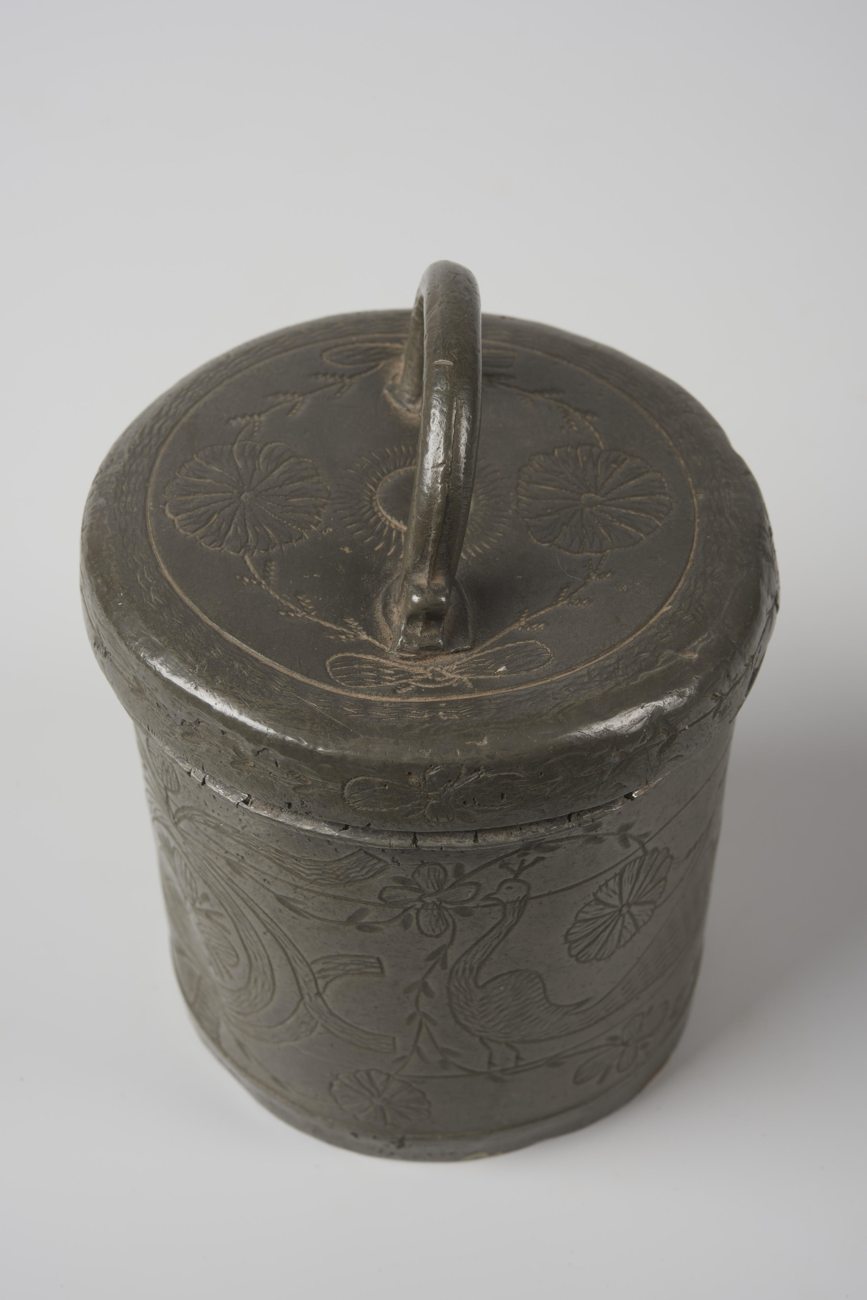 Tinnen boterdoos, gegraveerd met pauwen en bloemen. De doos is onderop gemerkt met een gekroonde roos met in het hart de letter F voor 'fijn tin', in de kroon de gietersinitialen 'IVD' en daarboven de eigenaarsinitialen 'MVDV'.