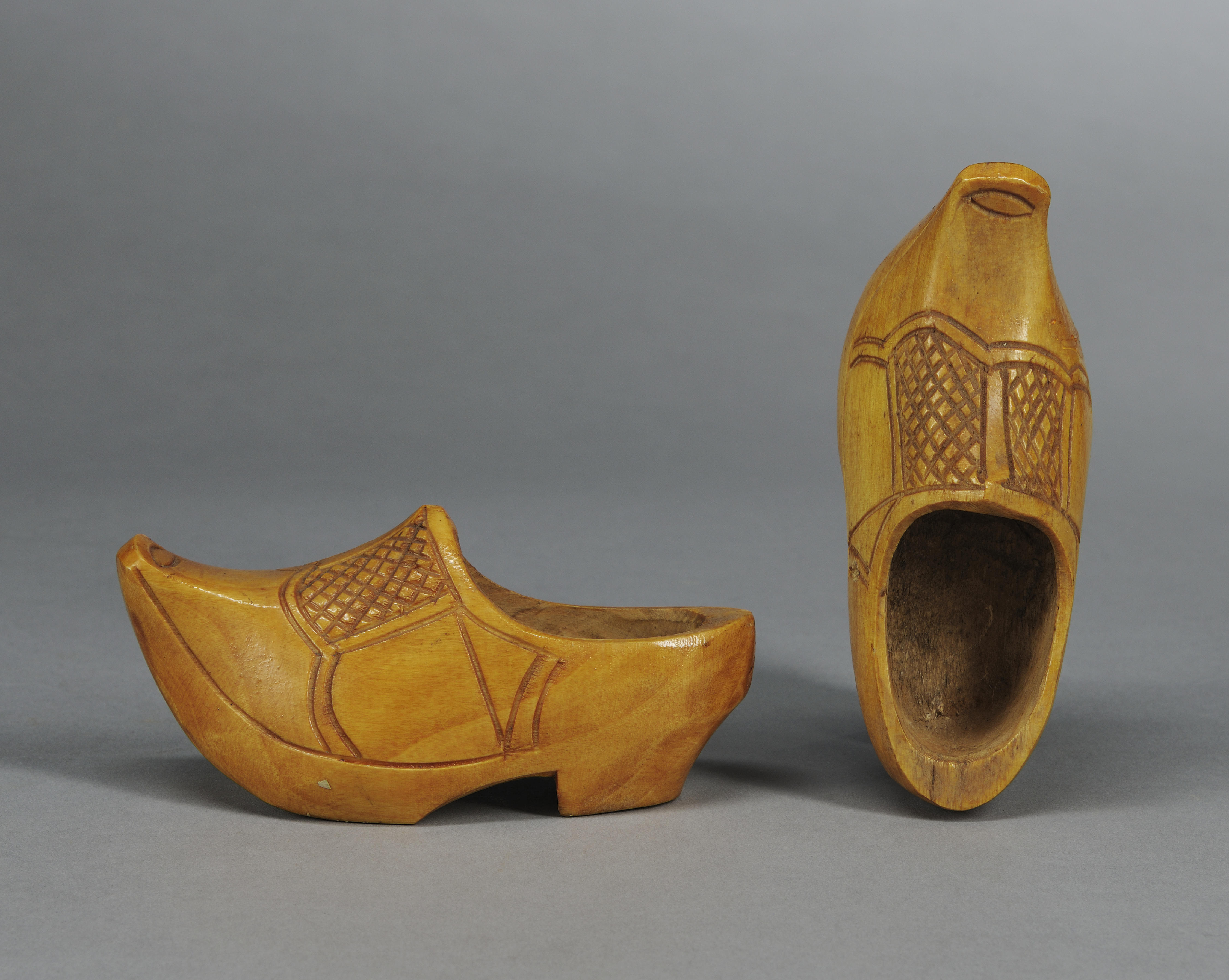 Miniatuurklomp van het model uit Tiel. De klompen zijn van gelakt wilgenhout en met de hand gemaakt door de Nijmeegse klompenmaker J. de Kroon. Ze zijn versierd met kerfsnijwerk. Klompen zijn niet uniek voor Nederland geweest, maar er wel veel gedragen. Het was het daagse schoeisel van mannen, vrouwen en kinderen. Mensen die het zich ...