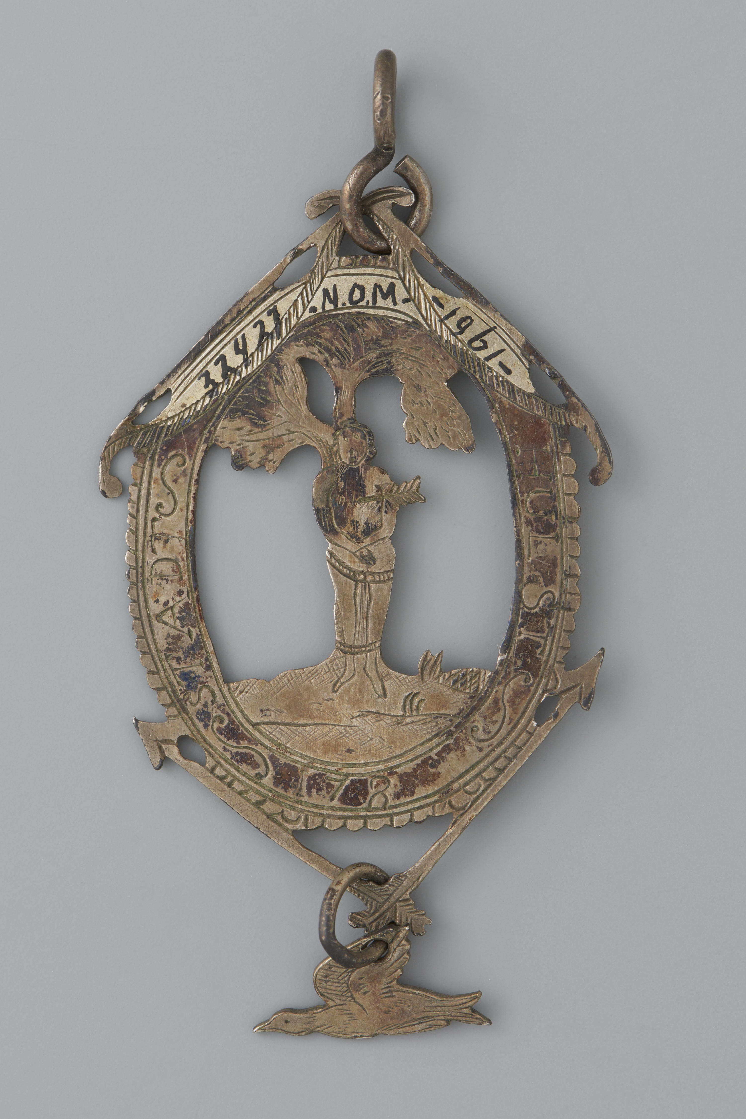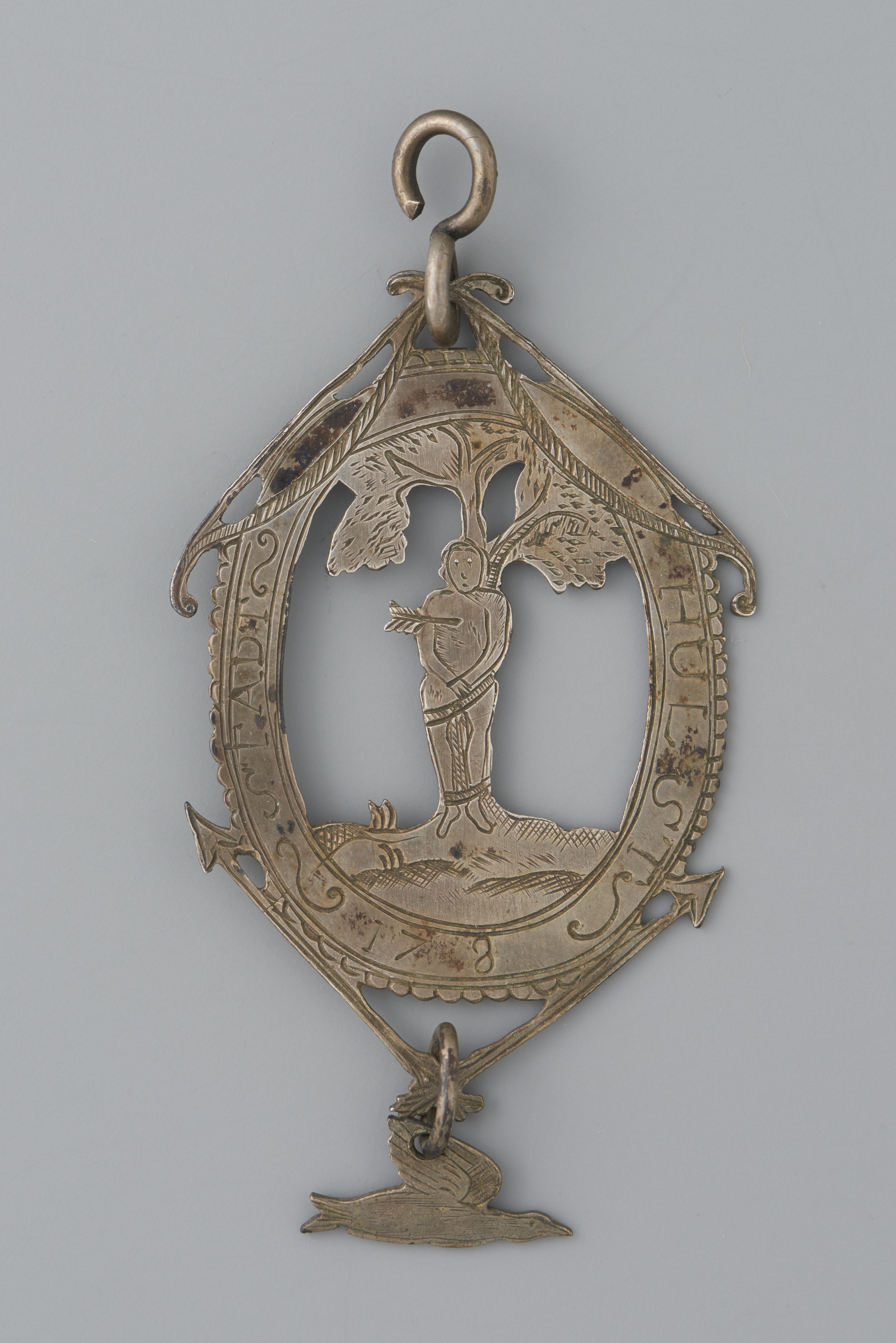 Zilveren schutterspenning uit Hulst, Zeeland. Het ovale draagteken vertoont een uitgezaagde Sint Sebastiaan aan de boom. Het gegraveerde opschrift op de omlijsting luidt: 'STADT HULST 178'. Aan de bovenzijde van de omlijsting zijn twee bogen en aan de onderzijde twee pijlen aangebracht. Aan de onderzijde hangt aan een ringetje een uitgezaagd vogelfiguurtje. De keerzijde vertoont ...
