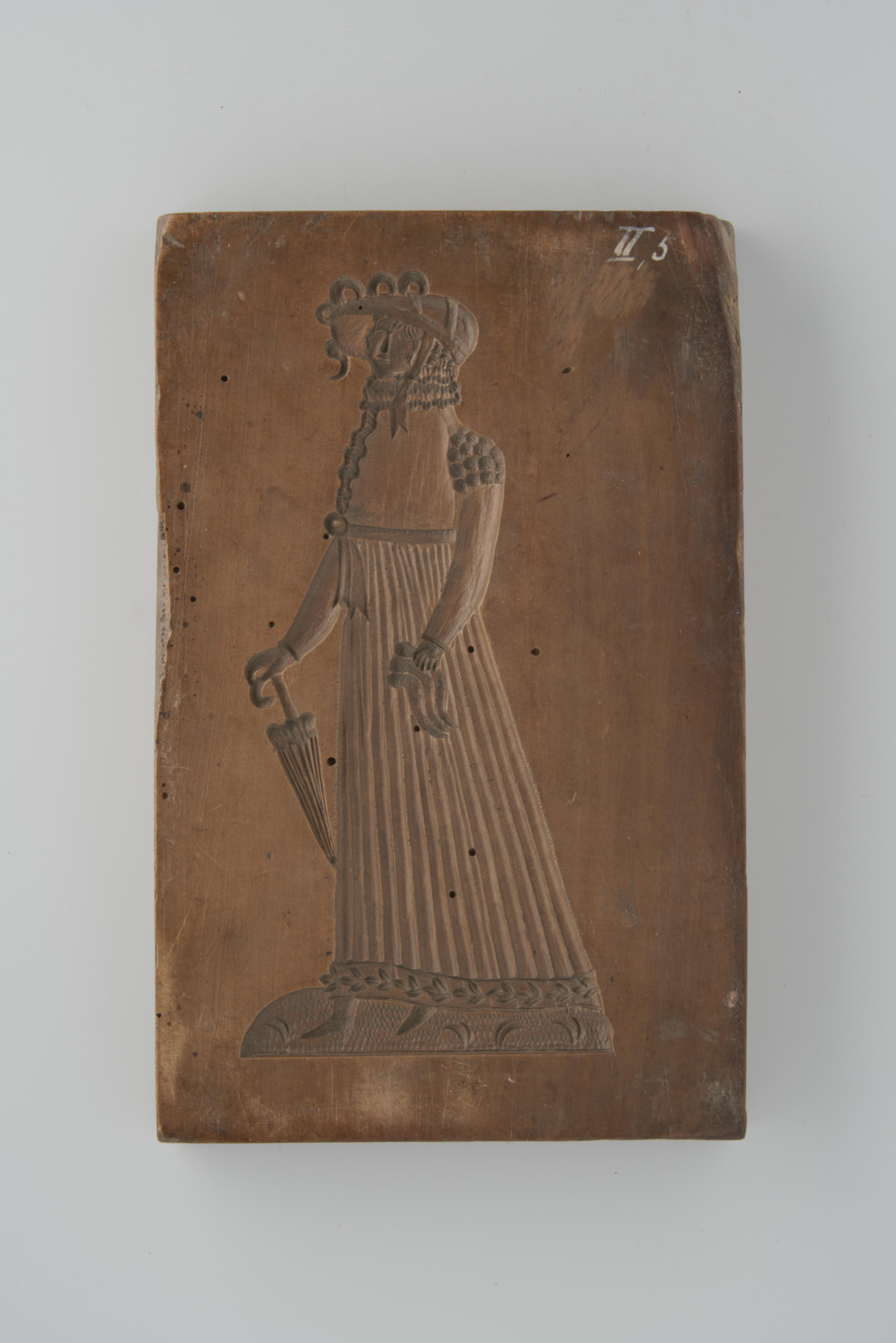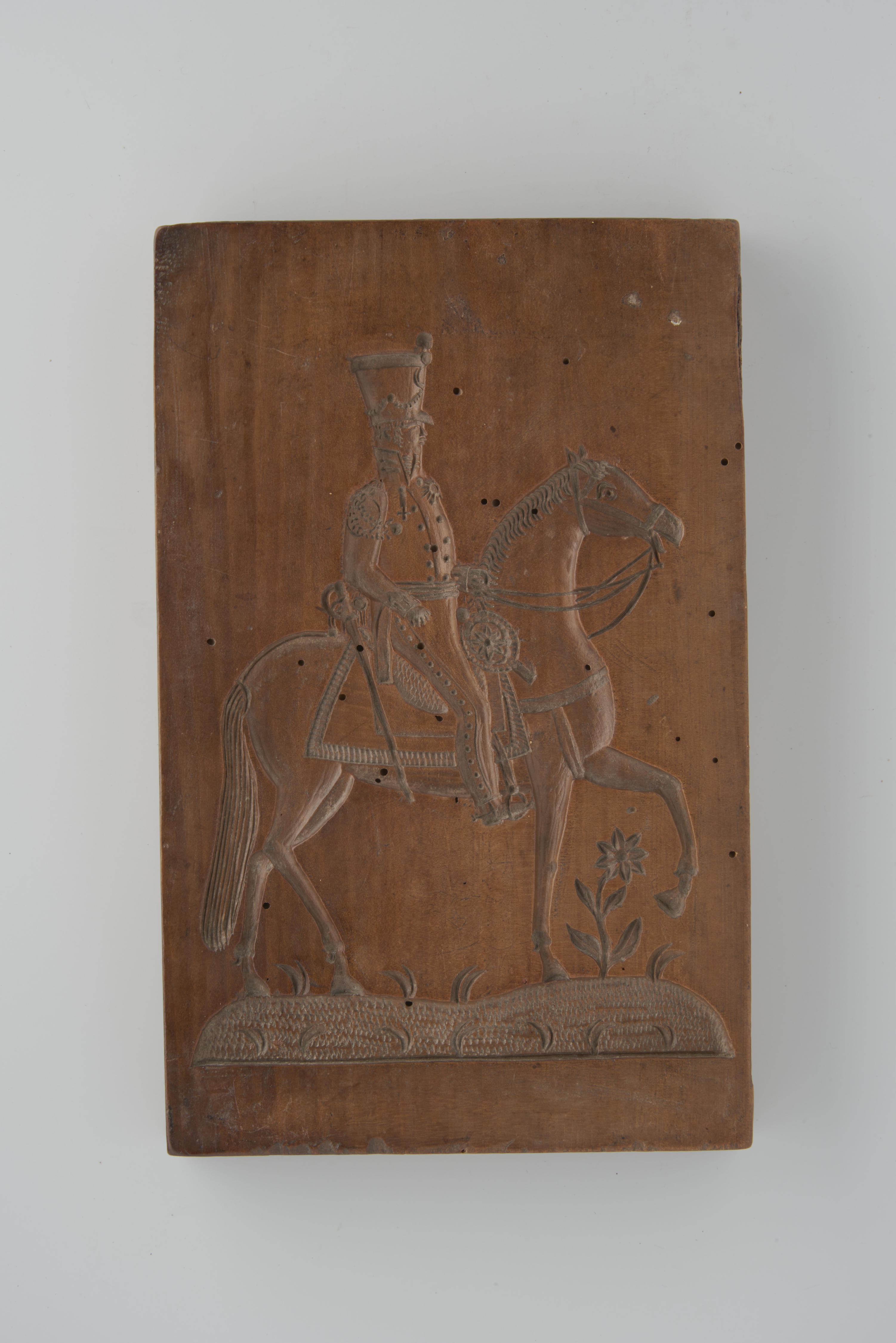 Notenhouten koekplank. De plank is aan één zijde besneden met een voorstelling van een vrouw met een parasol en aan de andere zijde met een voorstelling van een soldaat te paard.
